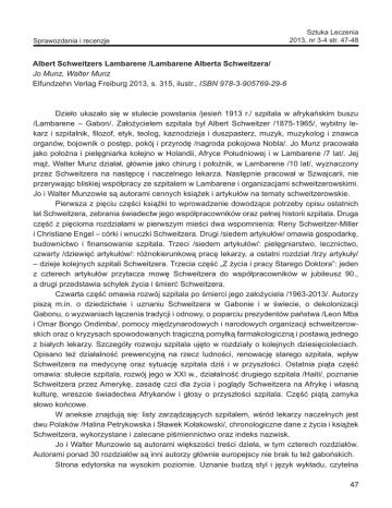 Sprawozdania i recenzje Sztuka Leczenia 2013, nr 3-4 str. 47-48 Albert Schweitzers Lambarene /Lambarene Alberta Schweitzera/ Jo Munz, Walter Munz Elfundzehn Verlag Freiburg 2013, s. 315, ilustr., ISBN 978-3-905769-29-6 Dzieło ukazało się w stulecie powstania /jesień 1913 r./ szpitala w afrykańskim buszu /Lambarene – Gabon/. Założycielem szpitala był Albert Schweitzer /1875-1965/, wybitny lekarz i szpitalnik, filozof, etyk, teolog, kaznodzieja i duszpasterz, muzyk, muzykolog i znawca organów, bojownik o postęp, pokój i przyrodę /nagroda pokojowa Nobla/. Jo Munz pracowała jako położna i pielęgniarka kolejno w Holandii, Afryce Południowej i w Lambarene /7 lat/. Jej mąż, Walter Munz działał, głównie jako chirurg i położnik, w Lambarene /10 lat/, wyznaczony przez Schweitzera na następcę i naczelnego lekarza. Następnie pracował w Szwajcarii, nie przerywając bliskiej współpracy ze szpitalem w Lambarene i organizacjami schweitzerowskimi. Jo i Walter Munzowie są autorami cennych książek i artykułów na tematy schweitzerowskie. Pierwsza z pięciu części książki to wprowadzenie dowodzące potrzeby opisu ostatnich lat Schweitzera, zebrania świadectw jego współpracowników oraz pełnej historii szpitala. Druga część z pięcioma rozdziałami w pierwszym mieści dwa wspomnienia: Reny Schweitzer-Miller i Christiane Engel – córki i wnuczki Schweitzera. Drugi /siedem artykułów/ omawia gospodarkę, budownictwo i finansowanie szpitala. Trzeci /siedem artykułów/: pielęgniarstwo, lecznictwo, czwarty /dziewięć artykułów/: różnokierunkową pracę lekarzy, a ostatni rozdział /trzy artykuły/ – dzieje kolejnych szpitali Schweitzera. Trzecia część „Z życia i pracy Starego Doktora”: jeden z czterech artykułów przytacza mowę Schweitzera do współpracowników w jubileusz 90., a drugi przedstawia schyłek życia i śmierć Schweitzera. Czwarta część omawia rozwój szpitala po śmierci jego założyciela /1963-2013/. Autorzy piszą m.in. o dziedzictwie i uznaniu Schweitzera w Gabonie i w świecie, o dekolonizacji Gabonu, o wyzwaniach łączenia tradycji i odnowy, o poparciu prezydentów państwa /Leon Mba i Omar Bongo Ondimba/, pomocy międzynarodowych i narodowych organizacji schweitzerowskich oraz o kryzysach spowodowanych tragiczną pomyłką farmakologiczną i postawą jednego z białych lekarzy. Szczegóły rozwoju szpitala ujęto w rozdziały o kolejnych dziesięcioleciach. Opisano też działalność prewencyjną na rzecz ludności, renowację starego szpitala, wpływ Schweitzera na medycynę oraz sytuację szpitala dziś i w przyszłości. Ostatnia piąta część omawia: stulecie szpitala, rozwój jego w XXI w., działalność drugiego szpitala /Haiti/, poznanie Schweitzera przez Amerykę, zasadę czci dla życia i poglądy Schweitzera na Afrykę i własną kulturę, wreszcie świadectwa Afrykanów i głosy o przyszłości szpitala. Część piątą zamyka słowo końcowe. W aneksie znajdują się: listy zarządzających szpitalem, wśród lekarzy naczelnych jest dwu Polaków /Halina Petrykowska i Sławek Kołakowski/, chronologiczne dane z życia i książek Schweitzera, wykorzystane i zalecane piśmiennictwo oraz indeks nazwisk. Jo i Walter Munzowie są autorami większości treści dzieła, w tym czterech rozdziałów. Autorami ponad 30 rozdziałów są inni autorzy głównie europejscy nie brak tu też gabońskich. Strona edytorska na wysokim poziomie. Uznanie budzą styl i język wykładu, czytelna 47 Sprawozdania i recenzje dyspozycja treści, dobry papier i wyraźna czcionka. Szczególnym bogactwem dzieła są bardzo liczne /blisko 170 !/ czarno-białe ilustracje, głównie fotografie Schweitzera, jego współpracowników, pacjentów i samego szpitala. Okładka półsztywna kartonowa ze skrzydełkami. Książkę należy polecić każdemu przyszłemu i obecnemu pracownikowi medycyny i ochrony zdrowia. Szczególnie zainteresowanym osiągnięciami i spuścizną Alberta Schweitzera w różnych dziedzinach jego działalności. prof. Henryk Gaertner - Kraków 48