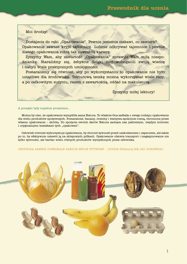 Przewodnik dla ucznia Moi drodzy! Dostajecie do r´ki „Opakowanie”. Pewnie jesteÊcie ciekawi, co zawiera? Opakowanie zawsze kryje tajemnic´. Lubicie odkrywaç tajemnice i pewnie dlatego opakowania robià tak zawrotnà karier´. ˚yczymy Wam, aby zawartoÊç „Opakowania” sprawi∏a Wam mi∏à niespodziank´. StaraliÊmy si´, ˝ebyÊcie dzi´ki niej wzbogacili swojà wiedz´ i nabyli wiele praktycznych umiej´tnoÊci. PostaraliÊmy si´ równie˝, aby po wykorzystaniu to opakowanie nie by∏o ucià˝liwe dla Êrodowiska. Tekturowà teczk´ mo˝na wykorzystaç wiele razy, a po ca∏kowitym zu˝yciu, razem z zawartoÊcià, oddaç na makulatur´. ˚yczymy mi∏ej lektury! A poczàtki by∏y zupe∏nie prozaiczne... Mo˝na by rzec, ˝e opakowanie wymyÊli∏a sama Natura. To w∏aÊnie Ona zadba∏a o swego rodzaju opakowanie dla wielu produktów spo˝ywczych. Pomaraƒcze, banany, orzechy i warzywa spokojnie rosnà, chronione przez w∏asne opakowanie – skórk´. Do spo˝ycia swoich darów Natura zach´ca nas jaskrawym, ciep∏ym kolorem i oryginalnymi kszta∏tami tych „opakowaƒ”. Cz∏owiek równie˝ wykorzystuje opakowania, by chroniç ˝ywnoÊç przed uszkodzeniem i zepsuciem, ale tak˝e po to, by efektywnie ustawiç jà na sklepowych pó∏kach. Opakowanie u∏atwia transport i magazynowanie nie tylko ˝ywnoÊci, ale bardzo wielu ró˝nych produktów wymyÊlonych przez cz∏owieka. PRZYRODA ZAWSZE DOSKONALE PAKUJE SWOJE WYTWORY – LUDZIE STARAJÑ SI¢ JEJ DORÓWNAå. 1 Przewodnik dla ucznia I tak opakowania towarzyszà ludziom od dawna... Ludzie pierwotni prawdopodobnie zawijali zdobytà ˝ywnoÊç w liÊcie. Potem szyli skórzane worki i pletli kosze. Znacznie póêniej zacz´li przechowywaç swoje skarby w bogato zdobionych drewnianych skrzyniach i u˝ywali naczyƒ z bràzu, mosiàdzu, a nawet z∏ota. Biedniejsi musieli zadowoliç si´ glinianym dzbanem, kamiennym garnkiem i drewnianà beczkà. Zawsze, niezale˝nie od pozycji spo∏ecznej, ludzie starali si´ zaspokoiç nie tylko rzeczywiste potrzeby, ale sprostaç równie˝ tym bardziej wymyÊlnym. Ozdabiali wi´c swoje pierwsze „opakowania’’, nadawali im przedzi-wne kszta∏ty i kolory. Dzisiaj opakowania nadal spe∏niajà te funkcje, a ich producenci próbujà zaspokoiç zmieniajàce si´ potrzeby konsumentów. Zmieniajà si´ one w zale˝noÊci od wielu warunków: od zaspokajania podstawowych potrzeb, np. g∏odu (zabezpieczenie ˝ywnoÊci przed zepsuciem i drobnoustrojami), poprzez ochron´ naszego zdrowia, po spe∏nianie marzeƒ (luksusowe perfumy, pude∏ko ulubionych czekoladek). 2 Przewodnik dla ucznia CZYM JEST OPAKOWANIE? NajproÊciej mówiàc, opakowanie jest to wyrób, który: ❏ ochrania inny wyrób przed wp∏ywem czynników zewn´trznych lub ochrania otoczenie przed niepo˝àdanym wp∏ywem produktu opakowanego, ❏ umo˝liwia i u∏atwia transport produktów, ❏ u∏atwia sprzeda˝, ❏ informuje o w∏aÊciwoÊciach produktu. Wspó∏czesne opakowania spe∏niajà wiele funkcji, dlatego powinny byç: trwa∏e, ale wykonane w sposób materia∏o – i energooszcz´dny, lekkie, ale zapewniajàce maksymalnà ochron´ produktom, dopasowane rozmiarami do potrzeb konsumenta, i Êrodków transportu, wykonane z materia∏ów, które mo˝na ponownie wykorzystaç (dotyczy to równie˝ elementów dodatkowych: kapsle, etykiety, zakr´tki), ❏ estetyczne; jednoczeÊnie powinny zawieraç pe∏nà informacj´ o produkcie (w∏aÊciwoÊci, sposób u˝ycia, termin przydatnoÊci do spo˝ycia, waga, cena i inne) oraz symbol materia∏u, z jakiego zosta∏y wykonane, a tak˝e informacje o sposobie ich utylizacji, czyli co z nim zrobiç, aby po wykorzystaniu nie szkodzi∏y Êrodowisku. ❏ ❏ ❏ ❏ Opakowania, z którymi spotykamy si´ najcz´Êciej, wykonane sà z papieru, tektury, szk∏a, metalu oraz tworzyw sztucznych. 3 Przewodnik dla ucznia OPAKOWANIE POD LUPÑ Spójrzmy na opakowania okiem: Towaroznawcy, czyli zwrócimy uwag´ na w∏aÊciwoÊci ochronne opakowaƒ Nowe technologie poprzez zmian´ konstrukcji opakowaƒ, zastosowanie ulepszonych materia∏ów pozwalajà uzyskaç znaczne obni˝enie ich masy i jednoczesne mniejsze zu˝ycie materia∏ów (m. in. dzi´ki zastosowaniu po∏àczenia ró˝nych materia∏ów). Nowoczesne materia∏y sà bardzo cienkie, a jednoczeÊnie bardzo wytrzyma∏e. Opakowanie mo˝e mieç wp∏yw na jakoÊç pakowanego produktu. Handlowca i specjalisty od marketingu, czyli ustalimy, jakie znaczenie majà opakowania dla promocji sprzedawanych towarów Opakowania powinny u∏atwiaç transport, zajmowaç niewiele miejsca w magazynach i u∏atwiaç obs∏ug´ klienta. W sprzeda˝y samoobs∏ugowej opakowanie przyjmuje rol´ sprzedawcy, przyciàga wzrok, czyli powinno zareklamowaç produkt. Nie ulegaj jednak z∏udzeniom, opakowanie nie tworzy produktu, ono go jedynie oferuje. Ekonomisty, czyli kiedy produkcja opakowania Z punktu widzenia ekonomisty cena opakowania, czyli koszt materia∏ów i produkcji, jest op∏acalna a tak˝e utylizacji po wykorzystaniu, powinna byç dostosowana do wartoÊci produktu, który opakowanie ochrania. „Opakowanie powinno oszcz´dzaç znacznie wi´cej, ni˝ jest samo warte” (dr Ruben Rausing) . Ekologa, czyli ustalimy, czy i w jaki sposób zu˝yte opakowania zagra˝ajà Z punktu widzenia ekologów wa˝ne jest zarówno zmniejszenie iloÊci zu˝ytych opakowaƒ (patrz wy˝ej) , jak i to, czy opakowanie zosta∏o wykonane z materia∏ów ∏atwo podlegajàcych przeróbce i czy podczas utylizacji nie wydzielajà si´ szkodliwe substancje, natomiast daje si´ odzyskaç energi´. Szukaj takich informacji o opakowaniach. Dodatkowe oznakowanie mo˝e przestrzegaç przed wyrzuceniem toksycznych produktów (np. baterii) do Êmieci. 4 Przewodnik dla ucznia RODZAJ OPAKOWANIA A WP¸YW NA ÂRODOWISKO Szk∏o Szk∏o wyrabiane jest przede wszystkim z piasku. Po wydobyciu go z ziemi pozostajà w krajobrazie Êlady w postaci wyrobisk. Ale szklane opakowania
