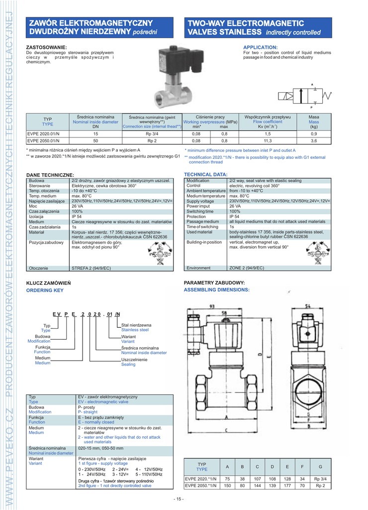 PRODUCENT ZAWORÓW ELEKTROMAGNETYCZNYCH I TECHNIKI REGULACYJNEJ W W W. P E V E K O . C Z ZAWÓR ELEKTROMAGNETYCZNY DWUDRO¯NY NIERDZEWNY poœredni TWO-WAY ELECTROMAGNETIC VALVES STAINLESS indirectly controlled ZASTOSOWANIE: APPLICATION: For two - position control of liquid mediums passage in food and chemical industry Do dwustopniowego sterowania przep³ywem cieczy w przemyœle spo¿ywczym i chemicznym. TYP TYPE Œrednica nominalna Nominal inside diameter DN Ciœnienie pracy Œrednica nominalna (gwint wewnêtrzny**) Working overpressure (MPa) Connection size (internal thead**) min* max Wspó³czynnik przep³ywu Flow coefficient 3 -1 Kv (m .h ) Masa Mass (kg) EVPE 2020.01/N 15 Rp 3/4 0,08 0,8 1,5 0,9 EVPE 2050.01/N 50 Rp 2 0,08 0,8 11,3 3,6 * minimalna ró¿nica ciœnieñ miêdzy wejœciem P a wyjœciem A * minimum difference pressure between inlet P and outlet A ** w zaworze 2020.*1/N istnieje mo¿liwoœæ zastosowania gwintu zewnêtrznego G1 ** modification 2020.*1/N - there is possibility to equip also with G1 external connection thread TECHNICAL DATA: DANE TECHNICZNE: Budowa Sterowanie Temp. otoczenia Temp. medium Napiêcie zasilaj¹ce Moc Czas za³¹czenia Izolacja Medium Czas zadzia³ania Materia³ Pozycja zabudowy Otoczenie 2/2 dro¿ny, zawór gniazdowy z elastycznym uszczel. Elektryczne, cewka obrotowa 360° -10 do +40°C max. 80°C 230V/50Hz,110V/50Hz,24V/50Hz,12V/50Hz,24V=,12V= 26 VA 100% IP 54 Ciecze nieagresywne w stosunku do zast. materia³ów 1s Korpus- stal nierdz. 17 356; czêœci wewnêtrznenierdz.,uszczel.- chlorobutylokauczuk ÈSN 622636 Elektromagnesem do góry, max. odchy³ od pionu 90° Modification Control Ambient temperature Medium temperature Supply voltage Power imput Switching time Protection Passage medium Time of switching Used material STREFA 2 (94/9/EC) Environment Building-in position ORDERING KEY Typ Type Budowa Modification Funkcja Function Medium Medium ZONE 2 (94/9/EC) PARAMETRY ZABUDOWY: ASSEMBLING DIMENSIONS: KLUCZ ZAMÓWIEÑ EV P E 2/2 way, seat valve with elastic sealing electric, revolving coil 360° from -10 to +40°C max. 80°C 230V/50Hz,110V/50Hz,24V/50Hz,12V/50Hz,24V=,12V= 26 VA 100% IP 54 all liquid mediums that do not attack used materials 1s body-stainless 17 356, inside parts-stainless steel, sealing-chlorine butyl rubber ÈSN 622636 vertical, electromagnet up, max. diversion from vertical 90° 2 0 2 0 . 01 /N Stal nierdzewna Stainless steel Wariant Variant Œrednica nominalna Nominal inside diameter Uszczelnienie Sealing Typ Type Budowa Modification Funkcja Function Medium Medium EV - zawór elektromagnetyczny EV - electromagnetic valve P- prosty P- straight E - bez pr¹du zamkniêty E - normally closed 2 - ciecze nieagresywne w stosunku do zast. materia³ów 2 - water and other liquids that do not attack used materials Œrednica nominalna Nominal inside diameter Wariant Variant 020-15 mm, 050-50 mm Pierwsza cyfra - napiêcie zasilaj¹ce 1 st figure - supply voltage 0 - 230V/50Hz 2 - 24V= 4 - 12V/50Hz 1 - 24V/50Hz 3 - 12V= 5 - 110V/50Hz TYP TYPE Druga cyfra - 1zawór sterowany poœrednio 2nd figure - 1 not directly controlled valve - 15 - A B C D E F G EVPE 2020.*1/N 75 38 107 108 128 34 Rp 3/4 EVPE 2050.*1/N 150 80 144 139 177 70 Rp 2