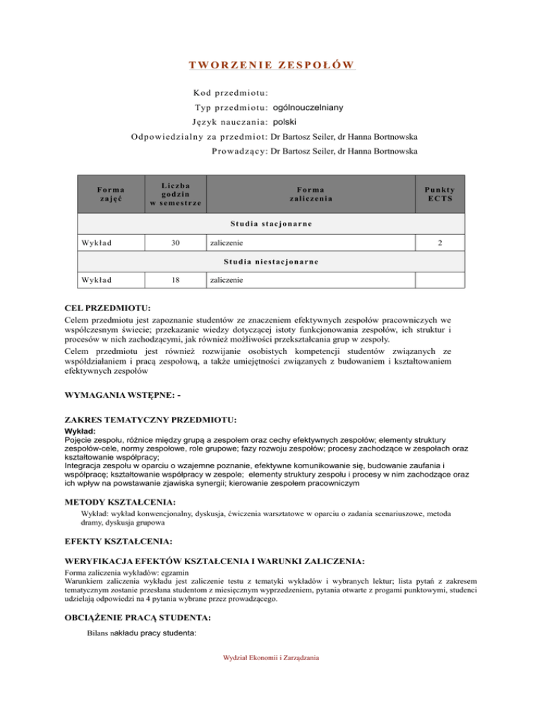 TWORZENIE ZESPOŁÓW Kod prz edm i ot u: Typ prz edm i ot u: ogólnouczelniany J ęz yk naucz ani a: polski Odpowi edz i al n y z a prz edm i ot : Dr Bartosz Seiler, dr Hanna Bortnowska P rowadz ą c y: Dr Bartosz Seiler, dr Hanna Bortnowska F o r ma zajęć Liczba godzin w s e me s t r z e F o r ma zaliczenia P u n kt y ECTS Studia stacjonarne Wykł a d 30 zaliczenie 2 S t u d i a n i e s t ac j o n a r n e Wykł a d 18 zaliczenie CEL PRZEDMIOTU: Celem przedmiotu jest zapoznanie studentów ze znaczeniem efektywnych zespołów pracowniczych we współczesnym świecie; przekazanie wiedzy dotyczącej istoty funkcjonowania zespołów, ich struktur i procesów w nich zachodzącymi, jak również możliwości przekształcania grup w zespoły. Celem przedmiotu jest również rozwijanie osobistych kompetencji studentów związanych ze współdziałaniem i pracą zespołową, a także umiejętności związanych z budowaniem i kształtowaniem efektywnych zespołów WYMAGANIA WSTĘPNE: ZAKRES TEMATYCZNY PRZEDMIOTU: Wykład: Pojęcie zespołu, różnice między grupą a zespołem oraz cechy efektywnych zespołów; elementy struktury zespołów-cele, normy zespołowe, role grupowe; fazy rozwoju zespołów; procesy zachodzące w zespołach oraz kształtowanie współpracy; Integracja zespołu w oparciu o wzajemne poznanie, efektywne komunikowanie się, budowanie zaufania i współpracę; kształtowanie współpracy w zespole; elementy struktury zespołu i procesy w nim zachodzące oraz ich wpływ na powstawanie zjawiska synergii; kierowanie zespołem pracowniczym METODY KSZTAŁCENIA: Wykład: wykład konwencjonalny, dyskusja, ćwiczenia warsztatowe w oparciu o zadania scenariuszowe, metoda dramy, dyskusja grupowa EFEKTY KSZTAŁCENIA: WERYFIKACJA EFEKTÓW KSZTAŁCENIA I WARUNKI ZALICZENIA: Forma zaliczenia wykładów: egzamin Warunkiem zaliczenia wykładu jest zaliczenie testu z tematyki wykładów i wybranych lektur; lista pytań z zakresem tematycznym zostanie przesłana studentom z miesięcznym wyprzedzeniem, pytania otwarte z progami punktowymi, studenci udzielają odpowiedzi na 4 pytania wybrane przez prowadzącego. OBCIĄŻENIE PRACĄ STUDENTA: Bilans nakładu pracy studenta: Wydział Ekonomii i Zarządzania Studia: Wyszczególnienie: stacjonarne: niestacjonarne: godziny kontaktowe: udział w wykładach 30 godz. 18 godz. praca samodzielna: studiowanie literatury 5 godz. 12 godz. przygotowanie do zaliczenia 15 godz. 20 godz. ŁĄCZNY nakład pracy studenta w godz. 50 50 Zajęcia z udziałem nauczyciela akademickiego 1 ECTS 1 ECTS Zajęcia o charakterze praktycznym 1 ECTS 1 ECTS Liczba punktów ECTS 2 LITERATURA PODSTAWOWA: 1. Aneona D., Bresmen H., Zespoły X. Jak budować zespoły, które odnoszą sukces, Oficyna Wolters Kluwer Business, Kraków, 2009 2. Belbin M. R., Twoja rola w zespole, GWP, Gdańsk, 2008 3. Mackin D., Budowanie zespołu; zestaw narzędzi, Rebis, Poznań, 2011 4. Miller D., Zespoły, PWE, Warszawa, 2010 LITERATURA UZUPEŁNIAJĄCA: Proctor T., Twórcze rozwiązywanie problemów, GWP, Gdańsk, 2003 Wachowiak P., Gregorczyk S., Grucza B., Ogonek K., Kierowanie zespołem projektowym, Difin, Warszawa 2004 Wydział Ekonomii i Zarządzania