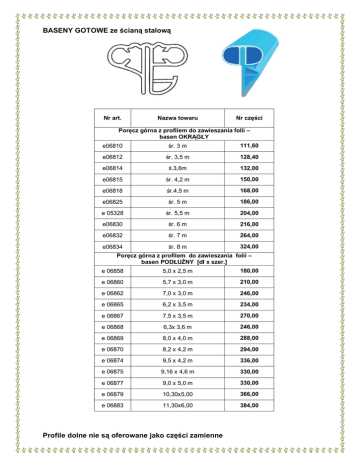 BASENY GOTOWE ze ścianą stalową Nr art. Nazwa towaru Nr części Poręcz górna z profilem do zawieszania folii – basen OKRĄGŁY e06810 śr. 3 m 111,60 e06812 śr. 3,5 m 128,40 e06814 ś.3,6m 132,00 e06815 śr. 4,2 m 150,00 e06818 śr.4,5 m 168,00 e06825 śr. 5 m 186,00 e 05328 śr. 5,5 m 204,00 e06830 śr. 6 m 216,00 e06832 śr. 7 m 264,00 e06834 śr. 8 m 324,00 Poręcz górna z profilem do zawieszania folii – basen PODŁUŻNY [dł x szer.] e 06858 5,0 x 2,5 m 180,00 e 06860 5,7 x 3,0 m 210,00 e 06862 7,0 x 3,0 m 246,00 e 06865 6,2 x 3,5 m 234,00 e 06867 7,5 x 3,5 m 270,00 e 06868 6,3x 3,6 m 246,00 e 06869 8,0 x 4,0 m 288,00 e 06870 8,2 x 4,2 m 294,00 e 06874 9,5 x 4,2 m 336,00 e 06875 9,16 x 4,6 m 330,00 e 06877 9,0 x 5,0 m 330,00 e 06879 10,30x5,00 366,00 e 06883 11,30x6,00 384,00 Profile dolne nie są oferowane jako części zamienne