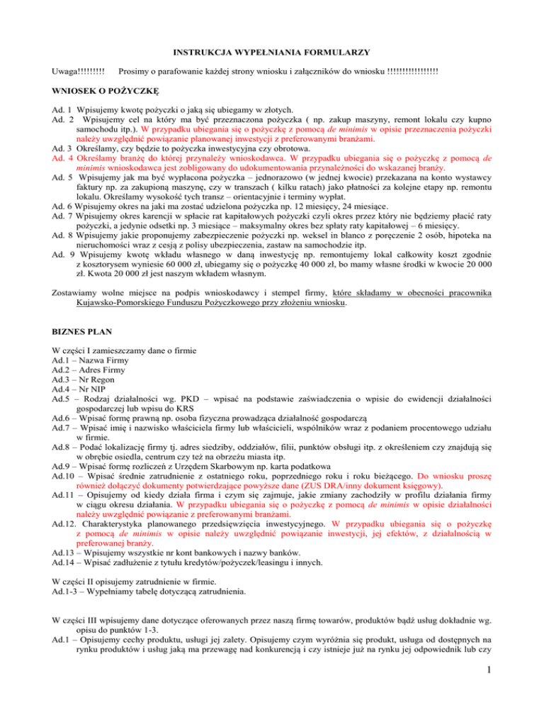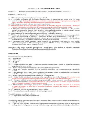 INSTRUKCJA WYPEŁNIANIA FORMULARZY Uwaga!!!!!!!!! Prosimy o parafowanie każdej strony wniosku i załączników do wniosku !!!!!!!!!!!!!!!!! WNIOSEK O POŻYCZKĘ Ad. 1 Wpisujemy kwotę pożyczki o jaką się ubiegamy w złotych. Ad. 2 Wpisujemy cel na który ma być przeznaczona pożyczka ( np. zakup maszyny, remont lokalu czy kupno samochodu itp.). W przypadku ubiegania się o pożyczkę z pomocą de minimis w opisie przeznaczenia pożyczki należy uwzględnić powiązanie planowanej inwestycji z preferowanymi branżami. Ad. 3 Określamy, czy będzie to pożyczka inwestycyjna czy obrotowa. Ad. 4 Określamy branżę do której przynależy wnioskodawca. W przypadku ubiegania się o pożyczkę z pomocą de minimis wnioskodawca jest zobligowany do udokumentowania przynależności do wskazanej branży. Ad. 5 Wpisujemy jak ma być wypłacona pożyczka – jednorazowo (w jednej kwocie) przekazana na konto wystawcy faktury np. za zakupioną maszynę, czy w transzach ( kilku ratach) jako płatności za kolejne etapy np. remontu lokalu. Określamy wysokość tych transz – orientacyjnie i terminy wypłat. Ad. 6 Wpisujemy okres na jaki ma zostać udzielona pożyczka np. 12 miesięcy, 24 miesiące. Ad. 7 Wpisujemy okres karencji w spłacie rat kapitałowych pożyczki czyli okres przez który nie będziemy płacić raty pożyczki, a jedynie odsetki np. 3 miesiące – maksymalny okres bez spłaty raty kapitałowej – 6 miesięcy. Ad. 8 Wpisujemy jakie proponujemy zabezpieczenie pożyczki np. weksel in blanco z poręczenie 2 osób, hipoteka na nieruchomości wraz z cesją z polisy ubezpieczenia, zastaw na samochodzie itp. Ad. 9 Wpisujemy kwotę wkładu własnego w daną inwestycję np. remontujemy lokal całkowity koszt zgodnie z kosztorysem wyniesie 60 000 zł, ubiegamy się o pożyczkę 40 000 zł, bo mamy własne środki w kwocie 20 000 zł. Kwota 20 000 zł jest naszym wkładem własnym. Zostawiamy wolne miejsce na podpis wnioskodawcy i stempel firmy, które składamy w obecności pracownika Kujawsko-Pomorskiego Funduszu Pożyczkowego przy złożeniu wniosku. BIZNES PLAN W części I zamieszczamy dane o firmie Ad.1 – Nazwa Firmy Ad.2 – Adres Firmy Ad.3 – Nr Regon Ad.4 – Nr NIP Ad.5 – Rodzaj działalności wg. PKD – wpisać na podstawie zaświadczenia o wpisie do ewidencji działalności gospodarczej lub wpisu do KRS Ad.6 – Wpisać formę prawną np. osoba fizyczna prowadząca działalność gospodarczą Ad.7 – Wpisać imię i nazwisko właściciela firmy lub właścicieli, wspólników wraz z podaniem procentowego udziału w firmie. Ad.8 – Podać lokalizację firmy tj. adres siedziby, oddziałów, filii, punktów obsługi itp. z określeniem czy znajdują się w obrębie osiedla, centrum czy też na obrzeżu miasta itp. Ad.9 – Wpisać formę rozliczeń z Urzędem Skarbowym np. karta podatkowa Ad.10 – Wpisać średnie zatrudnienie z ostatniego roku, poprzedniego roku i roku bieżącego. Do wniosku proszę również dołączyć dokumenty potwierdzające powyższe dane (ZUS DRA/inny dokument księgowy). Ad.11 – Opisujemy od kiedy działa firma i czym się zajmuje, jakie zmiany zachodziły w profilu działania firmy w ciągu okresu działania. W przypadku ubiegania się o pożyczkę z pomocą de minimis w opisie działalności należy uwzględnić powiązanie z preferowanymi branżami. Ad.12. Charakterystyka planowanego przedsięwzięcia inwestycyjnego. W przypadku ubiegania się o pożyczkę z pomocą de minimis w opisie należy uwzględnić powiązanie inwestycji, jej efektów, z działalnością w preferowanej branży. Ad.13 – Wpisujemy wszystkie nr kont bankowych i nazwy banków. Ad.14 – Wpisać zadłużenie z tytułu kredytów/pożyczek/leasingu i innych. W części II opisujemy zatrudnienie w firmie. Ad.1-3 – Wypełniamy tabelę dotyczącą zatrudnienia. W części III wpisujemy dane dotyczące oferowanych przez naszą firmę towarów, produktów bądź usług dokładnie wg. opisu do punktów 1-3. Ad.1 – Opisujemy cechy produktu, usługi jej zalety. Opisujemy czym wyróżnia się produkt, usługa od dostępnych na rynku produktów i usług jaką ma przewagę nad konkurencją i czy istnieje już na rynku jej odpowiednik lub czy 1 jest to produkt nowy. W przypadku ubiegania się o pożyczkę z pomocą de minimis w opisie produktu/usługi należy uwzględnić powiązanie z preferowanymi branżami. Ad.2 – Czy przeprowadzono jakiekolwiek badania na rynku , jeśli tak to czego dotyczyły i jaki zakres obejmowały. Czy oferowana usługa lub produkt, towar zapełnia jakąś lukę na rynku i czy zaspakaja potrzeby odbiorców, jeśli tak to uzasadnić w jaki sposób i dlaczego. Ad.3 – Czy oferowane produkty/usługi odznaczają się sezonowością tzn. czy są okresy, gdy więcej sprzedajesz i takie w których spada gwałtownie sprzedaż? Czym jest spowodowana taka sytuacja? W jaki sposób radzisz sobie z tym problemem? Czy możesz w jakikolwiek sposób przeciwdziałać negatywnym skutkom braku sprzedaży? W IV części opisujemy rynek na którym działa firma. Ad.1-2 – Wpisujemy kto jest lub będzie naszym odbiorcą czy klient indywidualny – detal czy hurtownie, jaki jest udział w sprzedaży hurtowni, a jaki detalu, jaki obszar działania. Przewidywana forma zapłaty lub stosowana forma zapłaty : gotówka, przelew, czek struktura %; terminy płatności 7dni, 14 , 21 lub inne stosowane z podziałem %; Jaki jest popyt na towar, produkt czy usługi w stosunku do twojej oferty mały, duży podaj wielkości cyfrowe. Wymień trzech największych odbiorców i ich % udział w sprzedaży oraz na jakich warunkach odbywa się sprzedaż : terminy płatności w dniach lub gotówka. Ad.3-4 – Opisz dostawców towarów i produktów oraz usług dla twojej firmy : dostawcy stali, rozproszeni, wielu, czy jest jakiś dostawca główny dla poszczególnych surowców ; struktura % dostawców ; stosowane przez dostawców formy rozliczeń : gotówka, czek, przelew jakie rozliczenia d