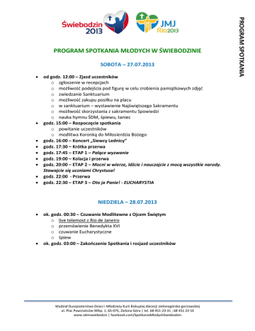 SOBOTA – 27.07.2013 od godz. 12:00 – Zjazd uczestników o zgłoszenie w recepcjach o możliwość podejścia pod figurę w celu zrobienia pamiątkowych zdjęć o zwiedzanie Sanktuarium o możliwość zakupu posiłku na placu o w sanktuarium – wystawienie Najświętszego Sakramentu o możliwość skorzystania z sakramentu Spowiedzi o nauka hymnu ŚDM, śpiewu, taniec godz. 15:00 – Rozpoczęcie spotkania o powitanie uczestników o modlitwa Koronką do Miłosierdzia Bożego godz. 16:00 – Koncert „Siewcy Lednicy” godz. 17:30 – Krótka przerwa godz. 17:45 – ETAP 1 – Palące wyzwanie godz. 19:00 – Kolacja i przerwa godz. 20:00 – ETAP 2 – Mocni w wierze, Idźcie i nauczajcie z mocą wszystkie narody. Stawajcie się uczniami Chrystusa! godz. 22:00 - Przerwa godz. 22:30 – ETAP 3 – Oto ja Panie! - EUCHARYSTIA NIEDZIELA – 28.07.2013 ok. godz. 00:30 – Czuwanie Modlitewne z Ojcem Świętym o live telemost z Rio de Janeiro o przemówienie Benedykta XVI o czuwanie Eucharystyczne o śpiew ok. godz. 03:00 – Zakończenie Spotkania i rozjazd uczestników Wydział Duszpasterstwa Dzieci i Młodzieży Kurii Biskupiej diecezji zielonogórsko-gorzowskiej ul. Plac Powstańców Wlkp. 1, 65-075, Zielona Góra | tel. 68 451-23-31 ; 68 451 23 53 www.sdmswiebodzin | facebook.com/SpotkaniaMlodychSwiebodzin PROGRAM SPOTKANIA PROGRAM SPOTKANIA MŁODYCH W ŚWIEBODZINIE