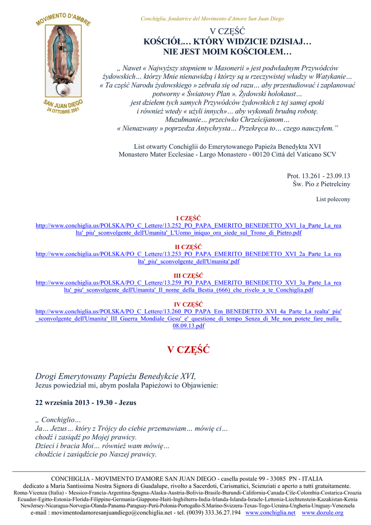 Conchiglia, fondatrice del Movimento d'Amore San Juan Diego V CZĘŚĆ KOŚCIÓŁ… KTÓRY WIDZICIE DZISIAJ… NIE JEST MOIM KOŚCIOŁEM… „ Nawet « Najwyższy stopniem w Masonerii » jest podwładnym Przywódców żydowskich… którzy Mnie nienawidzą i którzy są u rzeczywistej władzy w Watykanie… « Ta część Narodu żydowskiego » zebrała się od razu… aby przestudiować i zaplanować potworny « Światowy Plan ». Żydowski holokaust… jest dziełem tych samych Przywódców żydowskich z tej samej epoki i również wtedy « użyli innych»… aby wykonali brudną robotę. Muzułmanie… przeciwko Chrześcijanom… « Nienazwany » poprzedza Antychrysta… Przekręca to… czego nauczyłem.” List otwarty Conchiglii do Emerytowanego Papieża Benedykta XVI Monastero Mater Ecclesiae - Largo Monastero - 00120 Città del Vaticano SCV Prot. 13.261 - 23.09.13 Św. Pio z Pietrelciny List polecony I CZĘŚĆ http://www.conchiglia.us/POLSKA/PO_C_Lettere/13.252_PO_PAPA_EMERITO_BENEDETTO_XVI_1a_Parte_La_rea lta'_piu'_sconvolgente_dell'Umanita'_L'Uomo_iniquo_ora_siede_sul_Trono_di_Pietro.pdf II CZĘŚĆ http://www.conchiglia.us/POLSKA/PO_C_Lettere/13.253_PO_PAPA_EMERITO_BENEDETTO_XVI_2a_Parte_La_rea lta'_piu'_sconvolgente_dell'Umanita'.pdf III CZĘŚĆ http://www.conchiglia.us/POLSKA/PO_C_Lettere/13.259_PO_PAPA_EMERITO_BENEDETTO_XVI_3a_Parte_La_rea lta'_piu'_sconvolgente_dell'Umanita'_Il_nome_della_Bestia_(666)_che_rivelo_a_te_Conchiglia.pdf IV CZĘŚĆ http://www.conchiglia.us/POLSKA/PO_C_Lettere/13.260_PO_PAPA_Em_BENEDETTO_XVI_4a_Parte_La_realta'_piu' _sconvolgente_dell'Umanita'_III_Guerra_Mondiale_Gesu'_e'_questione_di_tempo_Senza_di_Me_non_potete_fare_nulla_ 08.09.13.pdf V CZĘŚĆ Drogi Emerytowany Papieżu Benedykcie XVI, Jezus powiedział mi, abym posłała Papieżowi to Objawienie: 22 września 2013 - 19.30 - Jezus „ Conchiglio… Ja… Jezus… który z Trójcy do ciebie przemawiam… mówię ci… chodź i zasiądź po Mojej prawicy. Dzieci i bracia Moi… również wam mówię… chodźcie i zasiądźcie po Naszej prawicy. CONCHIGLIA - MOVIMENTO D'AMORE SAN JUAN DIEGO - casella postale 99 - 33085 PN - ITALIA dedicato a Maria Santissima Nostra Signora di Guadalupe, rivolto a Sacerdoti, Carismatici, Scienziati e aperto a tutti gratuitamente. Roma-Vicenza (Italia) - Messico-Francia-Argentina-Spagna-Alaska-Austria-Bolivia-Brasile-Burundi-California-Canada-Cile-Colombia-Costarica-Croazia Ecuador-Egitto-Estonia-Florida-Filippine-Germania-Giappone-Haiti-Inghilterra-India-Irlanda-Islanda-Israele-Lettonia-Liechtenstein-Kazakistan-Kenia NewJersey-Nicaragua-Norvegia-Olanda-Panama-Paraguay-Perù-Polonia-Portogallo-S.Marino-Svizzera-Texas-Togo-Ucraina-Ungheria-Uruguay-Venezuela e-mail : [email protected] - tel. (0039) 333.36.27.194 www.conchiglia.net www.dozule.org Weźcie się w garść w duchu oddalając wszelką myśl… która może oderwać was ode Mnie ponieważ to… co teraz powiem… będzie musiało dobrze utrwalić się w waszym sercu i w waszym umyśle. Wszystko to… co objawiłem… musi być strzeżone z maksymalną troską dla przyszłych pokoleń które tylko tak będą mogły zrozumieć przepływ Historii od Mojego Zmartwychwstania. Stąd muszę wyruszyć… zaczynając od przypomnienia wam… że Ja urodziłem się Żydem na Ziemi i żydowski był Naród… który miałem wokół… ten Naród… który od chwili Mojego aresztowania podzielił się i pozostał podzielony podczas tortur… które Mi zadano i pozostał podzielony… towarzysząc Mi na Kalwarii i pozostał podzielony… kiedy jeszcze Żywy… konałem na Krzyżu… ponieważ byłem Ukrzyżowany i pozostał podzielony przy Mojej Śmierci i pozostał podzielony przy Moim Zmartwychwstaniu. Tak… Moje Narodzenie… Moja Śmierć i Moje Zmartwychwstanie podzieliły Naród żydowski. Były trzy stronnictwa… to… które Mnie słuchało… szło za Mną… kochało i wierzyło to… które Mnie słuchało… szło za Mną… aby Mnie śledzić nienawidziło i nie chciało wierzyć… pomimo… że rozpoznawali we Mnie Prawdę… oraz to letnie… o którym już zapomniałem ponieważ mimo… iż Mnie słuchało i przez trochę czasu szło za Mną… ani Mnie nie kochało… ani nie nienawidziło. Więc miałem do czynienia z dwoma stronnictwami… tym… które Mnie kochało i tym… które Mnie nienawidziło. Do dziś nic się nie zmieniło. Letni zawsze są. I są tacy… którzy Mnie kochają i tacy… którzy Mnie nienawidzą… to znaczy dzieci Boże Mnie kochają a dzieci Diabła Mnie odsuwają… ci letni… lub Mnie nienawidzą. Żydzi… którzy Mnie nienawidzili… chcieli Mojej Śmierci. Żydzi… którzy Mnie kochali… płakali przy Mojej Śmierci. Żydzi… którzy Mnie kochali… uwierzyli w Moje Zmartwychwstanie. Żydzi… którzy Mnie nienawidzili nie potrzebowali wierzyć w Moje Zmartwychwstanie ponieważ oni sami byli świadkami Mojego Zmartwychwstania. Nikt z nich nie zasnął na warcie. W pełni świadomi ujrzeli Moją Chwałę i przerazili się z powodu przyszłych następstw. Resztę Historii znacie… powiedzieli « fałszywe świadectwo » by sprawić… aby tłum uwierzył… że nie Zmartwychwstałem i że Moje Ciało zostało wykradzione przez Moich uczniów a zatem to nie Ja byłem Synem Bożym… Samym Bogiem. 2 CONCHIGLIA - MOVIMENTO D'AMORE SAN JUAN DIEGO - casella postale 99 - 33085 PN - ITALIA dedicato a Maria Santissima Nostra Signora di Guadalupe, rivolto a Sacerdoti, Carismatici, Scienziati e aperto a tutti gratuitamente. Roma-Vicenza (Italia) - Messico-Francia-Argentina-Spagna-Alaska-Austria-Bolivia-Brasile-Burundi-California-Canada-Cile-Colombia-Costarica-Croazia Ecuador-Egitto-Estonia-Florida-Filippine-Germania-Giappone-Haiti-Inghilterra-India-Irlanda-Islanda-Israele-Lettonia-Liechtenstein-Kazakistan-Kenia NewJersey-Nicaragua-Norvegia-Olanda-Panama-Paraguay-Perù-Polonia-Portogallo-S.Marino-Svizzera-Texas-Togo-Ucraina-Ungheria-Uruguay-Venezuela e-mail : [email 
