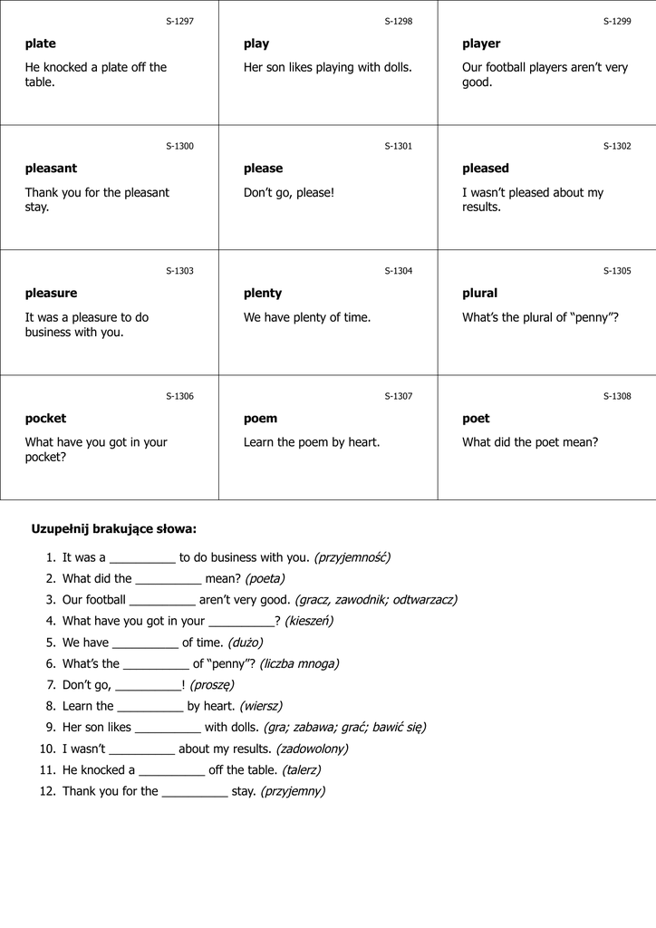 S-1297 S-1298 S-1299 plate play player He knocked a plate off the table. Her son likes playing with dolls. Our football players aren’t very good. S-1300 S-1301 S-1302 pleasant please pleased Thank you for the pleasant stay. Don’t go, please! I wasn’t pleased about my results. S-1303 S-1304 S-1305 pleasure plenty plural It was a pleasure to do business with you. We have plenty of time. What’s the plural of “penny”? S-1306 S-1307 S-1308 pocket poem poet What have you got in your pocket? Learn the poem by heart. What did the poet mean? Uzupełnij brakujące słowa: 1. It was a __________ to do business with you. (przyjemność) 2. What did the __________ mean? (poeta) 3. Our football __________ aren’t very good. (gracz, zawodnik; odtwarzacz) 4. What have you got in your __________? (kieszeń) 5. We have __________ of time. (dużo) 6. What’s the __________ of “penny”? (liczba mnoga) 7. Don’t go, __________! (proszę) 8. Learn the __________ by heart. (wiersz) 9. Her son likes __________ with dolls. (gra; zabawa; grać; bawić się) 10. I wasn’t __________ about my results. (zadowolony) 11. He knocked a __________ off the table. (talerz) 12. Thank you for the __________ stay. (przyjemny) S-1299 S-1298 gracz, zawodnik; odtwarzacz gra; zabawa; grać; bawić się Nasi piłkarze nie są zbyt dobrzy. Jej syn lubi bawić się lalkami. S-1297 talerz Strącił/zrzucił talerz ze stołu. www.isel.edu.pl www.isel.edu.pl www.isel.edu.pl S-1302 S-1301 S-1300 zadowolony proszę przyjemny Nie byłem zadowolony z moich wyników. Proszę, nie chodź! Dziękuję za przyjemny pobyt. www.isel.edu.pl www.isel.edu.pl www.isel.edu.pl S-1305 S-1304 S-1303 liczba mnoga dużo przyjemność Jaka jest liczba mnoga od (słowa) „penny”? Mamy dużo czasu. To była przyjemność robić z panem interesy. www.isel.edu.pl www.isel.edu.pl www.isel.edu.pl S-1308 S-1307 S-1306 poeta wiersz kieszeń Co poeta miał na myśli? Naucz się wiersza na pamięć. Co masz w kieszeni? www.isel.edu.pl Odpowiedzi: 1. pleasure 2. poet 3. players 4. pocket 5. plenty 6. plural 7. please 8. poem 9. playing 10. pleased 11. plate 12. pleasant www.isel.edu.pl www.isel.edu.pl