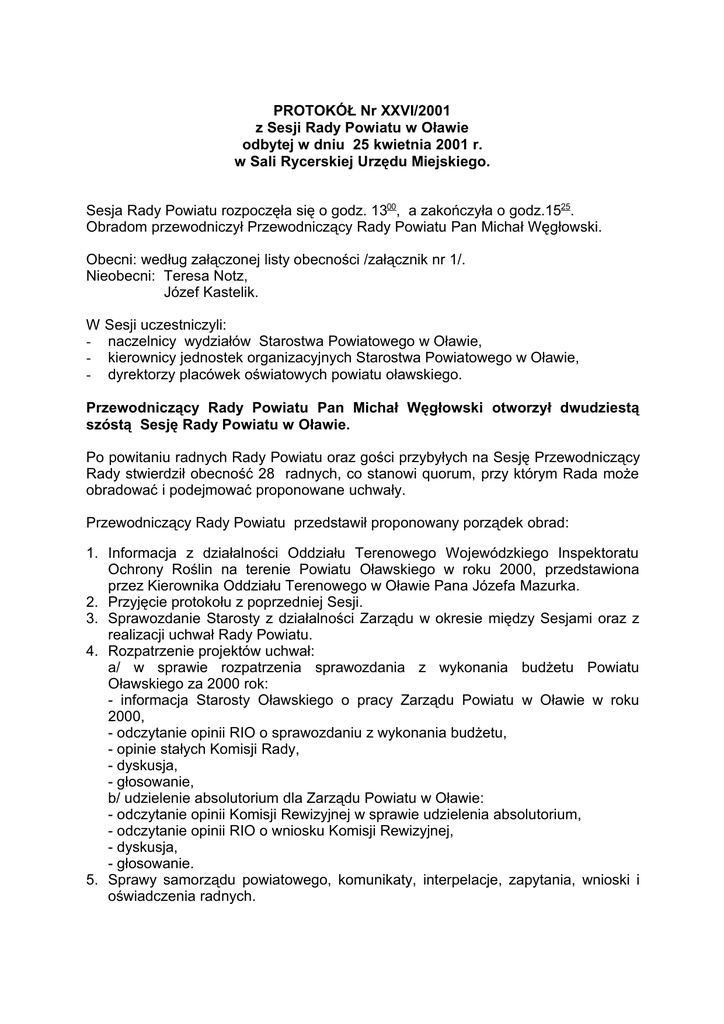 PROTOKÓŁ Nr XXVI/2001 z Sesji Rady Powiatu w Oławie odbytej w dniu 25 kwietnia 2001 r. w Sali Rycerskiej Urzędu Miejskiego. Sesja Rady Powiatu rozpoczęła się o godz. 1300, a zakończyła o godz.1525. Obradom przewodniczył Przewodniczący Rady Powiatu Pan Michał Węgłowski. Obecni: według załączonej listy obecności /załącznik nr 1/. Nieobecni: Teresa Notz, Józef Kastelik. W - Sesji uczestniczyli: naczelnicy wydziałów Starostwa Powiatowego w Oławie, kierownicy jednostek organizacyjnych Starostwa Powiatowego w Oławie, dyrektorzy placówek oświatowych powiatu oławskiego. Przewodniczący Rady Powiatu Pan Michał Węgłowski otworzył dwudziestą szóstą Sesję Rady Powiatu w Oławie. Po powitaniu radnych Rady Powiatu oraz gości przybyłych na Sesję Przewodniczący Rady stwierdził obecność 28 radnych, co stanowi quorum, przy którym Rada może obradować i podejmować proponowane uchwały. Przewodniczący Rady Powiatu przedstawił proponowany porządek obrad: 1. Informacja z działalności Oddziału Terenowego Wojewódzkiego Inspektoratu Ochrony Roślin na terenie Powiatu Oławskiego w roku 2000, przedstawiona przez Kierownika Oddziału Terenowego w Oławie Pana Józefa Mazurka. 2. Przyjęcie protokołu z poprzedniej Sesji. 3. Sprawozdanie Starosty z działalności Zarządu w okresie między Sesjami oraz z realizacji uchwał Rady Powiatu. 4. Rozpatrzenie projektów uchwał: a/ w sprawie rozpatrzenia sprawozdania z wykonania budżetu Powiatu Oławskiego za 2000 rok: - informacja Starosty Oławskiego o pracy Zarządu Powiatu w Oławie w roku 2000, - odczytanie opinii RIO o sprawozdaniu z wykonania budżetu, - opinie stałych Komisji Rady, - dyskusja, - głosowanie, b/ udzielenie absolutorium dla Zarządu Powiatu w Oławie: - odczytanie opinii Komisji Rewizyjnej w sprawie udzielenia absolutorium, - odczytanie opinii RIO o wniosku Komisji Rewizyjnej, - dyskusja, - głosowanie. 5. Sprawy samorządu powiatowego, komunikaty, interpelacje, zapytania, wnioski i oświadczenia radnych. Przewodniczący Rady Powiatu poddał pod głosowanie proponowany porządek obrad. Rada Powiatu jednogłośnie przyjęła porządek obrad Sesji. W uczestniczyło 23 radnych. głosowaniu Ad. 1 Informacja z działalności Oddziału Terenowego Wojewódzkiego Inspektoratu Ochrony Roślin na terenie Powiatu Oławskiego w roku 2000, przedstawiona przez Kierownika Oddziału Terenowego w Oławie Pana Józefa Mazurka. Przewodniczący Rady Powiatu poprosił Kierownika Oddziału Terenowego w Oławie Pana Józefa Mazurka o przedstawienie informacji z działalności Oddziału Terenowego Wojewódzkiego Inspektoratu Ochrony Roślin na terenie Powiatu Oławskiego /załącznik nr 2/. Przewodniczący Rady Powiatu podziękował przedstawienie powyższej informacji. Panu Józefowi Mazurkowi za Ad. 2 Przyjęcie protokołu z poprzedniej Sesji. Przewodniczący Rady Powiatu zwrócił się do Rady z zapytaniem, czy są uwagi do protokołu z poprzedniej Sesji, jeśli nie ma zaproponował przyjęcie protokołu w drodze aklamacji. Rada Powiatu przyjęła protokół z poprzedniej Sesji przez aklamację. Ad.3 Sprawozdanie Starosty z działalności Zarządu w okresie między Sesjami oraz z realizacji uchwał Rady Powiatu. Przewodniczący Rady Powiatu poprosił Starostę Powiatu Pana Stanisława Kałużę o przedstawienie sprawozdania. Pan Starosta złożył sprawozdanie z działalności Zarządu Powiatu w Oławie realizacji uchwał między Sesjami /załącznik nr 3/. oraz z Przewodniczący Rady Powiatu podziękował Staroście Powiatu Oławskiego za przedstawienie powyższej informacji i otworzył dyskusję. Radny Pan Arkadiusz Stefaniszyn zwrócił się z pytaniem, dlaczego Zarząd Powiatu wytypował Liceum Ogólnokształcące w Oławie do udziału w realizacji projektu Ministerstwa Edukacji Narodowej p.n. „ Pracownia internetowa w każdej szkole”. Radny Pan Arkadiusz Stefaniszyn poprosił o przekazanie radnym kserokopii stanowiska Konwentu Powiatów Dolnego Śląska wobec zaniżenia należnych przychodów Dolnośląskiej Regionalnej Kasy Chorych. Odpowiedzi do powyższych kwestii udzieliła Pani Grażyna Pankiewicz – Naczelnik Wydziału Oświaty, Kultury i Zdrowia oraz Starosta Powiatu. Radna Pani Joanna Kruk – Gręziak poprosiła o wyjaśnienie sprawy wyrażenia zgody na przyjęcie darowizny przez Samodzielny Publiczny Zakład Opieki Zdrowotnej w Oławie. Ad. 4 Rozpatrzenie projektów uchwał: a/ w sprawie rozpatrzenia sprawozdania z wykonania budżetu Powiatu Oławskiego za 2000 rok. Przewodniczący Rady Powiatu poprosił Starostę Oławskiego informacji o pracy Zarządu Powiatu w Oławie, w roku 2000. o przedstawienie Pan Stanisław Kałuża przedstawił ww. informację /załącznik nr 4/. Przewodniczący Rady Powiatu poprosił Wicestarostę Panią Marię Polakowską o odczytanie opinii RIO o sprawozdaniu z wykonania budżetu Powiatu Oławskiego za 2000 rok. Wicestarosta Pani Maria Polakowska odczytała opinię RIO o sprawozdaniu z wykonania budżetu Powiatu Oławskiego za 2000 rok /załącznik nr 5/. Przewodniczący Rady Powiatu poprosił Przewodniczących stałych Komisji o przedstawienie opinii o sprawozdaniu z wykonania budżetu Powiatu Oławskiego za 2000 rok. Przewodniczący Komisji Finansów i Budżetu radny Pan Marek Kłeczek przedstawił opinię Komisji o sprawozdaniu z wykonania budżetu Powiatu oławskiego za 2000 rok /załącznik nr 6/. Przewodniczący Komisji Promocji, Rozwoju Gospodarczego i Infrastruktury Technicznej radny Pan Bogdan Olejnik przedstawił opinię Komisji o sprawozdaniu z wykonania budżetu Powiatu Oławskiego za 2000 rok /załącznik nr 7/. Przewodniczący Komisji Przestrzegania Prawa i Porządku Publicznego radny Pan Jacek Pilawa przedstawił opinię Komisji o sprawozdaniu z wykonania budżetu Powiatu Oławskiego za 2000 rok /załącznik nr 8/. Zastępca Przewodniczącego Komisji Rolnictwa, Leśnictwa i Ochrony Środowiska radny Pan Józef Hołyński przedstawił opinię Komisji o 