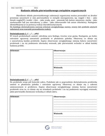 ……………………………….............. imię i nazwisko klasa Badanie składu pierwiastkowego związków organicznych Określenie składu pierwiastkowego substancji organicznej można prowadzić na drodze przemian zawartych w niej pierwiastków w związki nieorganiczne, np. węgiel i tlen − jako tlenek węgla(IV), wodór i tlen − jako wodę, azot - amoniak lub kation amonowy, siarkę - jako siarkowodór lub jon siarczkowy, a chlor - jako chlorowodór lub anion chlorkowy. Następnie identyfikujemy je za pomocą reakcji charakterystycznych. Do każdego doświadczenia narysuj schemat uwzględniając nazwy, wzory lub symbole użytych substancji oraz warunki prowadzenia reakcji. Doświadczenie 1. (…../….. pkt) W trzech probówkach umieść: odrobinę sera białego, trociny oraz gumę. Następnie, po kolei, ostrożnie ogrzewaj zawartość probówki w płomieniu palnika. Obserwuj co dzieje się z zawartością każdej probówki. Zapisz obserwacje uwzględniając zmianę koloru zawartości probówek i na tej podstawie sformułuj wniosek, jaki pierwiastek wchodzi w skład każdej badanej próbki. Schemat: Obserwacje: ……………………………………………………………………… ……………………………………………………………………… ……………………………………………………………………… ……………………………………………………………………… ……………………………………………………………………… ……………………………………………………………………… Wniosek: ……………………………………………………………………… ……………………………………………………………………… ……………………………………………………………………… Doświadczenie 2. (…../….. pkt) Do probówki wsyp pół łyżeczki cukru. Podobnie jak w poprzednim doświadczeniu probówkę umieść w płomieniu palnika i ostrożnie ogrzewaj. Obserwuj co dzieje się z cukrem umieszczonym w probówce. Zapisz obserwacje uwzględniając zmianę barwy zawartości probówki oraz to, co dzieje się na ściankach probówki i na tej podstawie wyciągnij wniosek, jakie pierwiastki chemiczne wchodzą w skład cukru. Schemat: Obserwacje: ……………………………………………………………………… ……………………………………………………………………… ……………………………………………………………………… ……………………………………………………………………… ……………………………………………………………………… ……………………………………………………………………… Wniosek: ……………………………………………………………………… ……………………………………………………………………… ……………………………………………………………………… Doświadczenie 3. (…../….. pkt) W probówce umieść niewielką ilość białego sera i dodaj około 1 cm3 wodnego roztworu wodorotlenku sodu. Zawartość probówki ogrzej ostrożnie w płomieniu palnika. Podczas ogrzewania do wylotu probówki zbliż zwilżony papierek uniwersalny oraz bardzo ostrożnie powąchaj wydzielający się gaz. Zapisz obserwacje dotyczące zmiany barwy papierka wskaźnikowego i na tej podstawie wyciągnij wniosek na temat: jaki pierwiastek został wykryty za pomocą tego doświadczenia i w postaci jakiego związku chemicznego. Odpowiedz na pytanie dlaczego należy zwilżyć papierek uniwersalny wodą i uzasadnij odpowiedź odpowiednim równaniem reakcji. Schemat: Obserwacje: ……………………………………………………………………… ……………………………………………………………………… ……………………………………………………………………… ……………………………………………………………………… Wniosek: ……………………………………………………………………… ……………………………………………………………………… ……………………………………………………………………… Odpowiedź: ……………………………………………………………………………………………………………………………………………….. ……………………………………………………………………………………………………………………………………………….. Równanie reakcji: ……………………………………………………………………………………………………………………………………………….. Doświadczenie 4. (…../….. pkt) Do pierwszej probówki wlej około 2 cm3 roztworu wodnego białka jaja kurzego, a do drugiej taką samą objętość oleju i dodaj do obydwu probówek po 1 cm3 roztworu wodnego wodorotlenku sodu. Następnie ogrzej zawartość probówek w płomieniu palnika. Po chwili do probówek dodaj 2 – 3 krople roztworu wodnego azotanu(V) ołowiu(II). Zapisz obserwacje poczynione podczas doświadczenia po dodaniu soli ołowiu(II). Wyciągnij wniosek dotyczący postaci, w jakiej uwalniana jest siarka ze związków organicznych, skoro można ją wykryć w zaproponowanej reakcji. Reakcję zapisz w postaci jonowej skróconej. Schemat: Obserwacje: ……………………………………………………………………… ……………………………………………………………………… ……………………………………………………………………… ……………………………………………………………………… ……………………………………………………