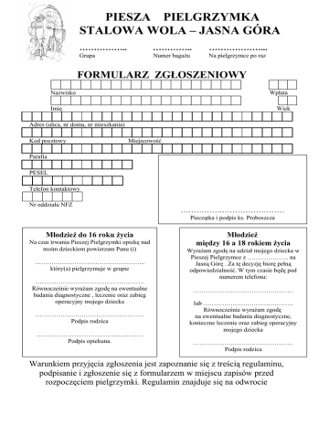 formularz - Piesza Pielgrzymka Stalowa Wola