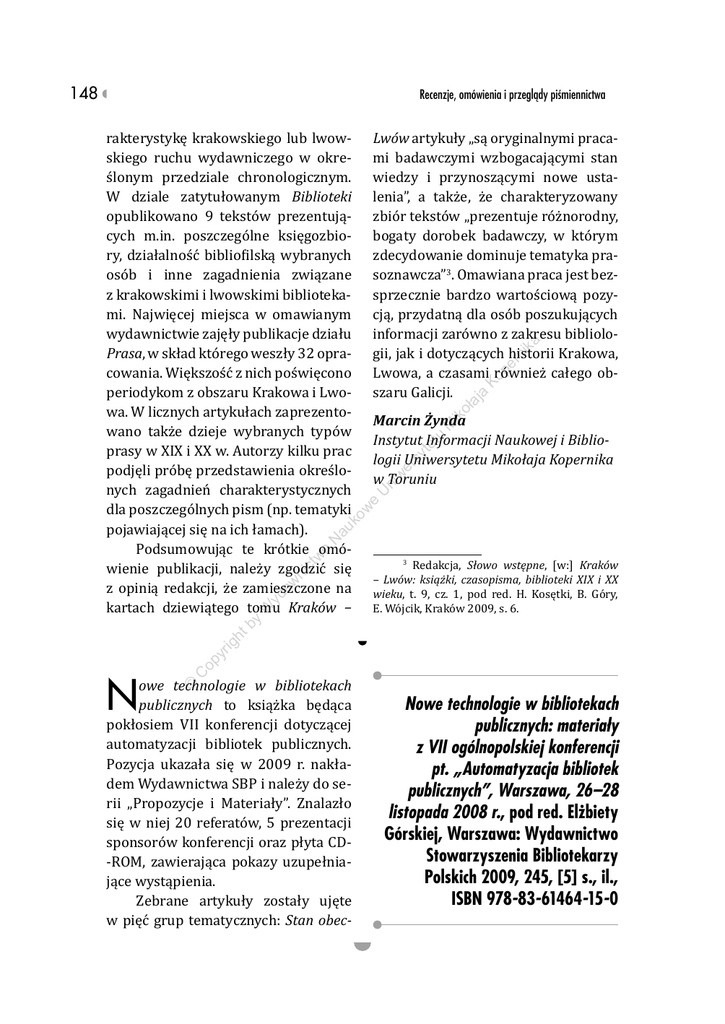 148 Recenzje, omówienia i przeglądy piśmiennictwa oł aj a Ko pe rn ik a Lwów artykuły „są oryginalnymi pracami badawczymi wzbogacającymi stan wiedzy i przynoszącymi nowe ustalenia”, a także, że charakteryzowany zbiór tekstów „prezentuje różnorodny, bogaty dorobek badawczy, w którym zdecydowanie dominuje tematyka prasoznawcza”3. Omawiana praca jest bezsprzecznie bardzo wartościową pozycją, przydatną dla osób poszukujących informacji zarówno z zakresu bibliologii, jak i dotyczących historii Krakowa, Lwowa, a czasami również całego obszaru Galicji. e U ni w er sy te tu M ik Marcin Żynda Instytut Informacji Naukowej i Bibliologii Uniwersytetu Mikołaja Kopernika w Toruniu Redakcja, Słowo wstępne, [w:] Kraków – Lwów: książki, czasopisma, biblioteki XIX i XX wieku, t. 9, cz. 1, pod red. H. Kosętki, B. Góry, E. Wójcik, Kraków 2009, s. 6. 3 C N op yr ig ht by W yd aw ni ct w o N au ko w rakterystykę krakowskiego lub lwowskiego ruchu wydawniczego w określonym przedziale chronologicznym. W dziale zatytułowanym Biblioteki opublikowano 9 tekstów prezentujących m.in. poszczególne księgozbiory, działalność bibliofilską wybranych osób i inne zagadnienia związane z krakowskimi i lwowskimi bibliotekami. Najwięcej miejsca w omawianym wydawnictwie zajęły publikacje działu Prasa, w skład którego weszły 32 opracowania. Większość z nich poświęcono periodykom z obszaru Krakowa i Lwowa. W licznych artykułach zaprezentowano także dzieje wybranych typów prasy w XIX i XX w. Autorzy kilku prac podjęli próbę przedstawienia określonych zagadnień charakterystycznych dla poszczególnych pism (np. tematyki pojawiającej się na ich łamach). Podsumowując te krótkie omówienie publikacji, należy zgodzić się z opinią redakcji, że zamieszczone na kartach dziewiątego tomu Kraków − © owe technologie w bibliotekach publicznych to książka będąca pokłosiem VII konferencji dotyczącej automatyzacji bibliotek publicznych. Pozycja ukazała się w 2009 r. nakładem Wydawnictwa SBP i należy do serii „Propozycje i Materiały”. Znalazło się w niej 20 referatów, 5 prezentacji sponsorów konferencji oraz płyta CD-ROM, zawierająca pokazy uzupełniające wystąpienia. Zebrane artykuły zostały ujęte w pięć grup tematycznych: Stan obec- Nowe technologie w bibliotekach publicznych: materiały z VII ogólnopolskiej konferencji pt. „Automatyzacja bibliotek publicznych”, Warszawa, 26–28 listopada 2008 r., pod red. Elżbiety Górskiej, Warszawa: Wydawnictwo Stowarzyszenia Bibliotekarzy Polskich 2009, 245, [5] s., il., ISBN 978-83-61464-15-0 149 Recenzje, omówienia i przeglądy piśmiennictwa © C op yr ig ht by W yd aw ni ct w o N U ni w er sy te tu M ik oł aj a Ko pe rn ik a edukacyjnych i informacyjnych dla lokalnej społeczności. Drugi dział Technologie informacyjne i oprogramowanie dla bibliotek zawiera pięć artykułów. Pierwszy z nich pt. Serwisy społecznościowe i inicjatywy sieciowe jako formy propagowania czytelnictwa – autorstwa Magdaleny Szpunar – jest ciekawym spojrzeniem na rolę Internetu jako środka w procesie kształtowania reklamy i recenzji książki. Autorka w przekonujący sposób udowadnia, że nowe usługi sieciowe potrafią pozytywnie stymulować zainteresowania czytelnicze. W tym samym dziale Bożena Bednarek-Michalska i Lidia Derfert-Wolf propagują ideę Open Access. W tekście oprócz historii, głównych założeń oraz trendów rozwoju tego ruchu znajdujemy bardzo rozbudowany wykaz adresów internetowych najpopularniejszych repozytoriów i wyszukiwarek oferujących wolny dostęp do publikacji naukowych. Artykuł przynosi także charakterystykę problemów, z którymi boryka się ruch Open Access, oraz propozycje sposobów ich przezwyciężenia. W kolejnej publikacji Agnieszka Koszowska prezentuje modele oraz przykładowe zastosowania narzędzi i technologii Web 2.0 w bibliotekach polskich i zagranicznych. Sam temat, choć nie wydaje się zbyt odkrywczy, to potraktowany został w ciekawy i pouczający sposób, czego brakuje wielu podobnym tekstom. Następny artykuł (Biblioteczne oprogramowanie Open Source w polskich realiach) jest poświęcony tema- e au ko w ny i projekty dla bibliotek, Technologie informacyjne i oprogramowanie dla bibliotek, Współpraca dla bibliotek, Biblioteki cyfrowe oraz Wystąpienia sponsorów. Pierwszy dział Stan obecny i projekty dla bibliotek otwiera artykuł, a właściwie raport, autorstwa Katarzyny Winogrodzkiej na temat stanu automatyzacji bibliotek publicznych. Badania, na podstawie których powstało opracowanie, przeprowadzono w 2008 r. jako kontynuację podobnych analiz wykonanych przez Komisję Automatyzacji Zarządu Głównego Stowarzyszenia Bibliotekarzy Polskich w 2000 r. Sam raport jest niezwykle obszerny i swą tematyką obejmuje nie tylko automatyzację procesów bibliotecznych, ale również digitalizację zasobów bibliotek, sieciowy dostęp do nich oraz związane z tym usługi. Dwa następne artykuły Elżbiety Kalinowskiej oraz Jacka Wojnarowskiego podejmują tematykę programów rozwoju bibliotek publicznych. W obu przypadkach opisywane są programy pomocowe przeznaczone dla mniejszych placówek. Tematem przewodnim podjętym przez Elżbietę Kalinowską jest program „Biblioteka+”, patronowany przez Instytut Książki, a skierowany głównie do ośrodków gminnych. Jacek Wojnarowski przybliża natomiast „Program Rozwoju Bibliotek”, sponsorowany przez Polsko-Amerykańską Fundację Wolności. Wspólnym celem opisywanych przedsięwzięć jest uczynienie z bibliotek publicznych centrów kulturalnych, 150 Recenzje, omówienia i przeglądy piśmiennictwa © C op yr ig ht by W yd aw ni ct w o N U ni w er sy te tu M ik oł aj a Ko pe rn ik a rzyści płynących z tej formy współpracy dla obu typów bibliotek. Kolejna publikacja tego działu porusza tematykę opracowywania bibliografii regionalnych w Internecie. Po krótkim rysie historycz