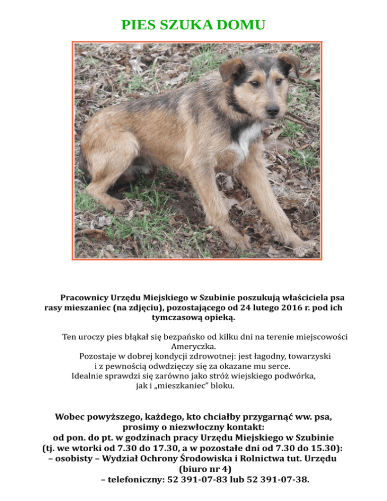 PIES SZUKA DOMU Pracownicy Urzędu Miejskiego w Szubinie poszukują właściciela psa rasy mieszaniec (na zdjęciu), pozostającego od 24 lutego 2016 r. pod ich tymczasową opieką. Ten uroczy pies błąkał się bezpańsko od kilku dni na terenie miejscowości Ameryczka. Pozostaje w dobrej kondycji zdrowotnej: jest łagodny, towarzyski i z pewnością odwdzięczy się za okazane mu serce. Idealnie sprawdzi się zarówno jako stróż wiejskiego podwórka, jak i „mieszkaniec” bloku. Wobec powyższego, każdego, kto chciałby przygarnąć ww. psa, prosimy o niezwłoczny kontakt: od pon. do pt. w godzinach pracy Urzędu Miejskiego w Szubinie (tj. we wtorki od 7.30 do 17.30, a w pozostałe dni od 7.30 do 15.30): – osobisty – Wydział Ochrony Środowiska i Rolnictwa tut. Urzędu (biuro nr 4) – telefoniczny: 52 391-07-83 lub 52 391-07-38.
