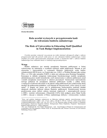 6 (55) 2011 Iwona Kowalska Rola uczelni wyĪszych w przygotowaniu kadr do wdraĪania budĪetu zadaniowego The Role of Universities in Educating Staff Qualified in Task Budget Implementation Uczelnie powinny wzmocniü swą pozycjĊ na rynku instytucji oferujących usáugi z zakresu przygotowania kadr dla potrzeb rynku pracy (w tym wdraĪania budĪetu zadaniowego). Celem artykuáu jest próba zaprezentowania potencjaáu uczelni w ksztaáceniu kadr z zakresu budĪetu zadaniowego oraz wskazanie barier w realizacji tego przedsiĊwziĊcia. WstĊp BudĪet zadaniowy jest metodą zarządzania finansami publicznymi w której wykorzystuje siĊ informacjĊ o wynikach realizacji zadaĔ publicznych. Metoda ta jest stosowana i wprowadzana w systemach finansów publicznych wielu krajów czáonkowskich OECD (m.in. we Francji jako tzw. LOLF, w Wielkiej Brytanii jako system PSA, a w USA jako narzĊdzie PART), a takĪe jest zalecana przez KomisjĊ Europejską1. Koncepcja ta zakáada zastąpienie tradycyjnego biurokratycznego modelu zarządzania administracją przez model menedĪerski, czyli zastosowanie w sektorze publicznym zasad i modeli zarządzania stosowanych w sektorze prywatnym2. KoniecznoĞü wprowadzenia nowego podejĞcia do zarządzania sektorem publicznym wynika z jednej strony z rosnących oczekiwaĔ obywateli co do jakoĞci usáug publicznych przy jednoczesnej duĪej niechĊci do podnoszenia podatków, czyli dąĪenia do otrzymywania „coraz wiĊcej za coraz mniej”. Z drugiej zaĞ strony jest to podyktowane koniecznoĞcią realizacji dziaáaĔ sáuĪących obniĪeniu deficytu sektora finansów publicznych. Konsekwencją bowiem przekroczenia przez deficyt sektora instytucji rządowych i samorządowych jeszcze w 2008 r. wartoĞci referencyjnej z Maastricht (3,0%) byáo podjĊcie przez RadĊ Ecofin w 2009 r. decyzji o istnieniu w Polsce nadmiernego deficytu i równoczeĞnie wydanie 1 Prace nad polskim budĪetem zadaniowym są faktyczną realizacją zapisów znowelizowanej ustawy o finansach publicznych z 2005 r. (art.: 35 ust. 3 pkt 1, 124 pkt 9, 158 ust. 3 pkt 9), a takĪe nowej ustawy o finansach publicznych z 2009 r. (art.: 44, 138, 174, 175, 18). Stosowne zapisy są takĪe zawarte w: Programie Konwergencji, Krajowym Programie Reform, Strategicznym Planie Rządzenia, Programie Operacyjnym Kapitaá Ludzki (priorytet V - Dobre rządzenie). 2 Por. m.in. Podstawka M.: New Public Management – task – based budget in Poland. In: Communication and Counseling in the Development of Rural Areas. K. KrzyĪanowska (ed). Warsaw University of Life Sciences Publishing, Warsaw 2009 34 rekomendacji dotyczącej redukcji nadmiernego deficytu do 2012 r. Dlatego teĪ umiejĊtnoĞü konstruowania budĪetu zadaniowego staje siĊ kluczową umiejĊtnoĞcią w procesie realizacji zadaĔ publicznych. Rozszerzenie oferty dydaktycznej o problematykĊ budĪetu zadaniowego jest dobrym przykáadem na wzmocnienie pozycji uczelni wyĪszych na rynku instytucji Ğwiadczących usáugi z zakresu ksztaácenia kadr dla potrzeb rynku pracy. Wiodącą rolĊ w tym obszarze powinny sprawowaü uniwersytety ekonomiczne oraz uczelnie z wydziaáami nauk ekonomicznych. Tego typu dziaáania wpisują siĊ w faktyczną realizacjĊ tzw. „trzeciej misji” uczelni. Obok bowiem tradycyjnych zadaĔ uniwersytetu (ksztaácenie i realizacja badaĔ naukowych) uczelnie powinny zadbaü o relacje z sektorem: przedsiĊbiorstw, publicznym oraz pozarządowym (np. wspóápraca uczelni z pracodawcami w celu dostosowania programów ksztaácenia do wymagaĔ rynku pracy)3. Tematyka związana z budĪetem zadaniowym stanowiáaby dobry przykáad poszerzenia palety moĪliwoĞci podwyĪszania kwalifikacji zawodowych oferowanych przez uczelniĊ (np. uczelnie rolnicze mogáyby wspieraü kadry w obszarze dwóch funkcji budĪetu paĔstwa: 12 - Ochrona i poprawa stanu Ğrodowisk; 21 - Prowadzenie polityki rolnej oraz rybackiej). Celem artykuáu jest próba zaprezentowania potencjaáu uczelni w ksztaáceniu kadr z zakresu budĪetu zadaniowego oraz wskazanie barier w realizacji tego przedsiĊwziĊcia. Niewykorzystany potencjaá uczelni w zakresie ksztaácenia kadr z wdraĪania budĪetu zadaniowego Niewykorzystany potencjaá uczelni w zakresie ksztaácenia kadr z wdraĪania budĪetu zadaniowego to w gáównej mierze nie w peáni wykorzystany zasób wiedzy nauczycieli akademickich potwierdzony m.in. realizacją ekspertyz na rzecz Ministerstwa Finansów. Szczególnie cennym zasobem wiedzy jest np. opracowanie ekspertyzy dotyczącej opracowania bazy mierników dla poszczególnych funkcji, zadaĔ i podzadaĔ zamieszczonych w zadaniowym planie wydatków (budĪet zadaniowy) na rzecz umoĪliwienia oceny ich realizacji pod wzglĊdem: istotnoĞci, skutecznoĞci, efektywnoĞci, uĪytecznoĞci i trwaáoĞci. Nauczyciele akademiccy wykonujący tego typu ekspertyzy (termin realizacji wynosi na ogóá 150 dni) potrafią: 1. Dokonaü przeglądu mierników stosowanych w budĪetach zadaniowych krajów OECD oraz dotychczas stosowanych mierników w zadaniowych planach wydatków w Polsce (np. dla funkcji 21: Prowadzenie polityki rolnej oraz rybackiej obejmującej nastĊpujące zadania: 21.1 wspieranie rozwoju produkcji roĞlinnej i ochrona roĞlin uprawnych, 21.2 wspieranie rozwoju produkcji zwierzĊcej i hodowli zwierząt, 21.3 ochrona zdrowia i dobrostanu zwierząt oraz zdrowia publicznego w zakresie weterynarii, 21.4 ksztaátowanie ustroju rolnego paĔstwa, 21.5 wspieranie rozwoju infrastruktury wsi, 21.6 wspieranie rybactwa Ğródlądowego i ryboáówstwa morskiego, 21.7 realizacja Wspólnej Polityki Rolnej i Rybackiej, 3 Diagnoza stanu szkolnictwa wyĪszego w Polsce. Raport cząstkowy przygotowany przez konsorcjum: Ernst & Young Business Advisory oraz Instytut BadaĔ nad Gospodarka Rynkową. Listopad 2009, s. 96. 35 21.8 nadzór nad zdrowotną jakoĞcią Ğrodków spoĪywczych pochodzenia zwierzĊcego w miejscach ich pozyskiwania, wytwarzania, przetwarzania i skáadowania, 21.9 infor