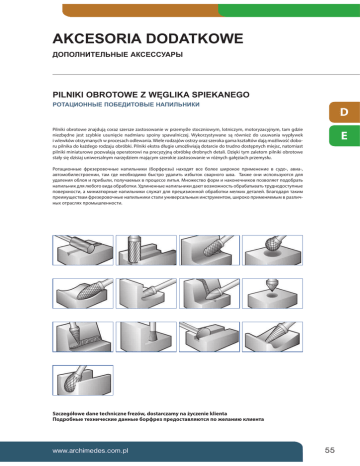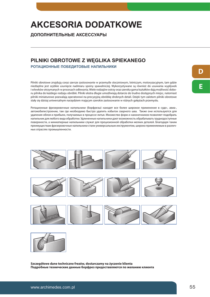 AKCESORIA DODATKOWE ȾɈɉɈɅɇɂɌȿɅɖɇɕȿȺɄɋȿɋɋɍȺɊɕ 3,/1,.,2%5272:(=:ĉ*/,.$63,(.$1(*2 ɊɈɌȺɐɂɈɇɇɕȿɉɈȻȿȾɂɌɈȼɕȿɇȺɉɂɅɖɇɂɄɂ D Pilniki obrotowe znajdują coraz szersze zastosowanie w przemyśle stoczniowym, lotniczym, motoryzacyjnym, tam gdzie niezbędne jest szybkie usunięcie nadmiaru spoiny spawalniczej. Wykorzystywane są również do usuwania wypływek i wlewków otrzymanych w procesach odlewania. Wiele rodzajów ostrzy oraz szeroka gama kształtów dają możliwość doboru pilnika do każdego rodzaju obróbki. Pilniki ekstra długie umożliwiają dotarcie do trudno dostępnych miejsc, natomiast pilniki miniaturowe pozwalają operatorowi na precyzyjną obróbkę drobnych detali. Dzięki tym zaletom pilniki obrotowe stały się dzisiaj uniwersalnym narzędziem mającym szerokie zastosowanie w różnych gałęziach przemysłu. E ʆʤʨʖʬʞʤʣʣʱʛ ʪʦʛʝʛʦʤʘʤʭʣʱʛ ʣʖʥʞʡʲʣʞʠʞ ʗʤʦʪʦʛʝʱ ʣʖʫʤʚʵʨ ʘʧʛ ʗʤʡʛʛ ʮʞʦʤʠʤʛ ʥʦʞʢʛʣʛʣʞʛ ʘ ʧʩʚʤ ʖʘʞʖ ʖʘʨʤʢʤʗʞʡʛʧʨʦʤʛʣʞʞ ʨʖʢ ʙʚʛ ʣʛʤʗʫʤʚʞʢʤ ʗʱʧʨʦʤ ʩʚʖʡʞʨʲ ʞʝʗʱʨʤʠ ʧʘʖʦʣʤʙʤ ʮʘʖ ʈʖʠʜʛ ʤʣʞ ʞʧʥʤʡʲʝʩʴʨʧʵ ʚʡʵ ʩʚʖʡʛʣʞʵʤʗʡʤʵʞʥʦʞʗʱʡʞʥʤʡʩʭʖʛʢʱʫʘʥʦʤʬʛʧʧʛʡʞʨʲʵʂʣʤʜʛʧʨʘʤʪʤʦʢʞʣʖʠʤʣʛʭʣʞʠʤʘʥʤʝʘʤʡʵʛʨʥʤʚʤʗʦʖʨʲ ʣʖʥʞʡʲʣʞʠʚʡʵʡʴʗʤʙʤʘʞʚʖʤʗʦʖʗʤʨʠʞʉʚʡʞʣʛʣʣʱʛʣʖʥʞʡʲʣʞʠʞʚʖʴʨʘʤʝʢʤʜʣʤʧʨʲʤʗʦʖʗʖʨʱʘʖʨʲʨʦʩʚʣʤʚʤʧʨʩʥʣʱʛ ʥʤʘʛʦʫʣʤʧʨʞʖʢʞʣʞʖʨʴʦʣʱʛʣʖʥʞʡʲʣʞʠʞʧʡʩʜʖʨʚʡʵʥʦʛʬʞʝʞʤʣʣʤʟʤʗʦʖʗʤʨʠʞʢʛʡʠʞʫʚʛʨʖʡʛʟɷʡʖʙʤʚʖʦʵʨʖʠʞʢ ʥʦʛʞʢʩʯʛʧʨʘʖʢʪʦʛʝʛʦʤʘʤʭʣʱʛʣʖʥʞʡʲʣʞʠʞʧʨʖʡʞʩʣʞʘʛʦʧʖʡʲʣʱʢʞʣʧʨʦʩʢʛʣʨʤʢʮʞʦʤʠʤʥʦʞʢʛʣʵʛʢʱʢʘʦʖʝʡʞʭʣʱʫʤʨʦʖʧʡʵʫʥʦʤʢʱʮʡʛʣʣʤʧʨʞ Szczegółowe dane techniczne frezów, dostarczamy na życzenie klienta Подробные технические данные борфрез предоставляются по желанию клиента www.archimedes.com.pl 55 D E 56 ZESTAWY PILNIKÓW НАБОРЫ НАПИЛЬНИКОВ ZESTAWY PILNIKÓW RAPID НАБОРЫ НАПИЛЬНИКОВ RAPID OSTROŁUKOWE ZAOKRĄGLONE WALCOWE СТРЕЛЬЧАТЫЕ ЗАКРУГЛЕННЫЕ ЦИЛИНДРИЧЕСКИЕ WALCOWE Z OSTRZAMI NA CZOLE STOŻKOWE ODWRÓCONE OSTROŁUKOWE КОНИЧЕСКИЕ ОБРАТНЫЕ СТРЕЛЬЧАТЫЕ TARCZOWE POGŁĘBIACZE 60 ° ДИСКОВЫЕ ЗЕНКОВКИ 60° PILNIKI MINIATUROWE POGŁĘBIACZE 90 ° KULISTE МИНИАТЮРНЫЕ НАПИЛЬНИКИ ЗЕНКОВКИ 90 ° ШАРОВЫЕ PILNIKI MINIATUROWE STOŻKOWE ZAOKRĄGLONE OWALNE МИНИАТЮРНЫЕ НАПИЛЬНИКИ КОНИЧЕСКИЕ ЗАКРУГЛЕННЫЕ ОВАЛЬНЫЕ EKSTRA DŁUGIE STOŻKOWE PŁOMIENIOWE УДЛИНЕННЫЕ КОНИЧЕСКИЕ ПЛАМЕОБРАЗНЫЕ ЦИЛИНДРИЧЕСКИЕ С ТОРЦЕВОЙ НАСЕЧКОЙ WALCOWE ZAOKRĄGLONE ЦИЛИНДРИЧЕСКИЕ ЗАКРУГЛЕННЫЕ
