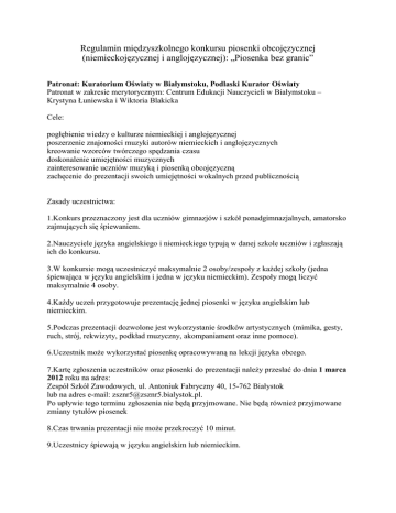 Regulamin międzyszkolnego konkursu piosenki obcojęzycznej (niemieckojęzycznej i anglojęzycznej): „Piosenka bez granic” Patronat: Kuratorium Oświaty w Białymstoku, Podlaski Kurator Oświaty Patronat w zakresie merytorycznym: Centrum Edukacji Nauczycieli w Białymstoku – Krystyna Łuniewska i Wiktoria Blakicka Cele: pogłębienie wiedzy o kulturze niemieckiej i anglojęzycznej poszerzenie znajomości muzyki autorów niemieckich i anglojęzycznych kreowanie wzorców twórczego spędzania czasu doskonalenie umiejętności muzycznych zainteresowanie uczniów muzyką i piosenką obcojęzyczną zachęcenie do prezentacji swoich umiejętności wokalnych przed publicznością Zasady uczestnictwa: 1.Konkurs przeznaczony jest dla uczniów gimnazjów i szkół ponadgimnazjalnych, amatorsko zajmujących się śpiewaniem. 2.Nauczyciele języka angielskiego i niemieckiego typują w danej szkole uczniów i zgłaszają ich do konkursu. 3.W konkursie mogą uczestniczyć maksymalnie 2 osoby/zespoły z każdej szkoły (jedna śpiewająca w języku angielskim i jedna w języku niemieckim). Zespoły mogą liczyć maksymalnie 4 osoby. 4.Każdy uczeń przygotowuje prezentację jednej piosenki w języku angielskim lub niemieckim. 5.Podczas prezentacji dozwolone jest wykorzystanie środków artystycznych (mimika, gesty, ruch, strój, rekwizyty, podkład muzyczny, akompaniament oraz inne pomoce). 6.Uczestnik może wykorzystać piosenkę opracowywaną na lekcji języka obcego. 7.Kartę zgłoszenia uczestników oraz piosenki do prezentacji należy przesłać do dnia 1 marca 2012 roku na adres: Zespół Szkół Zawodowych, ul. Antoniuk Fabryczny 40, 15-762 Białystok lub na adres e-mail: [email protected]. Po upływie tego terminu zgłoszenia nie będą przyjmowane. Nie będą również przyjmowane zmiany tytułów piosenek 8.Czas trwania prezentacji nie może przekroczyć 10 minut. 9.Uczestnicy śpiewają w języku angielskim lub niemieckim. 10.Dopuszczone są piosenki ludowe, popularne, współczesne, piosenki dla dzieci, pieśni klasyczne z niemieckiego i angielskiego obszaru językowego. 11.Kwestie sporne rozstrzyga organizator wraz z jury. Kryteria oceny: Prezentowane piosenki ocenia jury uwzględniając: fonetykę, dobór repertuaru, interpretację, kulturę słowa, dobór środków artystycznych, opanowanie tekstu na pamięć, zdolności wokalne. W skład jury wchodzą: – mgr Wiktoria Blakicka – mgr Krystyna Łuniewska - mgr Dorota Kujawa - mgr Maria Kułakowska-sekretarz jury Przebieg konkursu: W roku szkolnym 2011/2012 konkurs jest organizowany po raz trzeci. Pierwszy etap eliminacji powinien odbyć się indywidualnie we wszystkich gimnazjach i szkołach ponadgimnazjalnych bez określenia terminu. Drugi etap odbędzie się w Zespole Szkół Zawodowych Nr 5 w Białymstoku, ul. Antoniuk Fabryczny 40 w dniu 21.03.2012 r. (środa) o godz. 10.00. Karta zgłoszenia uczestnictwa w konkursie recytatorskim powinna zawierać: 1. Nazwa szkoły: 2. Adres szkoły: 3. Imię i nazwisko opiekuna: 4. Imię i nazwisko uczestnika: 5. Tytuł piosenki i ewentualnie jej wykonawca (jeśli nieznany jest tytuł proszę podać w jakim języku będzie wykonany utwór)
