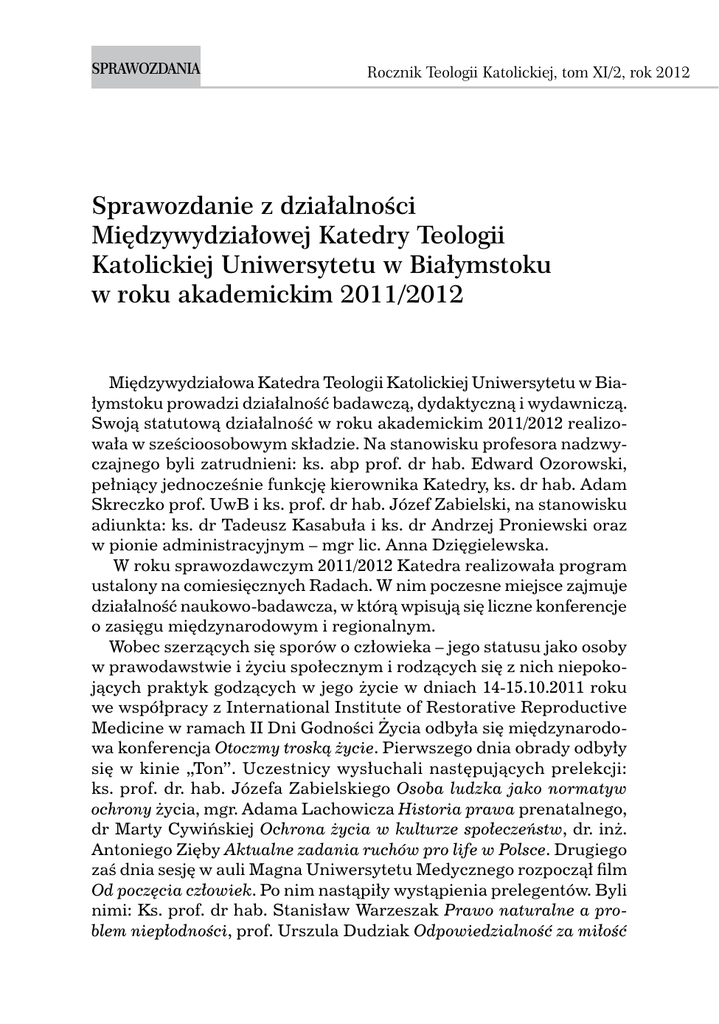 Sprawozdania Rocznik Teologii Katolickiej, tom XI/2, rok 2012 Sprawozdanie z działalności Międzywydziałowej Katedry Teologii Katolickiej Uniwersytetu w Białymstoku w roku akademickim 2011/2012 Międzywydziałowa Katedra Teologii Katolickiej Uniwersytetu w Białymstoku prowadzi działalność badawczą, dydaktyczną i wydawniczą. Swoją statutową działalność w roku akademickim 2011/2012 realizowała w sześcioosobowym składzie. Na stanowisku profesora nadzwyczajnego byli zatrudnieni: ks. abp prof. dr hab. Edward Ozorowski, pełniący jednocześnie funkcję kierownika Katedry, ks. dr hab. Adam Skreczko prof. UwB i ks. prof. dr hab. Józef Zabielski, na stanowisku adiunkta: ks. dr Tadeusz Kasabuła i ks. dr Andrzej Proniewski oraz w pionie administracyjnym – mgr lic. Anna Dzięgielewska. W roku sprawozdawczym 2011/2012 Katedra realizowała program ustalony na comiesięcznych Radach. W nim poczesne miejsce zajmuje działalność naukowo-badawcza, w którą wpisują się liczne konferencje o zasięgu międzynarodowym i regionalnym. Wobec szerzących się sporów o człowieka – jego statusu jako osoby w prawodawstwie i życiu społecznym i rodzących się z nich niepokojących praktyk godzących w jego życie w dniach 14-15.10.2011 roku we współpracy z International Institute of Restorative Reproductive Medicine w ramach II Dni Godności Życia odbyła się międzynarodowa konferencja Otoczmy troską życie. Pierwszego dnia obrady odbyły się w kinie „Ton”. Uczestnicy wysłuchali następujących prelekcji: ks. prof. dr. hab. Józefa Zabielskiego Osoba ludzka jako normatyw ochrony życia, mgr. Adama Lachowicza Historia prawa prenatalnego, dr Marty Cywińskiej Ochrona życia w kulturze społeczeństw, dr. inż. Antoniego Zięby Aktualne zadania ruchów pro life w Polsce. Drugiego zaś dnia sesję w auli Magna Uniwersytetu Medycznego rozpoczął film Od poczęcia człowiek. Po nim nastąpiły wystąpienia prelegentów. Byli nimi: Ks. prof. dr hab. Stanisław Warzeszak Prawo naturalne a problem niepłodności, prof. Urszula Dudziak Odpowiedzialność za miłość Sprawozdania 208 Anna Dzięgielewska i życie – przejawem i warunkiem zdrowia człowieka, prof. med. Wanda Półtawska Czego oczekiwał ojciec święty Jan Paweł II od lekarzy?, prof. Phil Boyle (Irlandia) Naprotechnologia, dr med. Tadeusz Wasilewski Godność i życie ludzkie w leczeniu niepłodności małżeńskiej, prof. dr hab. Alina T. Midro Zaburzenia genetyczne u dzieci, które mogą powstawać po zastosowaniu metody in vitro, mgr Dariusz Wasilewski Ocena skuteczności klinicznej i ekonomicznej in vitro, mgr Agnieszka Pietraszko-Gryń Sytuacja cywilno-prawna dziecka poczętego w następstwie sztucznej prokreacji. Refleksją nad rokiem duszpasterskim pod hasłem Kościół naszym domem stał się zorganizowany w dniu 07.01.2012 roku zjazd kolędowy. Jego tematyka koncentrowała się wokół tegoż zagadnienia. Sympozjum miało miejsce w kinie „Ton”. Uczestnicy mieli okazję wysłuchać o. prof. dr. hab. Andrzeja Napiórkowskiego OSPPE, który wystąpił z prelekcją nt. Teologia roku duszpasterskiego 2011/2012 oraz ks. bp. dr. Józefa Wysockiego, który przygotował referat Ceremoniał rodzinny budowaniem domu Kościoła. W celu wypracowania nowych metod kerygmatycznych w obliczu współczesnych wyzwań duszpasterskich, w dniach 14-15.02.2012 roku zostały zorganizowane warsztaty duszpasterskie dla księży, których motywem przewodnim była Nowa ewangelizacja. Uczestnicy mieli okazję wysłuchać wykładu ks. bp. dr. Edwarda Dajczaka, omawiającego to zagadnienie. Po nim w grupach konwersatoryjnych: ks. mgr. lic. Jerzego Sęczka (Dzieci), ks. dr. Jarosława Grzegorczyka (Młodzież) i ks. dr. Zbigniewa Snarskiego (Dorośli) wypracowywali metody skutecznej ewangelizacji wśród poszczególnych grup wiekowych ludzi. Tematowi relacji nauki i wiary w procesie poznania oraz ich relacjach w kształtowaniu współczesnej moralności społecznej została poświęcona międzynarodowa konferencja Nauka a wiara, zorganizowana w dniach 6-8.03.2012 roku we współpracy z Katedrą Biostruktury, Zakładem Patomorfologii Lekarskiej Uniwersytetu Medycznego w Białymstoku. Miejscem obrad stała się Aula Magna UM. Uczestnicy konferencji byli świadkami prezentacji stanowisk przedstawicieli różnorodnych dyscyplin naukowych. Pierwszego dnia z prelekcjami wystąpili: ks. prof. dr hab. Andrzej Maryniarczyk Nauki przyrodnicze: metafizyka – wiara, zmarły niespełna dwa tygodnie później prof. dr hab. Jerzy Janik Fizyka a problem Boga – pokora fizyka, prof. Józef Dulak Medycyna regeneracyjna w świetle relacji między nauką i wiarą. Następnego dnia uczestnicy wysłuchali referatów: ks. abp. prof. dr. hab. Edwarda Ozorowskiego Anatomia wiary – przyczynek do dialogu nauki z wiarą, prof. dr. hab. Mieczysława Chorążego Złożoność życia – od nauki przyrodniczej do wiary, prof. dr. hab. Stanisława Pużyńskiego Eutanazja – punkt widzenia psychiatry. Ostatni dzień był poświęcony problemom bioetycznym. Referaty wygłosili: ks. bp dr hab. Józef Wróbel prof. KUL Bioetyka a wiara i prof. Mariusz Z. Ratajczak Komórki macierzyste w medycynie regeneracyjnej – nadzieje i zagrożenia. W celu pogłębienia refleksji nad rolą rodziny, 29.03.2012 roku została zorganizowana przy współpracy z Katedrą Pedagogiki Niepaństwowej Wyższej Szkoły Pedagogicznej w Białymstoku konferencja pt. W trosce o współczesną rodzinę. Teoria, badania, pomoc. Wśród licznych wystąpień wykładowców NWSP pracownicy Katedry zaprezentowali referaty: ks. abp prof. dr hab. Edward Ozorowski Teologia wśród nauk o rodzinie, ks. prof. dr hab. Adam Skreczko Pedagogizacja rodziców formą pomocy współczesnej rodzinie. W rocznicowe obchody powstania metropolii białostockiej został wpisany zjazd paschalny pod hasłem Dwudziestolecie metropolii białostockiej, który odbył się 14.04.2012 roku. Miejscem sesji była sala kina