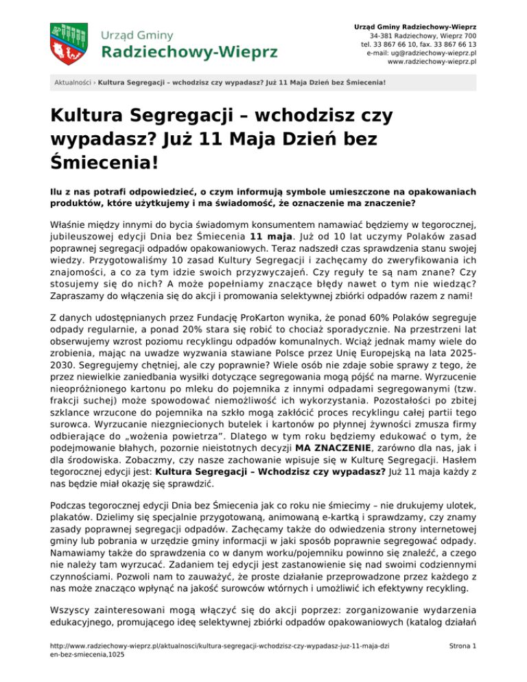 Urząd Gminy Radziechowy-Wieprz 34-381 Radziechowy, Wieprz 700 tel. 33 867 66 10, fax. 33 867 66 13 e-mail: [email protected] www.radziechowy-wieprz.pl Aktualności › Kultura Segregacji – wchodzisz czy wypadasz? Już 11 Maja Dzień bez Śmiecenia! Kultura Segregacji – wchodzisz czy wypadasz? Już 11 Maja Dzień bez Śmiecenia! Ilu z nas potrafi odpowiedzieć, o czym informują symbole umieszczone na opakowaniach produktów, które użytkujemy i ma świadomość, że oznaczenie ma znaczenie? Właśnie między innymi do bycia świadomym konsumentem namawiać będziemy w tegorocznej, jubileuszowej edycji Dnia bez Śmiecenia 11 maja. Już od 10 lat uczymy Polaków zasad poprawnej segregacji odpadów opakowaniowych. Teraz nadszedł czas sprawdzenia stanu swojej wiedzy. Przygotowaliśmy 10 zasad Kultury Segregacji i zachęcamy do zweryfikowania ich znajomości, a co za tym idzie swoich przyzwyczajeń. Czy reguły te są nam znane? Czy stosujemy się do nich? A może popełniamy znaczące błędy nawet o tym nie wiedząc? Zapraszamy do włączenia się do akcji i promowania selektywnej zbiórki odpadów razem z nami! Z danych udostępnianych przez Fundację ProKarton wynika, że ponad 60% Polaków segreguje odpady regularnie, a ponad 20% stara się robić to chociaż sporadycznie. Na przestrzeni lat obserwujemy wzrost poziomu recyklingu odpadów komunalnych. Wciąż jednak mamy wiele do zrobienia, mając na uwadze wyzwania stawiane Polsce przez Unię Europejską na lata 20252030. Segregujemy chętniej, ale czy poprawnie? Wiele osób nie zdaje sobie sprawy z tego, że przez niewielkie zaniedbania wysiłki dotyczące segregowania mogą pójść na marne. Wyrzucenie nieopróżnionego kartonu po mleku do pojemnika z innymi odpadami segregowanymi (tzw. frakcji suchej) może spowodować niemożliwość ich wykorzystania. Pozostałości po zbitej szklance wrzucone do pojemnika na szkło mogą zakłócić proces recyklingu całej partii tego surowca. Wyrzucanie niezgniecionych butelek i kartonów po płynnej żywności zmusza firmy odbierające do „wożenia powietrza”. Dlatego w tym roku będziemy edukować o tym, że podejmowanie błahych, pozornie nieistotnych decyzji MA ZNACZENIE, zarówno dla nas, jak i dla środowiska. Zobaczmy, czy nasze zachowanie wpisuje się w Kulturę Segregacji. Hasłem tegorocznej edycji jest: Kultura Segregacji – Wchodzisz czy wypadasz? Już 11 maja każdy z nas będzie miał okazję się sprawdzić. Podczas tegorocznej edycji Dnia bez Śmiecenia jak co roku nie śmiecimy – nie drukujemy ulotek, plakatów. Dzielimy się specjalnie przygotowaną, animowaną e-kartką i sprawdzamy, czy znamy zasady poprawnej segregacji odpadów. Zachęcamy także do odwiedzenia strony internetowej gminy lub pobrania w urzędzie gminy informacji w jaki sposób poprawnie segregować odpady. Namawiamy także do sprawdzenia co w danym worku/pojemniku powinno się znaleźć, a czego nie należy tam wyrzucać. Zadaniem tej edycji jest zastanowienie się nad swoimi codziennymi czynnościami. Pozwoli nam to zauważyć, że proste działanie przeprowadzone przez każdego z nas może znacząco wpłynąć na jakość surowców wtórnych i umożliwić ich efektywny recykling. Wszyscy zainteresowani mogą włączyć się do akcji poprzez: zorganizowanie wydarzenia edukacyjnego, promującego ideę selektywnej zbiórki odpadów opakowaniowych (katalog działań http://www.radziechowy-wieprz.pl/aktualnosci/kultura-segregacji-wchodzisz-czy-wypadasz-juz-11-maja-dzi en-bez-smiecenia,1025 Strona 1 Urząd Gminy Radziechowy-Wieprz 34-381 Radziechowy, Wieprz 700 tel. 33 867 66 10, fax. 33 867 66 13 e-mail: [email protected] www.radziechowy-wieprz.pl Aktualności › Kultura Segregacji – wchodzisz czy wypadasz? Już 11 Maja Dzień bez Śmiecenia! i propozycji wydarzeń jest do pobrania pod linkiem www.dzienbezsmiecenia.pl/edukacja/materialy-do-pobrania), udostępnienie infografik, podzielenie się/przesłanie do znajomych, partnerów, kontrahentów e-kartki w okolicach 11 maja oraz umieszczenie jej na swojej stronie internetowej. Sprawdź, po której stronie Kultury Segregacji jesteś. Dowiedz się więcej na: www.dzienbezsmiecenia.pl oraz www.facebook.com/dzienbezscmiecenia. Więcej informacji: Anna Kamińska Specjalista ds. Komunikacji Marketingowej [email protected] + 22 550 09 78 *Dzień bez Śmiecenia - World non-waste Day to pomysł wypracowany przez młodzież z kilkunastu krajów współdziałających w ramach międzynarodowego programu „Europejski EkoParlament Młodzieży”, przedsięwzięcia firmowanego przez PRO EUROPE (organizację zrzeszającą działające w ramach systemu Zielonego Punktu organizacje odzysku), a koordynowanego i sponsorowanego w Polsce przez Rekopol. Współorganizatorami akcji są Akcjonariusze spółki. Kampania jest elementem projektu „Kultura Segregacji” prowadzonego przez Rekopol Organizację Odzysku Opakowań S.A. w ramach publicznych kampanii edukacyjnych. Poznaj 10 Zasad Kultury Segregacji: 1. Przetworzenie ma znaczenie! – Segregując dajesz odpadom szansę na drugie życie. Ponadto zmniejszasz zanieczyszczenie środowiska poprzez zmniejszenie ilości odpadów deponowanych na składowiskach. Dzięki recyklingowi osiągamy niższe koszty produkcji nawet o 60%, ograniczamy zanieczyszczenie powietrza, gleby, wody, emisję gazów cieplarnianych, produkcję odpadów przemysłowych. Użycie surowców wtórnych przekłada się w procesie produkcyjnym na obniżenie zużycia energii w porównaniu do procesu opartego na surowcach pierwotnych o 95% w przypadku aluminium, o 85% przy wykorzystaniu miedzi, o 80% przy tworzywach sztucznych, 74% przy stali, 65% przy papierze i 30% w przypadku szkła! 2. Zgniecenie ma znaczenie! – Zgniataj puszki i butelki przed wyrzuceniem. Zgnieciona butelka zajmuje 80% miejsca mniej. Dzięki temu rzadziej możesz wynosić odpady ze swojego domu, a firmy odbierające nie muszą wozić powietrza. 3. Odkręcenie ma znaczenie! – Wy