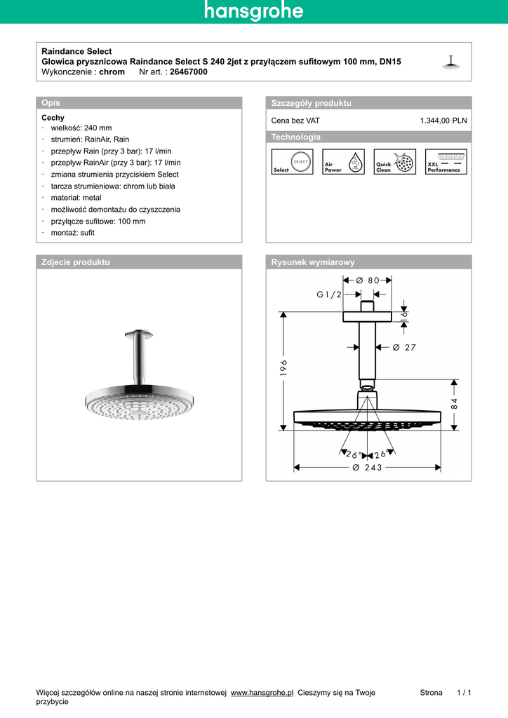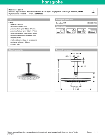 Raindance Select Głowica prysznicowa Raindance Select S 240 2jet z przyłączem sufitowym 100 mm, DN15 Wykonczenie : chrom___Nr art. : 26467000 Opis Szczegóły produktu Cechy · wielkość: 240 mm Cena bez VAT · strumień: RainAir, Rain 1.344,00-PLN Technologia · przepływ Rain (przy 3 bar): 17 l/min · przepływ RainAir (przy 3 bar): 17 l/min · zmiana strumienia przyciskiem Select · tarcza strumieniowa: chrom lub biała · materiał: metal · możliwość demontażu do czyszczenia · przyłącze sufitowe: 100 mm · montaż: sufit Zdjecie produktu Rysunek wymiarowy Więcej szczegółów online na naszej stronie internetowej_www.hansgrohe.pl_Cieszymy się na Twoje przybycie Strona 1/1