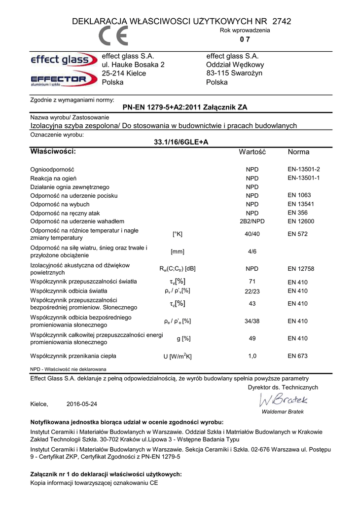 DEKLARACJA WŁAŚCIWOŚCI UŻYTKOWYCH NR 2742 Rok wprowadzenia 07 effect glass S.A. ul. Hauke Bosaka 2 25-214 Kielce Polska effect glass S.A. Oddział Wędkowy 83-115 Swarożyn Polska Zgodnie z wymaganiami normy: PN-EN 1279-5+A2:2011 Załącznik ZA Nazwa wyrobu/ Zastosowanie Izolacyjna szyba zespolona/ Do stosowania w budownictwie i pracach budowlanych Oznaczenie wyrobu: 33.1/16/6GLE+A Właściwości: Wartość Norma Ognioodporność Reakcja na ogień Działanie ognia zewnętrznego Odporność na uderzenie pocisku Odporność na wybuch Odporność na ręczny atak Odporność na uderzenie wahadłem NPD NPD NPD NPD NPD NPD 2B2/NPD EN-13501-2 EN-13501-1 Odporność na różnice temperatur i nagłe zmiany temperatury [°K] 40/40 [mm] 4/6 Rw(C;Ctr) [dB] NPD Odporność na siłę wiatru, śnieg oraz trwałe i przyłożone obciążenie Izolacyjność akustyczna od dźwiękow powietrznych Współczynnik przepuszczalności światła Współczynnik odbicia światła Współczynnik przepuszczalności bezpośredniej promieniow. Słonecznego Współczynnik odbicia bezpośredniego promieniowania słonecznego Współczynnik całkowitej przepuszczalności energi promieniowania słonecznego Współczynnik przenikania ciepła EN 1063 EN 13541 EN 356 EN 12600 EN 572 EN 12758 τv[%] 71 ρv / ρ’v[%] 22/23 EN 410 EN 410 τe[%] 43 EN 410 ρe / ρ’e [%] 34/38 EN 410 g [%] 49 EN 410 U [W/m2K] 1,0 EN 673 NPD - Właściwość nie deklarowana Effect Glass S.A. deklaruje z pełną odpowiedzialnością, że wyrób budowlany spełnia powyższe parametry Dyrektor ds. Technicznych Kielce, 2016-05-24 Waldemar Bratek Notyfikowana jednostka biorąca udział w ocenie zgodności wyrobu: Instytut Ceramiki i Materiałów Budowlanych w Warszawie. Oddział Szkła i Matrriałów Budowlanych w Krakowie Zakład Technologii Szkła. 30-702 Kraków ul.Lipowa 3 - Wstępne Badania Typu Instytut Ceramiki i Materiałów Budowlanych w Warszawie. Sekcja Ceramiki i Szkła. 02-676 Warszawa ul. Postępu 9 - Certyfikat ZKP, Certyfikat Zgodności z PN-EN 1279-5 Załącznik nr 1 do deklaracji właściwości użytkowych: Kopia informacji towarzyszącej oznakowaniu CE