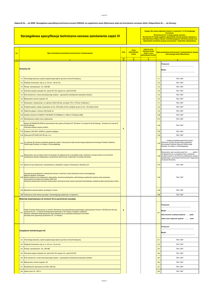 Część IV Załącznik Nr…..do SIWZ- Szczegółowa specyfikacja techniczno-cenowa (UWAGA: po wypełnieniu przez Wykonawcę staje się formularzem cenowym oferty i Załącznikiem Nr….. do Umowy). Uwaga: Nie można edytować kolumn o numerach I, II i III niniejszego formularza. W kolumnach IV, V należy wpisać wartości. W kolumnie VI należy wypełnić odpowiednie wiersze poprzez wpisanie w wykropkowane miejsca danych charakteryzujących oferowany sprzęt oraz odpowiednie skreślenie pozycji oznaczonych * (wykreślić niepotrzebne). Szczegółowa specyfikacja techniczno-cenowa zamówienia część IV Lp. Opis minimalnych parametrów technicznych i funkcjonalnych I II ilość Cena jednostkowa brutto szt. III zł IV Łączna cena ofertowa brutto Opis parametrów technicznych i funkcjonalnych sprzętu (ilość x cena oferowanego przez Wykonawcę. jednostkowa brutto) zł V VI Producent: ……………………………………………………… Drukarka A4 Model: ……………………………………………………….. 1.1 Technologia laserowa, system pojedynczego bębna; typ druku monochromatyczny. 1.1 TAK / NIE * 1.2 Prędkość drukowania, tryb cz.-b. A4 min.: 48 str./min., 1.2 TAK / NIE * 1.3 Pamięć: zainstalowane min. 256 MB; 1.3 TAK / NIE * 1.4 Gramatura papieru (kaseta) min. (g/m2) 60-120, bypass min. (g/m2) 60-200 1.4 TAK / NIE * 1.5 Druk dwustronny: moduł automatycznego duplexu - wyposażenie standardowe (wewnątrz drukarki). 1.5 TAK / NIE * 1.6 Maksymalny rozmiar oryginału: A4 1.6 TAK / NIE * 1.7 Drukowanie: rozdzielczości: co najmniej 1200x1200 dpi; emulacje: PCL 6, PCL5e, PostScript 3; 1.7 TAK / NIE * 1.8 Podajniki papieru: kaseta uniwersalna na min. 500 kartek A4-A5 i podajnik ręczny na min. 100 kartek A4-A6. 1.8 TAK / NIE * 1.9 Odbiornik papieru: minimum 250 kartek A4 1.9 TAK / NIE * 1.10 Interfejs: Ethernet (10 BASE-T/100 BASE-TX/1000Base-T), USB 2.0 (Hi-Speed USB), 1.10 TAK / NIE * 1.11 Zainstalowane polskie menu użytkownika. 1.11 TAK / NIE * 1.12 TAK / NIE * 1.13 Zasilanie: 220-240V, 50/60Hz, przewód zasilający. 1.13 TAK / NIE * 1.14 Patchcord UTP RJ45 CAT.5E min. 5 m. 1.14 TAK / NIE * Nośnik CD-ROM/DVD-ROM ze sterownikami dla systemu Windows XP, Windows 7 (w wersji 32 lub 64 bitowej), Windows 8 (w wersji 32 1.12 lub 64 bitowej), Instrukcja obsługi w języku polskim. 1 1.15 5 Co najmniej 36 miesięcy bezpłatnej gwarancji (części i robocizna) od daty obustronnego podpisania Końcowego Protokołu ZdawczoOdbiorczego Dostawy, na miejscu u Zamawiającego. 1.15 ………. miesięcy bezpłatnej gwarancji (części i robocizna) od daty obustronnego podpisania Końcowego Protokołu Zdawczo-Odbiorczego Dostawy, na miejscu u Zamawiającego. Maksymalny czas usunięcia awarii do 48 godzin od zgłoszenia lub w przypadku braku możliwości usunięcia awarii w w/w terminie 1.16 podstawienie sprzętu zastępczego o parametrach technicznych niegorszych niż sprzęt oferowany. Maksymalny czas usunięcia awarii do ………. godzin od zgłoszenia lub w przypadku braku możliwości 1.16 usunięcia awarii w w/w terminie podstawienie sprzętu zastępczego o parametrach technicznych niegorszych niż sprzęt oferowany. 1.17 Sprzęt ma być dostarczony i zainstalowany w siedzibach urzędu tj: Warszawa pl. Bankowy 3/5 1.17 TAK / NIE * Wymaga się przeszkolenia z obsługi technicznej co najmniej 3 osób wskazanych przez zamawiającego. Miejsce szkolenia: Warszawa 1.18 Zakres szkolenia musi obejmować: diagnostykę, wymianę podzespołów, administrację urządzeniem poprzez kody serwisowe. Czas trwania nie krótszy niż 8 godzin (420 min). Szkolenie potwierdzone imiennym dokumentem ukończenia przez serwis producenta oferowanego urządzenia bądź autoryzowany serwis. 1.18 TAK / NIE * 1.19 Niezależna wymiana bębna ,developera i tonera. 1.19 TAK / NIE * 1.20 Uszkodzony dysk twardy pozostaje u Zamawiającego (jeżeli jest w urządzeniu). 1.20 TAK / NIE * Materiały eksploatacyjne do drukarki A4 (o parametrach powyżej) Producent: ………………………………………………… 2 2.1 Pakiet Tonerów dostarczanych (w ramach oferowanej ceny jednostkowej) zapewniający wydrukowanie minimum 150 000 stron A4 przy zaczernieniu 5%, w okresie obowiązywania gwarancji tj. 36 miesięcy na jednym urządzeniu. Dostawy materiałów eksploatacyjnych będą odbywały się na podstawie oddzielnych zamówień. Na każdy toner gwarancja producenta min. 12 miesięcy. 5 Model: ………………………………………………… 2.1 Ilość tonerów w jednym pakiecie … sztuk Jeden toner zapewnia wydruk: …… stron Producent: ……………………………………………………… Urządzenie wielofunkcyjne A4 Model: ……………………………………………………….. 3.1 Technologia laserowa, system pojedynczego bębna; typ druku monochromatyczny. 3.1 TAK / NIE * 3.2 Prędkość drukowania, tryb cz.-b. A4 min.: 30 str./min., 3.2 TAK / NIE * 3.3 Pamięć: zainstalowane min. 256 MB; 3.3 TAK / NIE * 3.4 Gramatura papieru (kaseta) min. (g/m2) 60-120, bypass min. (g/m2) 60-200 3.4 TAK / NIE * 3.5 Druk dwustronny: moduł automatycznego duplexu - wyposażenie standardowe (wewnątrz drukarki). 3.5 TAK / NIE * 3.6 Maksymalny rozmiar oryginału: A4 3.6 TAK / NIE * 3.7 Rozdzielczośc skanowania min 600 x 600 dpi 3.7 TAK / NIE * 3.8 zakres zoom 25 - 400 % 3.8 TAK / NIE * Strona 1 Część IV 3.9 TAK / NIE * 3.10 Podajniki papieru: kaseta uniwersalna na min. 250 kartek A4-A5 i podajnik ręczny na min. 50 kartek A4-A6. 3.10 TAK / NIE * 3.11 Odbiornik papieru: minimum 100 kartek A4 3.11 TAK / NIE * 3.12 TAK / NIE * 3.13 TAK / NIE * 3.14 TAK / NIE * 3.15 Zasilanie: 220-240V, 50/60Hz, przewód zasilający. 3.15 TAK / NIE * 3.16 Patchcord UTP RJ45 CAT.5E min. 5 m. 3.16 TAK / NIE * 3.9 Drukowanie: rozdzielczości: co najmniej 600x600 dpi; emulacje: PCL 6, PCL5e, PostScript 3; 3.12 Interfejs: Ethernet (10 BASE-T/100 BASE-TX/1000Base-T), USB 2.0 (Hi-Speed USB), 8 3 3.13 