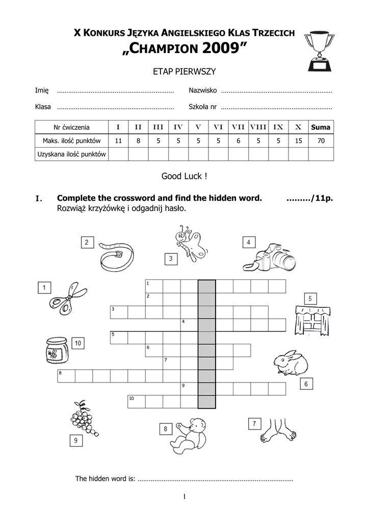 X KONKURS JĘZYKA ANGIELSKIEGO KLAS TRZECICH „CHAMPION 2009” ETAP PIERWSZY Imię ……………………………………………………… Nazwisko …………………………………………………… Klasa ……………………………………………………… Szkoła nr …………………………………………………… Nr ćwiczenia I II III IV V VI Maks. ilość punktów 11 8 5 5 5 5 VII VIII IX 6 5 5 X Suma 15 70 Uzyskana ilość punktów Good Luck ! I. Complete the crossword and find the hidden word. Rozwiąż krzyżówkę i odgadnij hasło. ………/11p. 1 2 3 4 5 6 7 8 9 10 The hidden word is: ………………………………………………………………………… 1 II. Find the names of five months. Znajdź nazwy pięciu miesięcy. ………/5p. Example: P R A I L - A P R I L 1. EMDECBRE - ……………………………………………………………… 2. EFRBURAY - ……………………………………………………………… 3. RCHMA - ……………………………………………………………… 4. NJUE - ……………………………………………………………… 5. ATUSGU - ……………………………………………………………… III. What time is it? Która jest godzina? ………/5p. 1. Example: …………………………………………………… It’s ten o’clock 2. 3. …………………………………………………… …………………………………………………… 4. 5. …………………………………………………… …………………………………………………… 2 IV. Complete the questions with the correct words from the box. Uzupełnij pytania odpowiednimi słowami z ramki. ………/5p. What time When Example: How What Where How Who are you? I’m fine, thanks. 1. …………………………… is your English teacher? Miss Bell. 2. …………………………… is the weather like? It’s sunny. 3. …………………………… do you usually get up? At seven. 4. …………………………… is your birthday? On 1st October. 5. …………………………… do you live? In London. V. Write the numbers. Napisz liczby. Example: ………/5p. twenty-six ………………………… …………………………………… …………………………………… ....................................... …………………… 3 Circle the odd one out. Zakreśl słowo, które nie pasuje do pozostałych. VI. Example: yellow pig red green ………/5p. blue 1. sharpener crayon desk glue rubber 2. cucumber onion tomato peach carrot 3. cupboard roof sofa wardrobe armchair 4. arm leg shoulder head scarf 5. tail donkey seal camel lion VII. Write the names of six sport disciplines. Wpisz nazwy sześciu dyscyplin sportowych. ………/6p. Example: football 4. ____________________ 1. ____________________ 5. 2. ____________________ ____________________ 6. 3. ____________________ ____________________ 4 VIII. Write the words with the opposite meaning. Dopisz słowa o przeciwnym znaczeniu. ………/8p. Example: bad – good 1. thin - …………………………………………… 5. dry - …………………………………………… 2. beautiful - …………………………………………… 6. slow - …………………………………………… 3. happy - …………………………………………… 7. rich - …………………………………………… 4. clean - …………………………………………… 8. difficult - …………………………………………… IX. Complete the table. Uzupełnij tabelę. ………/5p. Singular (liczba pojedyncza) Example: X. Plural (liczba mnoga) box boxes mouse ………………………………………… ………………………………………… women bookshelf ………………………………………… ………………………………………… geese pony ………………………………………… Choose the correct answer Wybierz właściwą odpowiedź. Example: ………/15p. He …………… six years old. a) has b) is c) be 1. …………… is your brother’s name? a) Whose b) What c) Who 2. Tomorrow is Monday. Today is …………… a) Tuesday b) Friday c) Sunday 5 3. Where …………… she come from? a) does b) do c) is a) watches b) watch c) is watching 4. Susan …………… cartoons at the moment. 5. Our music lessons are …………… Wednesday. a) in b) at c) on 6. Kangaroos can …………… very high. a) jumping b) jump c) jumps 7. Philip and I …………… cousins. a) am b) are c) is 8. France is …………… than Spain. a) the biggest b) more bigger c) bigger 9. I don’t like …………… to classical music. a) listening b) listen c) listened 10. My flat is on the …………… floor. a) four b) fourth c) fourteen 11. This is Paula and that is …………… doll. a) hers b) her c) she 12. The bank is …………… to the theatre. a) behind b) next c) opposite 13. What …………… you do last weekend? a) did b) do c) does 14. How …………… sugar have you got? a) many b) any c) much 15. Robert goes to work …………… foot. a) on b) by c) with Thank You. See you soon! 6