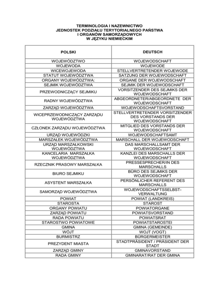 TERMINOLOGIA I NAZEWNICTWO JEDNOSTEK PODZIAŁU TERYTORIALNEGO PAŃSTWA I ORGANÓW SAMORZĄDOWYCH W JĘZYKU NIEMIECKIM POLSKI DEUTSCH WOJEWÓDZTWO WOJEWODA WICEWOJEWODA STATUT WOJEWÓDZTWA ORGANY WOJEWÓDZTWA: SEJMIK WOJEWÓDZTWA WOJEWODSCHAFT WOJEWODE STELLVERTRETENDER WOJEWODE SATZUNG DER WOJEWODSCHAFT ORGANE DER WOJEWODSCHAFT SEJMIK DER WOJEWODSCHAFT VORSITZENDER DES SEJMIKS DER WOJEWODSCHAFT ABGEORDNETER/ABGEORDNETE DER WOJEWODSCHAFT WOJEWODSCHAFTSVORSTAND STELLVERTRETENDER VORSITZENDER DES VORSTANDS DER WOJEWODSCHAFT MITGLIED DES VORSTANDS DER WOJEWODSCHAFT WOJEWODSCHAFTSAMT MARSCHALL DER WOJEWODSCHAFT DAS MARSCHALLSAMT DER WOJEWODSCHAFT KANZLEI DES MARSCHALLS DER WOJEWODSCHAFT PRESSESPRECHER/IN DES MARSCHALLS BÜRO DES SEJMIKS DER WOJEWODSCHAFT PERSÖNLICHER REFERENT DES MARSCHALLS WOJEWODSCHAFTSSELBSTVERWALTUNG POWIAT (LANDKREIS) STAROST POWIATORGANE POWIATSVORSTAND POWIATSRAT POWIATSTAROSTEI GMINA (GEMEINDE) WOJT (VOGT) BÜRGERMEISTER STADTPRÄSIDENT / PRÄSIDENT DER STADT GMINAVORSTAND GMINARAT/RAT DER GMINA PRZEWODNICZĄCY SEJMIKU RADNY WOJEWÓDZTWA ZARZĄD WOJEWÓDZTWA WICEPRZEWODNICZĄCY ZARZĄDU WOJEWÓDZTWA CZŁONEK ZARZĄDU WOJEWÓDZTWA URZĄD WOJEWÓDZKI MARSZAŁEK WOJEWÓDZTWA URZĄD MARSZAŁKOWSKI WOJEWÓDZTWA KANCELARIA MARSZAŁKA WOJEWÓDZTWA RZECZNIK PRASOWY MARSZAŁKA BIURO SEJMIKU ASYSTENT MARSZAŁKA SAMORZĄD WOJEWÓDZTWA POWIAT STAROSTA ORGANY POWIATU ZARZĄD POWIATU RADA POWIATU STAROSTWO POWIATOWE GMINA WÓJT BURMISTRZ PREZYDENT MIASTA ZARZĄD GMINY RADA GMINY URZĄD GMINY SOŁTYS GMINAAMT SOLTYS (SCHULTHEIß) NAZWY WOJEWÓDZTW WOJEWÓDZTWO WOJEWODSCHAFT DOLNOŚLĄSKIE DOLNOŚLĄSKIE WOJEWODSCHAFT KUJAWSKO-POMORSKIE WOJEWODSCHAFT LUBELSKIE WOJEWODSCHAFT LUBUSKIE WOJEWODSCHAFT ŁÓDZKIE WOJEWODSCHAFT MAŁOPOLSKIE WOJEWODSCHAFT MAZOWIECKIE WOJEWODSCHAFT OPOLSKIE WOJEWODSCHAFT PODKARPACKIE WOJEWODSCHAFT PODLASKIE WOJEWODSCHAFT POMORSKIE WOJEWODSCHAFT ŚLĄSKIE WOJEWODSCHAFT ŚWIĘTOKRZYSKIE WOJEWODSCHAFT WARMIŃSKO-MAZURSKIE WOJEWODSCHAFT WIELKOPOLSKIE WOJEWODSCHAFT ZACHODNIOPOMORSKIE WOJEWODSCHAFT KUJAWSKO – POMORSKIE LUBELSKIE LUBUSKIE ŁÓDZKIE MAŁOPOLSKIE MAZOWIECKIE OPOLSKIE PODKARPACKIE PODLASKIE POMORSKIE ŚLĄSKIE ŚWIĘTOKRZYSKIE WARMIŃSKO - MAZURSKIE WIELKOPOLSKIE ZACHODNIOPOMORSKIE