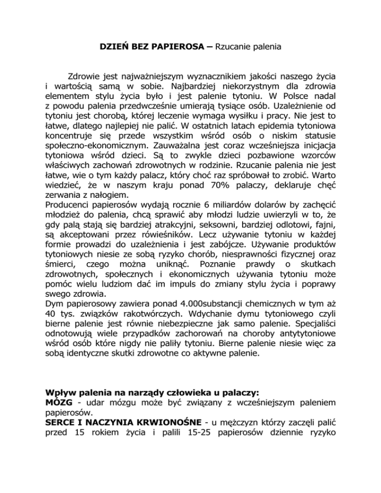 DZIEŃ BEZ PAPIEROSA – Rzucanie palenia Zdrowie jest najwaŜniejszym wyznacznikiem jakości naszego Ŝycia i wartością samą w sobie. Najbardziej niekorzystnym dla zdrowia elementem stylu Ŝycia było i jest palenie tytoniu. W Polsce nadal z powodu palenia przedwcześnie umierają tysiące osób. UzaleŜnienie od tytoniu jest chorobą, której leczenie wymaga wysiłku i pracy. Nie jest to łatwe, dlatego najlepiej nie palić. W ostatnich latach epidemia tytoniowa koncentruje się przede wszystkim wśród osób o niskim statusie społeczno-ekonomicznym. ZauwaŜalna jest coraz wcześniejsza inicjacja tytoniowa wśród dzieci. Są to zwykle dzieci pozbawione wzorców właściwych zachowań zdrowotnych w rodzinie. Rzucanie palenia nie jest łatwe, wie o tym kaŜdy palacz, który choć raz spróbował to zrobić. Warto wiedzieć, Ŝe w naszym kraju ponad 70% palaczy, deklaruje chęć zerwania z nałogiem. Producenci papierosów wydają rocznie 6 miliardów dolarów by zachęcić młodzieŜ do palenia, chcą sprawić aby młodzi ludzie uwierzyli w to, Ŝe gdy palą stają się bardziej atrakcyjni, seksowni, bardziej odlotowi, fajni, są akceptowani przez rówieśników. Lecz uŜywanie tytoniu w kaŜdej formie prowadzi do uzaleŜnienia i jest zabójcze. UŜywanie produktów tytoniowych niesie ze sobą ryzyko chorób, niesprawności fizycznej oraz śmierci, czego moŜna uniknąć. Poznanie prawdy o skutkach zdrowotnych, społecznych i ekonomicznych uŜywania tytoniu moŜe pomóc wielu ludziom dać im impuls do zmiany stylu Ŝycia i poprawy swego zdrowia. Dym papierosowy zawiera ponad 4.000substancji chemicznych w tym aŜ 40 tys. związków rakotwórczych. Wdychanie dymu tytoniowego czyli bierne palenie jest równie niebezpieczne jak samo palenie. Specjaliści odnotowują wiele przypadków zachorowań na choroby antytytoniowe wśród osób które nigdy nie paliły tytoniu. Bierne palenie niesie więc za sobą identyczne skutki zdrowotne co aktywne palenie. Wpływ palenia na narządy człowieka u palaczy: MÓZG - udar mózgu moŜe być związany z wcześniejszym paleniem papierosów. SERCE I NACZYNIA KRWIONOŚNE - u męŜczyzn którzy zaczęli palić przed 15 rokiem Ŝycia i palili 15-25 papierosów dziennie ryzyko wystąpienia choroby wieńcowej jest 10 krotnie większe. Palacze tytoniu częściej umierają na zawał mięśnia sercowego. PŁUCA - palacze tytoniu 20 krotnie częściej umierają na raka płuc i przewlekłego zapalenia oskrzeli niŜ osoby nie palące. NERKI I PĘCHERZ MOCZOWY - istnieje udowodniony związek pomiędzy paleniem tytoniu a zapadalnością na raka pęcherza i nerek. śOŁĄDEK I DWUNASTNICA - palenie tytoniu pełni istotną rolę w powstawaniu zarówno wrzodów Ŝołądka jak i dwunastnicy. Ryzyko wystąpienia raka Ŝołądka jest wyŜsze u palaczy tytoniu 1,5 razy. Palenie tytoniu nie tylko naraŜa nas na utratę zdrowia ale i pogarsza wygląd skóry. Wcześniej występują zmarszczki, opóźnia się gojenie ran, zaostrza stan wielu schorzeń skóry. Dermatolodzy mówią „ tytoniową twarz” łatwiej rozpoznać na pierwszy rzut oka. Pamiętaj kaŜdy papieros niszczy Twoje zdrowie. KaŜdego roku rodzi się w Polsce 120-140 dzieci, których matki paliły w czasie ciąŜy. Jeszcze nie jest za późno, aby rzucić palenie. Potrzebujesz wsparcia zadzwoń do Telefonicznej Poradni Pomocy Niepalącym tel. 0 801 108 108 Opracowały: Dorota Sawicka Helena Snarska