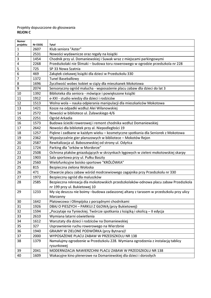 Projekty dopuszczone do głosowania REJON C Numer projektu Nr ESOG 29 1233 30 31 32 33 34 35 36 37 38 1642 1926 1594 2610 1612 327 1940 2000 1379 39 40 2041 1609 1 2 3 4 5 6 7 8 9 10 11 12 13 14 15 16 17 18 19 20 21 22 23 24 25 26 27 28 2607 2531 1454 2268 725 469 1372 1696 2074 1392 1912 1513 1421 2572 2251 1573 2642 1257 2362 2587 1724 2508 1903 2560 815 471 1972 2585 Tytuł Klub seniora "Aster" Nowości wydawnicze oraz regały na książki Chodnik przy ul. Domaniewskiej i Suwak wraz z miejscami parkingowymi Przedszkolaki nie Ślimaki – budowa toru rowerowego w ogrodzie przedszkola nr 228 SP 33 Nowa Szatnia Zakątek ciekawej książki dla dzieci w Przedszkolu 330 Tunel Baseballowy Życzliwość wobec kobiet w ciąży dla mieszkanek Mokotowa Sensoryczny ogród malucha - wyposażenie placu zabaw dla dzieci do lat 3 Biblioteka dla seniora - mówiące i powiększone książki e-XXI - studio wiedzy dla dzieci i rodziców Wolna wola – nauka odpierania manipulacji dla mieszkańców Mokotowa Kosze na odpadki wzdłuż Alei Wilanowskiej Nowości w bibliotece ul. Żuławskiego 4/6 Ogród Arkadia Budowa ścieżki rowerowej i remont chodnika wzdłuż Domaniewskiej Nowości dla bibliotek przy al. Niepodległości 19 Piękne i zadbane w każdym wieku – kosmetyczne spotkania dla Seniorek z Mokotowa Wypożyczalnie gier planszowych w bibliotece – Mokotów Rejon Rewitalizacja ul. Baboszewskiej od strony ul. Odyńca Parking dla "orków w Mordorze" Ochrona ptaków gniazdujących w skrzynkach lęgowych w zieleni mokotowskiej skarpy Sala sportowa przy ul. Pułku Baszty Wielofunkcyjne boisko sportowe "KRÓLÓWKA" Bezpieczna zielona Wołoska Otwarcie placu zabaw wśród modrzewiowego zagajnika przy Przedszkolu nr 330 Bezpieczny ogród dla maluszków Bezpieczna rekreacja dla mokotowskich przedszkolaków-odnowa placu zabaw Przedszkola nr 199 przy ul. Bukietowej 10 My się deszczu nie boimy –budowa zadaszonej altany z tarasem w przedszkolu przy ulicy Marzanny Płatowcowa i Olimpijska z porządnymi chodnikami DBAJ O PIESZYCH – PARKUJ Z GŁOWĄ (przy Bukietowej) „Poczytaje na Tynieckiej. Twórcze spotkania z książką i okolicą – II edycja Wymiana latarni oświetlenia Warsztaty dla dzieci i rodziców na Domaniewskiej Usprawnienie ruchu rowerowego na Wierzbnie GRAJMY W ZIELONE PODWÓRKA (przy Bytnara)! WYPOSAŻENIE PLACU ZABAW W PRZEDSZKOLU NR 138 Namalujmy ogrodzenie w Przedszkolu 228. Wymiana ogrodzenia z instalacją tablicy rysunkowej MODERNIZACJA NAWIERZCHNI PLACU ZABAW W PRZEDSZKOLU NR 138 Wakacyjne kino plenerowe na Domaniewskiej dla dzieci i dorosłych
