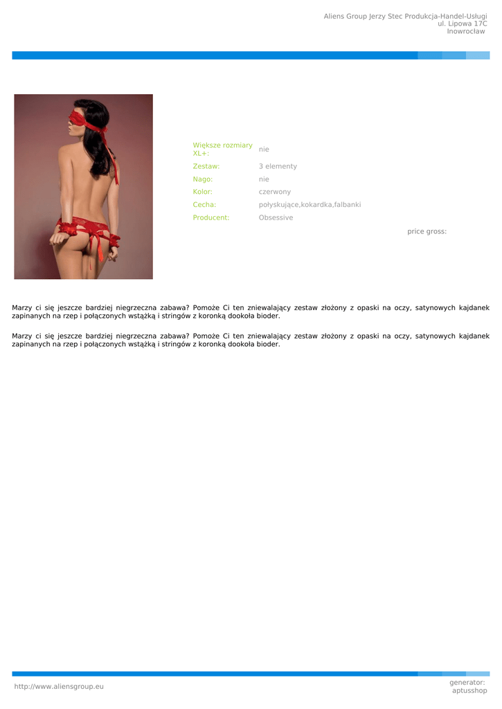 Aliens Group Jerzy Stec Produkcja-Handel-Usługi ul. Lipowa 17C Inowrocław Większe rozmiary nie XL+: Zestaw: 3 elementy Nago: nie Kolor: czerwony Cecha: połyskujące,kokardka,falbanki Producent: Obsessive price gross: Marzy ci się jeszcze bardziej niegrzeczna zabawa? Pomoże Ci ten zniewalający zestaw złożony z opaski na oczy, satynowych kajdanek zapinanych na rzep i połączonych wstążką i stringów z koronką dookoła bioder. Marzy ci się jeszcze bardziej niegrzeczna zabawa? Pomoże Ci ten zniewalający zestaw złożony z opaski na oczy, satynowych kajdanek zapinanych na rzep i połączonych wstążką i stringów z koronką dookoła bioder. http://www.aliensgroup.eu generator: aptusshop