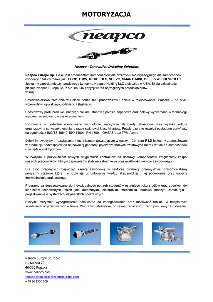 MOTORYZACJA Neapco - Innovative Driveline Solutions Neapco Europe Sp. z o.o. jest producentem komponentów dla przemysłu motoryzacyjnego dla samochodów osobowych takich marek jak : FORD, BMW, MERCEDES, VOLVO, SMART, MINI, OPEL, VW, CHEVROLET. Jesteśmy częścią międzynarodowego koncernu Neapco Holding LLC z siedzibą w USA. Skala działalności plasuje Neapco Europe Sp. z o.o. na 345 pozycji wśród największych przedsiębiorstw w kraju. Przedsiębiorstwo zatrudnia w Polsce ponad 800 pracowników i działa w miejscowości województw: opolskiego, łódzkiego i śląskiego. Praszka – na styku Podstawowy profil produkcji naszego zakładu stanowią półosie napędowe oraz odlewy wytwarzane w technologii wysokociśnieniowego wtrysku aluminium. Stosowane w zakładzie nowoczesne technologie, najwyższe standardy jakościowe oraz wysoka kultura organizacyjna są wysoko oceniane przez światowej klasy klientów. Potwierdzają to również posiadane certyfikaty na zgodność z ISO/TS 16949, ISO 14001, PN 18001, OHSAS oraz TPM Award. Dzięki innowacyjnym rozwiązaniom technicznym powstającym w naszym Centrum R&D jesteśmy zaangażowani w produkcję podzespołów do najnowszej generacji pojazdów znanych światowych marek w tym do samochodów o napędzie elektrycznym. W związku z pozyskaniem nowych długoletnich kontraktów na dostawy komponentów zwiększamy zespół naszych pracowników, którym zapewniamy stabilne zatrudnienie oraz możliwość rozwoju zawodowego. Dla osób pragnących rozpocząć karierę zawodową w sektorze produkcji przemysłowej przygotowaliśmy programy stażowe które umożliwiają ugruntowanie wiedzy akademickiej , jej pogłębienie oraz nabycie doświadczenia praktycznego. Programy są dopasowywane do indywidualnych potrzeb studentów ostatniego roku studiów oraz absolwentów kierunków technicznych takich jak: automatyka, elektronika, mechanika, budowa maszyn, metalurgia , projektowanie w systemach inżynierskich i pokrewnych. Stażyści otrzymują wynagrodzenie adekwatne do zaangażowania oraz możliwość udziału w bezpłatnych szkoleniach organizowanych w firmie. Wybranym stażystom, po zakończeniu stażu zaproponujemy zatrudnienie. Neapco Europe Sp. z o.o. Ul. Kaliska 72 46-320 Praszka www.neapco.com [email protected] + 48 34 3500 609