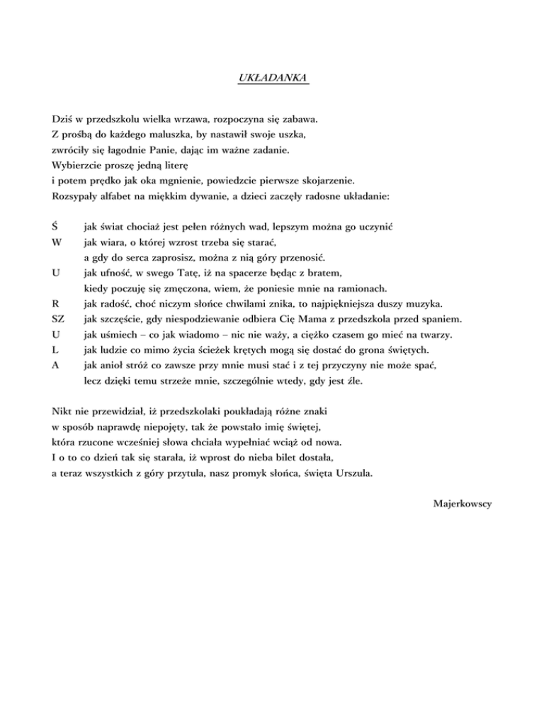 UKŁADANKA Dziś w przedszkolu wielka wrzawa, rozpoczyna się zabawa. Z prośbą do każdego maluszka, by nastawił swoje uszka, zwróciły się łagodnie Panie, dając im ważne zadanie. Wybierzcie proszę jedną literę i potem prędko jak oka mgnienie, powiedzcie pierwsze skojarzenie. Rozsypały alfabet na miękkim dywanie, a dzieci zaczęły radosne układanie: Ś jak świat chociaż jest pełen różnych wad, lepszym można go uczynić W jak wiara, o której wzrost trzeba się starać, a gdy do serca zaprosisz, można z nią góry przenosić. U jak ufność, w swego Tatę, iż na spacerze będąc z bratem, kiedy poczuję się zmęczona, wiem, że poniesie mnie na ramionach. R jak radość, choć niczym słońce chwilami znika, to najpiękniejsza duszy muzyka. SZ jak szczęście, gdy niespodziewanie odbiera Cię Mama z przedszkola przed spaniem. U jak uśmiech – co jak wiadomo – nic nie waży, a ciężko czasem go mieć na twarzy. L jak ludzie co mimo życia ścieżek krętych mogą się dostać do grona świętych. A jak anioł stróż co zawsze przy mnie musi stać i z tej przyczyny nie może spać, lecz dzięki temu strzeże mnie, szczególnie wtedy, gdy jest źle. Nikt nie przewidział, iż przedszkolaki poukładają różne znaki w sposób naprawdę niepojęty, tak że powstało imię świętej, która rzucone wcześniej słowa chciała wypełniać wciąż od nowa. I o to co dzień tak się starała, iż wprost do nieba bilet dostała, a teraz wszystkich z góry przytula, nasz promyk słońca, święta Urszula. Majerkowscy