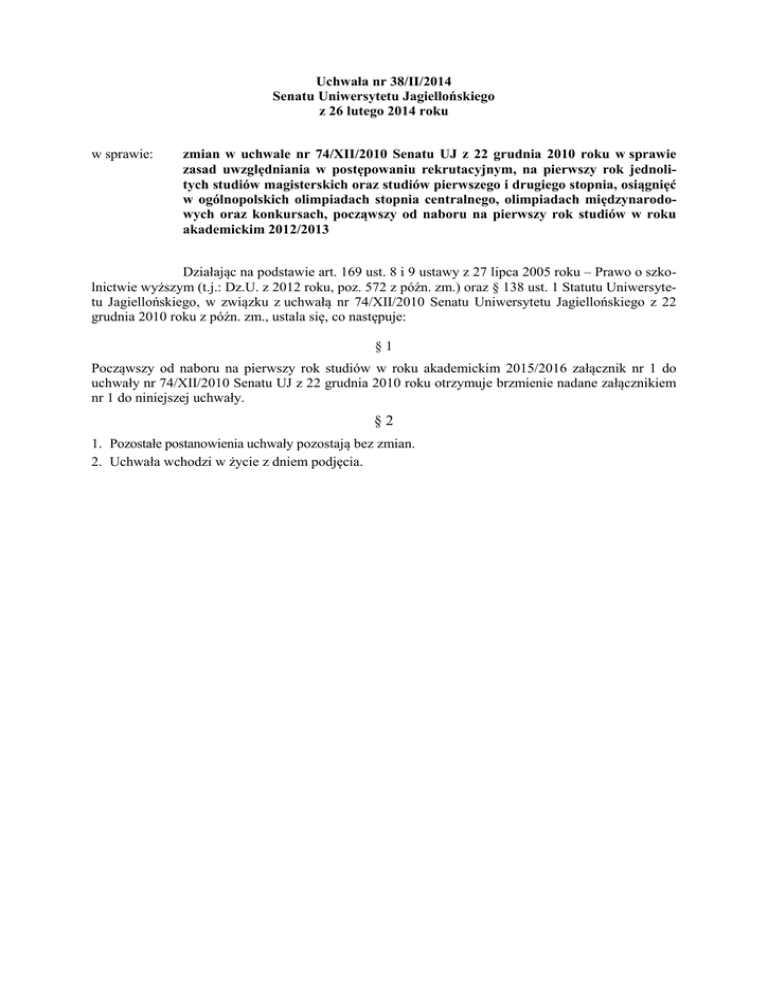 Uchwała nr 38/II/2014 Senatu Uniwersytetu Jagiellońskiego z 26 lutego 2014 roku w sprawie: zmian w uchwale nr 74/XII/2010 Senatu UJ z 22 grudnia 2010 roku w sprawie zasad uwzględniania w postępowaniu rekrutacyjnym, na pierwszy rok jednolitych studiów magisterskich oraz studiów pierwszego i drugiego stopnia, osiągnięć w ogólnopolskich olimpiadach stopnia centralnego, olimpiadach międzynarodowych oraz konkursach, począwszy od naboru na pierwszy rok studiów w roku akademickim 2012/2013 Działając na podstawie art. 169 ust. 8 i 9 ustawy z 27 lipca 2005 roku – Prawo o szkolnictwie wyższym (t.j.: Dz.U. z 2012 roku, poz. 572 z późn. zm.) oraz § 138 ust. 1 Statutu Uniwersytetu Jagiellońskiego, w związku z uchwałą nr 74/XII/2010 Senatu Uniwersytetu Jagiellońskiego z 22 grudnia 2010 roku z późn. zm., ustala się, co następuje: §1 Począwszy od naboru na pierwszy rok studiów w roku akademickim 2015/2016 załącznik nr 1 do uchwały nr 74/XII/2010 Senatu UJ z 22 grudnia 2010 roku otrzymuje brzmienie nadane załącznikiem nr 1 do niniejszej uchwały. §2 1. Pozostałe postanowienia uchwały pozostają bez zmian. 2. Uchwała wchodzi w życie z dniem podjęcia. Załącznik nr 1 do Uchwały nr 38/II/2014 z 26 lutego 2014 roku Lp. Odpowiadające wyniki przedmiotowe lub inne szczegółowe zasady uwzględniania osiągnięć Nazwa olimpiady lub konkursu Organizator OGÓLNOPOLSKIE OLIMPIADY STOPNIA CENTRALNEGO Olimpiady przedmiotowe 1 Olimpiada Artystyczna: Sekcja Muzyki historia muzyki Stowarzyszenie Przyjaciół Olimpiady Artystycznej 2 Olimpiada Artystyczna: Sekcja Plastyki historia sztuki Stowarzyszenie Przyjaciół Olimpiady Artystycznej 3 Olimpiada Biologiczna biologia Polskie Towarzystwo Przyrodników 4 Olimpiada Chemiczna chemia Polskie Towarzystwo Chemiczne 5 Olimpiada Filozoficzna filozofia Polskie Towarzystwo Filozoficzne 6 Olimpiada Fizyczna fizyka i astronomia Polskie Towarzystwo Fizyczne 7 Olimpiada Geograficzna geografia Polskie Towarzystwo Geograficzne 8 Ogólnopolska Olimpiada Historyczna historia Polskie Towarzystwo Historyczne 9 Olimpiada Informatyczna informatyka Fundacja Rozwoju Informatyki 10 Ogólnopolska Olimpiada Języka Angielskiego język angielski Wyższa Szkoła Języków Obcych im. Lindego 11 Olimpiada Języka Białoruskiego język rosyjski 12 Olimpiada Języka Francuskiego język francuski 13 Olimpiada Języka Hiszpańskiego język hiszpański Uniwersytet Warszawski, Wydział Lingwistyki Stosowanej, Katedra Białorutenistyki Stowarzyszenie Nauczycieli Języka Francuskiego w Polsce ProfEurope Polskie Towarzystwo Neofilologiczne 14 Olimpiada Języka Łacińskiego język łaciński i kultura antyczna 15 Ogólnopolska Olimpiada Języka Niemieckiego język niemiecki Polskie Towarzystwo Filologiczne, Uniwersytet Warszawski, Instytut Filologii Klasycznej Wyższa Szkoła Języków Obcych im. Lindego 16 Olimpiada Języka Rosyjskiego język rosyjski Uniwersytet Warszawski 17 Olimpiada Literatury i Języka Polskiego język polski Instytut Badań Literackich 18 Olimpiada Matematyczna matematyka Stowarzyszenie na Rzecz Edukacji Matematycznej 19 Olimpiada Wiedzy o Polsce i Świecie Współczesnym wiedza o społeczeństwie Uniwersytet Warszawski, Wydział Dziennikarstwa i Nauk Politycznych, Instytut Europeistyki matematyka Polski Związek Stowarzyszeń Wynalazców i Racjonalizatorów 21 Olimpiada Wiedzy Ekonomicznej wiedza o społeczeństwie Polskie Towarzystwo Ekonomiczne 22 Olimpiada Wiedzy Elektrycznej i Elektronicznej matematyka Stowarzyszenie Elektryków Polskich Olimpiady zawodowe 20 Olimpiada Innowacji Technicznych i Wynalazczości 23 Ogólnopolska Olimpiada Wiedzy Geodezyjnej i Kartograficznej geografia Stowarzyszenie Geodetów Polskich 24 Olimpiada Wiedzy Technicznej matematyka Federacja Stowarzyszeń Naukowo Technicznych NOT 25 Olimpiada Wiedzy i Umiejętności Budowlanych fizyka i astronomia Politechnika Warszawska 26 Olimpiada Wiedzy o Żywieniu i Żywności biologia Uniwersytet Przyrodniczy w Poznaniu wiedza o społeczeństwie Europejska Wyższa Szkoła Prawa i Administracji w Warszawie Uniwersytet Kardynała Stefana Wyszyńskiego Olimpiady interdyscyplinarne lub tematyczne 27 Europejska Olimpiada Społeczno-Prawna 28 Misyjna Olimpiada Znajomości Afryki wiedza o społeczeństwie 29 Ogólnopolska Olimpiada „Wiedzy o Prawie” wiedza o społeczeństwie 30 Olimpiada Astronomiczna fizyka i astronomia II Społeczne Liceum Ogólnokształcące im. Toniego Halika w Ostrołęce Planetarium i Obserwatorium Astronomiczne w Chorzowie 31 Olimpiada Wiedzy Ekologicznej geografia Liga Ochrony Przyrody 32 Olimpiada Lingwistyki Matematycznej matematyka Uniwersytet Wrocławski, Wydział Matematyki i Informatyki 33 Olimpiada "Losy Żołnierza i Dzieje Oręża Polskiego" historia Wojskowe Biuro Badań Historycznych i Wydział Nauk Historycznych i Społecznych Uniwersytetu Kardynała Stefana Wyszyńskiego 34 Olimpiada Przedsiębiorczości wiedza o społeczeństwie Fundacja Promocji i Akredytacji Kierunków Ekonomicznych 35 Olimpiada Wiedzy o Państwie i Prawie wiedza o społeczeństwie Wyższa Szkoła Prawa i Administracji w Przemyślu 36 Olimpiada z Wiedzy o Planowaniu i Zarządzaniu Karierą Zawodową wiedza o społeczeństwie Stowarzyszenie Doradców Szkolnych i Zawodowych Rzeczypospolitej Polskiej 37 Konkurs Młodych Naukowców Unii Europejskiej matematyka, fizyka, chemia, informatyka Krajowy Fundusz na Rzecz Dzieci Załącznik nr 1 do Uchwały nr 38/II/2014 z 26 lutego 2014 roku 38 Międzynarodowa Olimpiada Biologiczna OLIMPIADY MIĘDZYNARODOWE 1 biologia 39 Międzynarodowa Olimpiada Chemiczna chemia 40 Międzynarodowa Olimpiada Filozoficzna filozofia 41 Międzynarodowa Olimpiada Fizyczna fizyka i astronomia Organizator Olimpiady: L.N Gumilyov Eurasian National University miejsce: Astana, Kazachstan 42 Międzynarodowa Olimpiada Geograficzna geografia Organizator Olimpiady: International Geographical Union Olympiad Task Force c/o RGSQ, Milton Qld, Australia, Polski