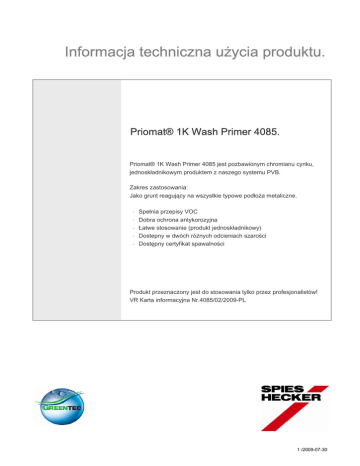 Informacja techniczna użycia produktu. Priomat® 1K Wash Primer 4085. Priomat® 1K Wash Primer 4085 jest pozbawionym chromianu cynku, jednoskładnikowym produktem z naszego systemu PVB. Zakres zastosowania: Jako grunt reagujący na wszystkie typowe podłoża metaliczne. · · · · · Spełnia przepisy VOC Dobra ochrona antykorozyjna Łatwe stosowanie (produkt jednoskładnikowy) Dostepny w dwóch różnych odcieniach szarości Dostępny certyfikat spawalności Produkt przeznaczony jest do stosowania tylko przez profesjonalistów! VR Karta informacyjna Nr.4085/02/2009-PL 1 /2009-07-30 Podłoża Odpowiednie podłoża: 1 Stal. 2 Blachy stalowe ocynkowane galwanicznie/ elektrolitycznie, oczyszczone i przeszlifowane. 3 Lekko przeszlifowany grunt fabryczny. 4 Dobrze przeszlifowana stara lub fabryczna powłoka lakieru (za wyjątkiem lakieru termoplastycznego). 5 Powierzchnie zaszpachlowane przy użyciu produktów poliestrowych dwuskładnikowych Raderal® i następnie przeszlifowane wykańczająco. Ważna wskazówka: Ze względu na dużą liczbę stopów metali względnie procesu technologicznego ich wytwarzania konieczne jest wstępne badanie każdego podłoża, w celu ustalenia czy obróbka wstępna jest wystarczająca dla uzyskania odpowiedniej przyczepności. Przygotowanie podłoża: Oczyścić wszystkie podłoża jeszcze raz za pomocą środka Permaloid® Silikon Entferner 7010 lub Permaloid® Silikon Entferner 7799. Fabryczną lub starą powłokę lakieru - oczyścić i lekko przeszlifować, dokładnie usunąć ewentualne ogniska korozji oraz przeszlifować przejście do starej powłoki lakierniczej. Przed dalszą obróbką starannie oczyścić odpowiednimi środkami czyszczącymi aby usunąć zanieczyszczenia oraz kurz. 2 /2009-07-30 Stosowanie Rozcieńczalnik: Metoda nanoszenia: Permacron® MS Dura Plus 8580 Permacron® Verdünnung 3364 Permacron® Verdünnung 3380 Permacron® Verdünnung 3365 lang (dla dużych obiektów i wysokich temperatur) · Permacron® Verdünnung 3385 lang (dla dużych obiektów i wysokich temperatur) · · · · Compliant Lepkość natryskowa HVLP 18-20 s 4 mm, +20°C, DIN 53211: Dodatek rozcieńczalnika przy 50% temperaturze materiału +20°C: Dysza natryskowa*: 1.3 - 1.5 mm 1.3 - 1.5 mm Ciśnienie natrysku*: 2.0-2.5 bar - - 0.7 bar Ciśnienie wewnątrz dyszy*: Ilość warstw: Przy stosowaniu jako grunt reagujący: 1 warstwa natryskowa = 10-15 µm grubości suchej powłoki Przy stosowaniu do izolacji małych przeszlifowań do metalu: Lakier bazowy Permahyd®/ lakier nawierzchniowy Permasolid® można tylko nanosić metodą "mokro na mokro" Szczególna wskazówka: lub z międzyszlifowaniem gruntu reagującego Priomat® 1K Wash Primer 4085 jeśli miejsce przeszlifowania do metalu nie ma wiekszej średnicy jak Ø 5.0 cm. 1-2 warstwy natryskowe = 15-30 µm grubości suchej powłoki * Patrz instrukcja producenta! 3 /2009-07-30 Suszenie Przy temperaturze otoczenia +20°C do polakierowania Suszenie na powietrzu: produktami: 10-15 min. · Permasolid® 2K Akryl Füller 10-15 min. · Permasolid® HS Autolack Serie 275 (tylko dla miejsc przeszlifowanych o małej powierzchni!) 20-30 min. · Permahyd® Basislack Serie 280/285 (tylko dla miejsc przeszlifowanych o małej powierzchni!) Wysuszony do szlifowania: 45-60 min. Lakierowanie Stosowanie jako grunt reagujący: Stosowanie jako grunt regujący z międzyszlifowaniem: Następnie pokryć produktem: Permasolid® 2K Akryl Füller na mokro papierem ściernym gradacji P800 -1000 Następnie pokryć produktem: · Permasolid® HS Autolack Serie 275 (tylko dla miejsc przeszlifowanych o małej powierzchni!) · Permahyd® Basislack Serie 280/285 i Permasolid® 2K Klarlack (tylko dla miejsc przeszlifowanych o małej powierzchni!) Szczególne wskazówki 1 Nie pokrywać gruntu reagującego produktami poliestrowymi. 2 Nie pokrywać gruntu reagującego produktami epoksydowymi. 3 Nie stosować na lakiery termoplastyczne. 4 Nie szlifować na sucho. 4 /2009-07-30 Parametry Lepkość produktu: co najmniej 60 s Temperatura zapłonu: powyżej +23°C Zawartość części stałych: Wash Primer 4085 jasnoszary z Verdünnung 3364 Wash Primer 4085 ciemnoszary z Verdünnung 3364 31.3 % wag. 15.1 % obj. 29.3 % wag. 14.6 % obj. 1.03 g/cm³ 1.01 g/cm³ 10.1 m²/l 3.8 m²/l 9.8 m²/l 3.7 m²/l Cieżar właściwy: Wydajność: przy grubości suchej powłoki 15 µm przy grubości suchej powłoki 40 µm Wartość VOC: Wartość graniczna określona przez UE dla tego produktu (kategoria produktu IIB.c) w postaci gotowej do aplikacji wynosi max. 780 g/litr ciekłych organicznych części składowych. Wartość VOC dla tego produktu w postaci gotowej do aplikacji wynosi max. 760 g/litr. * Wydajność została skalkulowana przy uwzględnieniu zalecanej grubości powłoki i procentowej zawartości objętościowej substancji nielotnych (bez rozcieńczalnika). Nie uwzględniono strat podczas aplikacji. 5 /2009-07-30 Magazynowanie Gwarantowana stabilność magazynowania: 6 miesięcy w zamkniętych oryginalnych opakowaniach Informacje zamieszczone w tej dokumentacji zostały przez nas starannie przygotowane. Została ona oparta na naszej najlepszej wiedzy na dzień jej wydania. Instrukcja techniczna służy jedynie celom informacyjnym. Nie ponosimy odpowiedzialności za jej poprawność, dokładność i kompletność. Do obowiązków użytkownika należy sprawdzenie informacji w niej zawartych pod względem aktualności i przystosowania do celów, do których użytkownik zamierza ją wykorzystać. Należy przestrzegać Kart Bezpieczeństwa i wskazówek ostrzegawczych zamieszczonych na opakowaniach. Własność intelektualna zawarta w informacjach jak patenty, znaki towarowe i prawa autorskie jest chroniona. Wszelkie prawa zastrzeżone. Zastrzegamy sobie prawo do modyfikowania i/lub wycofania instrukcji w całości lub w części w dowolnym momencie, bez konieczności wcześniejszego informowania i nie ponosimy odpowiedzialności za aktualizację informacji. Wszelkie