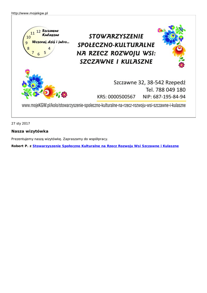 http://www.mojekgw.pl 27 sty 2017 Nasza wizytówka Prezentujemy naszą wizytówkę. Zapraszamy do współpracy. Robert P. z Stowarzyszenie Społeczno Kulturalne na Rzecz Rozwoju Wsi Szczawne i Kulaszne