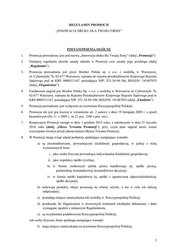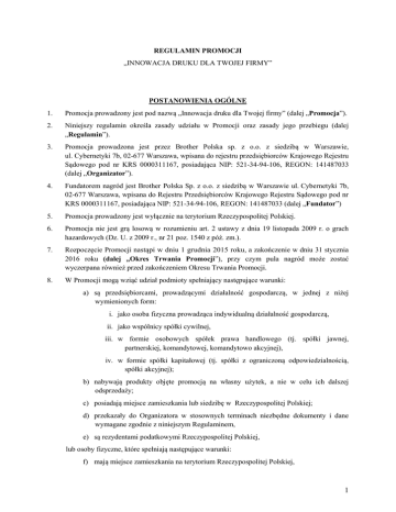 REGULAMIN PROMOCJI „INNOWACJA DRUKU DLA TWOJEJ FIRMY” POSTANOWIENIA OGÓLNE 1. Promocja prowadzony jest pod nazwą „Innowacja druku dla Twojej firmy” (dalej „Promocja”). 2. Niniejszy regulamin określa zasady udziału w Promocji oraz zasady jego przebiegu (dalej „Regulamin”). 3. Promocja prowadzona jest przez Brother Polska sp. z o.o. z siedzibą w Warszawie, ul. Cybernetyki 7b, 02-677 Warszawa, wpisana do rejestru przedsiębiorców Krajowego Rejestru Sądowego pod nr KRS 0000311167, posiadająca NIP: 521-34-94-106, REGON: 141487033 (dalej „Organizator”). 4. Fundatorem nagród jest Brother Polska Sp. z o.o. z siedzibą w Warszawie ul. Cybernetyki 7b, 02-677 Warszawa, wpisana do Rejestru Przedsiębiorców Krajowego Rejestru Sądowego pod nr KRS 0000311167, posiadająca NIP: 521-34-94-106, REGON: 141487033 (dalej „Fundator”) 5. Promocja prowadzony jest wyłącznie na terytorium Rzeczypospolitej Polskiej. 6. Promocja nie jest grą losową w rozumieniu art. 2 ustawy z dnia 19 listopada 2009 r. o grach hazardowych (Dz. U. z 2009 r., nr 21 poz. 1540 z póź. zm.). 7. Rozpoczęcie Promocji nastąpi w dniu 1 grudnia 2015 roku, a zakończenie w dniu 31 stycznia 2016 roku (dalej „Okres Trwania Promocji”), przy czym pula nagród może zostać wyczerpana również przed zakończeniem Okresu Trwania Promocji. 8. W Promocji mogą wziąć udział podmioty spełniający następujące warunki: a) są przedsiębiorcami, prowadzącymi działalność gospodarczą, w jednej z niżej wymienionych form: i. jako osoba fizyczna prowadząca indywidualną działalność gospodarczą, ii. jako wspólnicy spółki cywilnej, iii. w formie osobowych spółek prawa handlowego (tj. spółki jawnej, partnerskiej, komandytowej, komandytowo akcyjnej), iv. w formie spółki kapitałowej (tj. spółki z ograniczoną odpowiedzialnością, spółki akcyjnej); b) nabywają produkty objęte promocją na własny użytek, a nie w celu ich dalszej odsprzedaży; c) posiadają miejsce zamieszkania lub siedzibę w Rzeczypospolitej Polskiej; d) przekazały do Organizatora w stosownych terminach niezbędne dokumenty i dane wymagane zgodnie z niniejszym Regulaminem, e) są rezydentami podatkowymi Rzeczypospolitej Polskiej, lub osoby fizyczne, które spełniają następujące warunki: f) mają miejsce zamieszkania na terytorium Rzeczypospolitej Polskiej, 1 g) mają ukończone 18 lat i posiadają pełną zdolność do czynności prawnych, h) dokonały zakupu Towarów w Okresie Trwania Promocji, i) przekazały do Organizatora w stosownych terminach niezbędne dokumenty i dane wymagane zgodnie z niniejszym Regulaminem, j) są rezydentami podatkowymi Rzeczypospolitej Polskiej, k) dokonują czynności zakupu Produktu niezwiązanej bezpośrednio z jej działalnością gospodarczą lub zawodową. 9. Podmioty spełniające warunki określone w pkt 8 litera a-e) Regulaminu oraz osoby fizyczne spełniające warunki określone w pkt 8 lit f-k) Regulaminu zwane będą dalej na potrzeby niniejszego Regulaminu ”Uczestnicy” 10. W Promocji uwzględniane są nabycia dokonane w Autoryzowanych Sklepach wskazanych poniżej Produktów marki BROTHER, zwanych dalej łącznie „Produkty”. Aktualna lista Autoryzowanych Sklepów dostępna na www.innowacjadruku.pl 11. Promocja dotyczy jedynie tych Produktów, które zostały wprowadzone do obrotu na terytorium Rzeczypospolitej Polskiej poprzez autoryzowaną sieć dystrybucji Organizatora. 12. Promocją objęte są następujące produkty marki BROTHER, stanowiące wielofunkcyjne urządzenia atramentowe (dalej „Produkty”): 13. a) MFC-J4420DW b) MFC-J4620DW c) MFC-J5320DW d) MFC-J5620DW e) MFC-J5720DW W Promocji nie mogą wziąć udziału pracownicy: a) Brother Polska Sp. z o.o. z siedzibą w Warszawie. oraz ich małżonkowie, wstępni, zstępni, rodzeństwo, przysposobieni, przysposabiający. W przypadku udziału ww. osób w Promocji, osoby te tracą uprawnienie do Nagrody. ZASADY PROWADZENIA PROMOCJI 14. W celu wzięcia udziału w Promocji, Uczestnik powinien w Okresie Trwania Promocji spełnić łącznie warunki określone w Regulaminie, w szczególności: a) zapoznać się i zaakceptować zasady uczestnictwa w Promocji dostępne na stronie internetowej www.innowacjadruku.pl b) wyrazić zgodę na przetwarzanie danych osobowych w celach marketingowych i handlowych; c) w Okresie Trwania Promocji zakupić w jednym z Autoryzowanych Sklepów, w sposób udokumentowany fakturą lub paragonem, jeden z Produktów; 2 d) posiadać kopię faktury i/lub paragonu dokumentującej nabycie Produktu – data zgłoszenia do Promocji nie może być wcześniejsza niż data dokonania zakupu stwierdzona na fakturze i/lub paragonie; e) za pośrednictwem aplikacji promocyjnej dostępnej na stronie internetowej www.innowacjadruku.pl wypełnić formularz zgłoszeniowy, do formularza załączyć i) skan faktury i/lub paragonu oraz ii) skan lub plik w formacie PDF informacji o rejestracji przedsiębiorcy, odpowiedniej dla formy prawnej Uczestnika, będącego podmiotem wskazanym w pkt 8 litera a-e), z Centralnej Ewidencja i Informacja o Działalności Gospodarczej Rzeczypospolitej Polskiej (CEDiG) lub Krajowego Rejestru Sądowego (KRS) (dalej „Zgłoszenie”); f) zachować – w celu ewentualnego przekazania Organizatorowi w procesie weryfikacji – numer seryjny nabytego Produktu. 15. Zgłoszenia uczestnictwa w Promocji przyjmowane są od dnia 1.12.2015 roku do dnia 10.02.2016 roku. 16. Dane zawarte na fakturze/paragonie zakupu Produktu muszą być zgodne z danymi podanymi w formularzu zgłoszeniowym. 17. Niezgodność jakichkolwiek danych z faktury/paragonu z danymi ze Zgłoszenia skutkuje wyłączeniem Zgłoszenia z Promocji. 18. Zakup jednego Produktu uprawnia Uczestnika do otrzymania jednej nagrody, na zasadach określonych w Regulaminie. Jednakże jeden Uczestnik może otrzymać więcej niż jedną nagrodę w Promocji w przypadku nabycia dwóch lub więcej Produktów w Okresie Trwania Promocji, z t