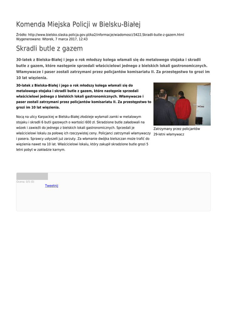 Komenda Miejska Policji w Bielsku-Białej Źródło: http://www.bielsko.slaska.policja.gov.pl/ka2/informacje/wiadomosci/3422,Skradli-butle-z-gazem.html Wygenerowano: Wtorek, 7 marca 2017, 12:43 Skradli butle z gazem 30-latek z Bielska-Białej i jego o rok młodszy kolega włamali się do metalowego stojaka i skradli butle z gazem, które następnie sprzedali właścicielowi jednego z bielskich lokali gastronomicznych. Włamywacze i paser zostali zatrzymani przez policjantów komisariatu II. Za przestępstwo to grozi im 10 lat więzienia. 30-latek z Bielska-Białej i jego o rok młodszy kolega włamali się do metalowego stojaka i skradli butle z gazem, które następnie sprzedali właścicielowi jednego z bielskich lokali gastronomicznych. Włamywacze i paser zostali zatrzymani przez policjantów komisariatu II. Za przestępstwo to grozi im 10 lat więzienia. Nocą na ulicy Karpackiej w Bielsku-Białej złodzieje wyłamali zamki w metalowym stojaku i skradli 6 butli gazowych o wartości 600 zł. Skradzione butle załadowali na wózek i zawieźli do jednego z bielskich lokali gastronomicznych. Sprzedali je Zatrzymany przez policjantów właścicielowi lokalu za połowę ich rzeczywistej ceny. Policjanci zatrzymali włamywaczy 29-letni włamywacz i pasera. Sprawcy usłyszeli już zarzuty. Za włamanie dwójka bielszczan może trafić do więzienia nawet na 10 lat. Właścicielowi lokalu, który zakupił skradzione butle grozi 5 letni pobyt w zakładzie karnym. Ocena: 0/5 (0) Tweetnij