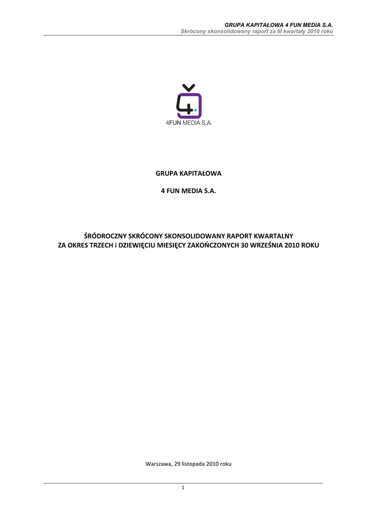 GRUPA KAPITAŁOWA 4 FUN MEDIA S.A. Skrócony skonsolidowany raport za III kwartały 2010 roku GRUPA KAPITAŁOWA 4 FUN MEDIA S.A. ŚRÓDROCZNY SKRÓCONY SKONSOLIDOWANY RAPORT KWARTALNY ZA OKRES TRZECH i DZIEWIĘCIU MIESIĘCY ZAKOŃCZONYCH 30 WRZEŚNIA 2010 ROKU Warszawa, 29 listopada 2010 roku 1 GRUPA KAPITAŁOWA 4 FUN MEDIA S.A. Skrócony skonsolidowany raport za III kwartały 2010 roku SPIS TREŚCI 1 WYBRANE SKONSOLIDOWANE DANE FINANSOWE 2 KOMENTARZ ZARZĄDU 4 FUN MEDIA S.A. DO SKONSOLIDOWANYCH WYNIKÓW FINANSOWYCH ZA III KWARTAŁ 2010 roku. 6 4 2.1 Opis istotnych dokonań lub niepowodzeń Emitenta w okresie, którego dotyczy raport wraz z wykazem najważniejszych wydarzeń 6 2.2 Opis czynników i zdarzeń w szczególności o nietypowym charakterze, które miały istotny wpływ na osiągnięte wyniki finansowe 8 2.3 Zdarzenia, które wystąpiły po okresie, którego dotyczy niniejszy raport, a mogące mieć wpływ na przyszłe wyniki finansowe 8 2.4 Informacja dotycząca sezonowości i cykliczności działalności Spółki w prezentowanym okresie 9 2.5 Stanowisko Zarządu odnośnie możliwości zrealizowania wcześniej publikowanych prognoz wyników 10 2.6 Wskazanie czynników, które w ocenie Emitenta będą miały wpływ na osiągnięte przez niego wyniki w perspektywie co najmniej jednego kwartału 10 2.7 Inne informacje, które zdaniem Emitenta są istotne dla oceny jego sytuacji kadrowej, majątkowej finansowej, wyniku finansowego i ich zmian, oraz informacje, które są istotne dla oceny możliwości realizacji zobowiązań przez Emitenta 10 3 4 SKRÓCONE ŚRÓDROCZNE SKONSOLIDOWANE SPRAWOZDANIE FINANSOWE GRUPY KAPITAŁOWEJ 4 FUN MEDIA S.A. ZA OKRES 3 i 9 MIESIĘCY ZAKOŃCZONYCH 30 WRZEŚNIA 2010 ROK 11 3.1 Zasady rachunkowości przyjęte przy sporządzaniu raportu 11 3.1 Cele i zasady zarządzania ryzykiem 12 3.2 Skrócone skonsolidowane sprawozdanie z całkowitych dochodów. 14 3.3 Skrócone skonsolidowane sprawozdanie z sytuacji finansowej 15 3.4 Skrócone skonsolidowane sprawozdanie z przepływów pieniężnych 17 3.5 Skrócone skonsolidowane sprawozdanie ze zmian w kapitale własnym 18 3.6 Informacja dodatkowa do śródrocznego skonsolidowanego sprawozdania finansowego 19 POZOSTAŁE INFORMACJE DODATKOWE 31 4.1 Opis organizacji Grupy Kapitałowej Emitenta, ze wskazaniem jednostek podlegających konsolidacji 31 4.2 Wskazanie skutków zmian w strukturze Emitenta, w tym w wyniku połączeń, przejęcia lub sprzedaży jednostek grupy kapitałowej, inwestycji długoterminowych, podziału, restrukturyzacji i zaniechania działalności 31 4.3 Informacja o emisji, wykupie i spłacie dłużnych i kapitałowych papierów wartościowych 31 4.4 Informacja o wypłaconej lub zadeklarowanej dywidendzie 31 4.5 Informacja o zmianie zobowiązań warunkowych lub aktywów warunkowych 31 4.6 Informacja o zmianie w strukturze organizacyjnej Grupy Kapitałowej Emitenta 32 4.7 Akcjonariusze posiadający powyżej 5% w ogólnej liczbie głosów na walnym zgromadzeniu Emitenta 32 4.8 Zestawienie zmian w stanie posiadania akcji 4 Fun Media S.A. lub uprawnień do nich przez osoby zarządzające i nadzorujące Emitenta 32 4.9 Informacja o postępowaniach toczących się przed sądem, organem administracji publicznej lub organem właściwym dla postępowania arbitrażowego 33 4.10 Informacje o zawarciu przez Spółkę jednej lub wielu transakcji z podmiotami powiązanymi, kiedy pojedynczo lub łączenie są one istotne i zostały zawarte na innych warunkach niż rynkowe 34 4.11 Informacje o udzieleniu przez Spółkę poręczeń kredytu, pożyczki lub udzieleniu gwarancji jednemu podmiotowi lub jednostce zależnej Spółki, jeżeli ich łączna wartość stanowi równowartość co najmniej 10% kapitałów własnych Emitenta 34 2 GRUPA KAPITAŁOWA 4 FUN MEDIA S.A. Skrócony skonsolidowany raport za III kwartały 2010 roku WPROWADZENIE Grupa Kapitałowa 4fun Media S.A. prowadzi działalność na rynku telewizyjnym. Jest nadawcą własnych kanałów tematycznych (4fun.tv i rebel:tv), producentem programów telewizyjnych i formatów interaktywnych oraz dystrybutorem kilkunastu stacji telewizyjnych (m.in. BBC, CNBC) na rynek polski. 4fun Media S.A. dysponuje własną, interaktywną platformą telewizyjną, która umożliwia emisję kontentu video w różnych formatach (telewizja, telefonia komórkowa, platformy IPTV, Internet). W ciągu blisko 7 lat funkcjonowania, Spółka zbudowała silną pozycję nadawcy tematycznych kanałów telewizyjnych o profilu muzyczno-rozrywkowym, skierowanych do grupy docelowej w wieku 16-49 lat. W skład Grupy Kapitałowej 4fun Media S.A. wchodzą spółki : 4fun Media S.A., której wiodącym przedmiotem działalności jest produkcja i nadawanie dwóch interaktywnych kanałów muzyczno-rozrywkowych: 4fun.tv i rebel:tv, produkcja i agregacja treści video oraz tworzenie innowacyjnych rozwiązań technologicznych, Program sp. z o.o, zajmująca się dystrybucją tematycznych kanałów telewizyjnych, badaniem rynku telewizji płatnych, działalnością marketingową i promocyjną na rzecz klientów. Podstawowe obszary działalności 4fun Media S.A. to obecnie: • • • kanały 4fun.tv i rebel:tv (tworzenie i nadawanie), produkcja i agregacja treści video, rozwój zaplecza technologicznego (technologia). Dane historyczne dotyczące jednostki dominującej 4 Fun Media S.A. Dnia 2 września 2003 roku została zawiązana Spółka 4fun.tv Spółka z ograniczoną odpowiedzialnością (Aktem Notarialnym sporządzonym przez Pawła Chałupczaka, notariusza w Warszawie -repertorium A nr 13123/03) i wpisana w dniu 7 listopada 2003 roku do Rejestru Przedsiębiorców Krajowego Rejestru Sądowego prowadzonego przez Sąd Rejonowy dla m. st. Warszawy w Warszawie, XX Wydział Gospodarczy Krajowego Rejestru Sądowego, za numerem 0000177490 (sygn. akt: WA.XX NS-Rej.KRS/19158/3/569). W dniu 17 maja 2005 roku nadzwyczajne zgromadzenie wspólników spółki 4fun.tv Sp. z o.o., działając stosownie do art