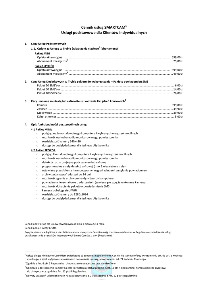 Cennik usług SMARTCAM1 Usługi podstawowe dla Klientów indywidualnych 1. Ceny Usług Podstawowych 2 1.1. Opłaty za Usługę w Trybie świadczenia ciągłego (abonament) Pakiet MINI Opłata aktywacyjna ....................................................................................................................................... 599,00 zł 3 Abonament miesięczny .................................................................................................................................. 25,00 zł Pakiet SPOKÓJ Opłata aktywacyjna ....................................................................................................................................... 899,00 zł 3 Abonament miesięczny .................................................................................................................................. 49,00 zł 2. Ceny Usług Dodatkowych w Trybie pakietu do wykorzystania – Pakiety powiadomień SMS Pakiet 20 SMS’ów .............................................................................................................................................. 6,00 zł Pakiet 50 SMS’ów ............................................................................................................................................ 14,00 zł Pakiet 100 SMS’ów .......................................................................................................................................... 26,00 zł 3. Kary umowne za utratę lub całkowite uszkodzenie Urządzeń końcowych Kamera ........................................................................................................................................................... 899,00 zł Zasilacz ............................................................................................................................................................. 39,90 zł Mocowanie ...................................................................................................................................................... 39,90 zł Kabel ethernet ................................................................................................................................................... 5,00 zł 4. Opis funkcjonalności poszczególnych usług 4 4.1 Pakiet MINI: • podgląd na żywo z dowolnego komputera i wybranych urządzeń mobilnych • możliwość nasłuchu audio monitorowanego pomieszczenia • rozdzielczość kamery 640x480 • dostęp do podglądu kamer dla jednego Użytkownika 4.2 Pakiet SPOKÓJ: • podgląd live z dowolnego komputera i wybranych urządzeń mobilnych • możliwość nasłuchu audio monitorowanego pomieszczenia • detekcja ruchu czujką na podczerwień lub cyfrową • programowalne strefy detekcji cyfrowej (max 3 niezależne strefy) • ustawiane przez klienta harmonogramy: nagrań zdarzeń i wysyłania powiadomień • archiwizacja nagrań zdarzeń do 14 dni • możliwość zgrania archiwum na dysk twardy komputera • powiadamianie e-mailowe o zdarzeniach (zawierające zdjęcie wykonane kamerą) • możliwość dokupienia pakietów powiadamiania SMS • kamera z obsługą sieci WiFi • rozdzielczość kamery do 1280x1024 • dostęp do podglądu kamer dla jednego Użytkownika Cennik obowiązuje dla umów zawieranych od dnia 1 marca 2011 roku. Cennik podaje kwoty brutto. Pojęcia pisane wielką literą a niezdefiniowane w niniejszym Cenniku mają znaczenie nadane im w Regulaminie świadczenia usług oraz korzystania z serwisów internetowych Smart Cam Sp. z o.o. (Regulamin). 1 Usługi objęte niniejszym Cennikiem świadczone są zgodnie z Regulaminem. Cennik nie stanowi oferty w rozumieniu art. 66 ust. 1 Kodeksu cywilnego, a sjest wyłącznie zaproszeniem do zawarcia umowy, w rozumieniu art. 71 Kodeksu Cywilnego. 2 Zgodnie z Art. 6 pkt 2 Regulaminu. Umowa zawierana jest na czas nieokreślony. 3 Obejmuje udostępnienie kamery na czas korzystania z Usług zgodnie z Art. 12 pkt 4 Regulaminu. Kamera podlega zwrotowi do Usługodawcy zgodnie z Art. 12 pkt 8 Regulaminu. 4 Dotyczy urządzeń udostępnionych na czas korzystania z Usługi zgodnie z Art. 12 pkt 4 Regulaminu.
