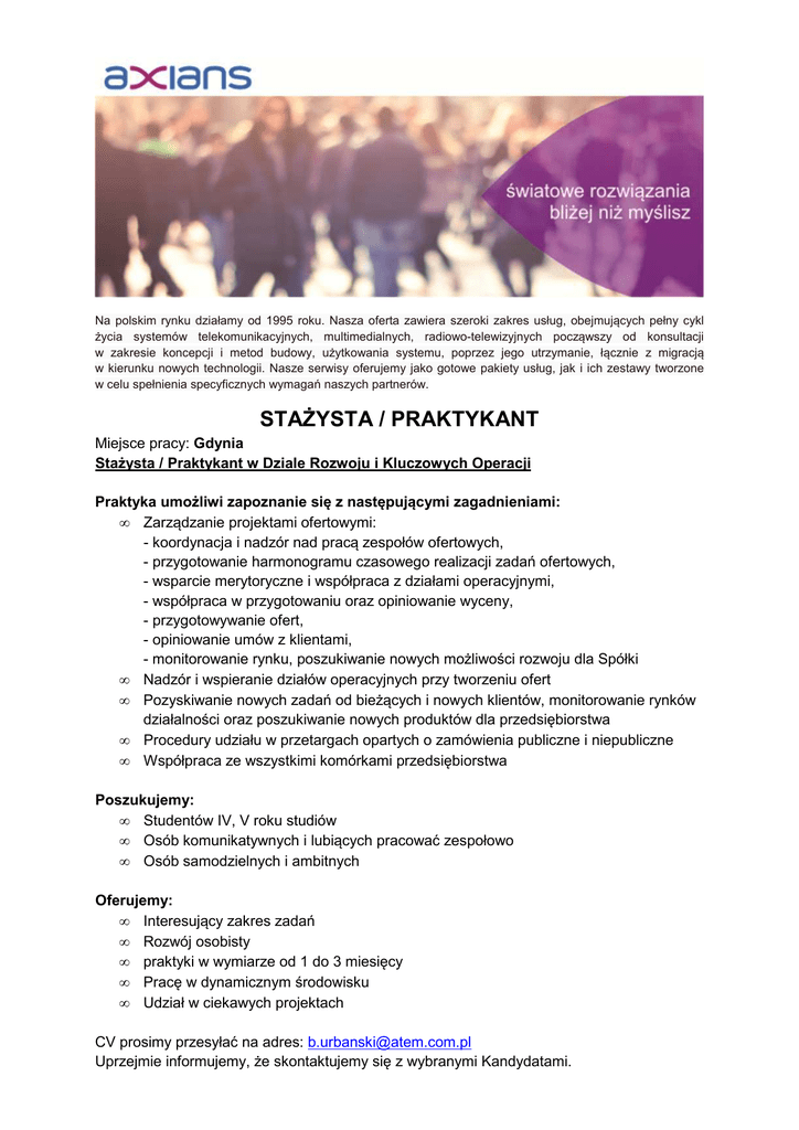 Na polskim rynku działamy od 1995 roku. Nasza oferta zawiera szeroki zakres usług, obejmujących pełny cykl życia systemów telekomunikacyjnych, multimedialnych, radiowo-telewizyjnych począwszy od konsultacji w zakresie koncepcji i metod budowy, użytkowania systemu, poprzez jego utrzymanie, łącznie z migracją w kierunku nowych technologii. Nasze serwisy oferujemy jako gotowe pakiety usług, jak i ich zestawy tworzone w celu spełnienia specyficznych wymagań naszych partnerów. STAŻYSTA / PRAKTYKANT Miejsce pracy: Gdynia Stażysta / Praktykant w Dziale Rozwoju i Kluczowych Operacji Praktyka umożliwi zapoznanie się z następującymi zagadnieniami: • Zarządzanie projektami ofertowymi: - koordynacja i nadzór nad pracą zespołów ofertowych, - przygotowanie harmonogramu czasowego realizacji zadań ofertowych, - wsparcie merytoryczne i współpraca z działami operacyjnymi, - współpraca w przygotowaniu oraz opiniowanie wyceny, - przygotowywanie ofert, - opiniowanie umów z klientami, - monitorowanie rynku, poszukiwanie nowych możliwości rozwoju dla Spółki • Nadzór i wspieranie działów operacyjnych przy tworzeniu ofert • Pozyskiwanie nowych zadań od bieżących i nowych klientów, monitorowanie rynków działalności oraz poszukiwanie nowych produktów dla przedsiębiorstwa • Procedury udziału w przetargach opartych o zamówienia publiczne i niepubliczne • Współpraca ze wszystkimi komórkami przedsiębiorstwa Poszukujemy: • Studentów IV, V roku studiów • Osób komunikatywnych i lubiących pracować zespołowo • Osób samodzielnych i ambitnych Oferujemy: • Interesujący zakres zadań • Rozwój osobisty • praktyki w wymiarze od 1 do 3 miesięcy • Pracę w dynamicznym środowisku • Udział w ciekawych projektach CV prosimy przesyłać na adres: [email protected] Uprzejmie informujemy, że skontaktujemy się z wybranymi Kandydatami.
