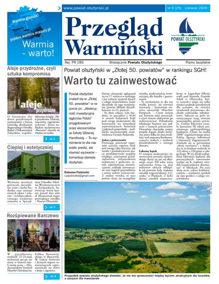 www.powiat-olsztynski.pl Aleje przydrożne, czyli sztuka kompromisu O fenomenie alei drzew przydrożnych rozmawiamy z Iwoną Liżewską, dyrektorem Regionalnego Ośrodka Badań i Dokumentacji Zabytków, współre- daktorem książki „Aleje przydrożne. Historia, znaczenie, zagrożenie, ochrona”, która nakładem wydawnictwa „Borussia” ukazała się właśnie na rynku. str 2 Cieplej i estetyczniej Rej. PR 285 Pismo bezpłatne Warto tu zainwestować Powiat olsztyński znalazł się w „Złotej 50. powiatów” w raporcie pn. „Atrakcyjność inwestycyjna regionów Polski” przygotowanym przez ekonomistów ze Szkoły Głównej Handlowej. – To wyróżnienie to dla nas wielki prestiż, ale również wyzwanie – komentuje starosta olsztyński. Powiat olsztyński uplasował się na 17. miejscu w rankingu i jest jednym spośród dwóch z całego województwa, które doczekały się tego wyróżnienia (powiat elbląski sklasyfikowano na 33. pozycji). - To duży sukces, tym bardziej, że specjaliści z SGH w swoich badaniach brali pod uwagę atrakcyjność dla inwestorów we wszystkich najważniejszych branżach i gałęziach gospodarki – podkreśla wicemarszałek województwa Urszula Pasławska. Jeden z priorytetów Oceniając potencjał regionów autorzy raportu brali pod uwagę takie kryteria, jak zasoby i produktywność pracy, produktywność majątku trwałego, rentowność przedsiębiorstw, infrastruktura techniczna i społeczna, rynek, administracja, innowacyjność, nakłady inwestycyjne oraz kapitał przyrodniczy i cenne walory turystyczne. Z analizy wynika, że nasz powiat cieszy się szczególnie wysoką atrakcyjnością inwestycyjną dla handlu i gastronomii. - To wyróżnienie to dla nas wielki prestiż, ale również wyzwanie – komentuje starosta olsztyński Mirosław Pampuch. – Czym innym jest bowiem mieć potencjał, a czym innym efektywnie go wykorzystywać. Pobudzanie lokalnego biznesu jest jednym z naszych priorytetów. Dowodem chociażby unijny projekt Equal, dzięki któremu przez kilka lat pracowaliśmy nad poprawą konkurencyjności małych i średnich przedsiębiorstw z naszego obszaru. Łakomy kąsek O rosnącej atrakcyjności inwestycyjnej powiatu olsztyńskiego słyszy się już od dłuższego czasu. Pół roku temu warszawska firma za pięć milionów złotych odkupiła od powiatu były rządowy ośrodek wypoczynkowy „Cyranka” w Pluskach. Z kolei dawny ośrodek wypoczyn- kowy w Łęguckim Młynie trafił pod kuratelę Zespołu Szkół w Olsztynku, który uczynił z niego nie tylko miejsce praktyk zawodowych dla uczniów, ale również uruchomił przynoszące dochody schronisko młodzieżowe. Sukcesy na polu inwestycyjnym mają również poszczególne gminy powiatu. Gmina Barczewo została laureatem III edycji prestiżowego ogólnopolskiego konkursu „Grunt na medal 2008” organizowanego przez Polską Agencję Informacji i Inwestycji Zagranicznych. Znalazła się w prestiżowej „złotej szesnastce”, a dodajmy że na konkurs nadeszły aż 332 oferty z 220 gmin z całego kraju. W tej chwili najbardziej łakomym kąskiem dla potencjalnych inwestorów wydaje się b. rządowy ośrodek wypoczynkowy „Kormoran” w Mierkach. Na razie służy m.in. celom konferencyjnym – niedawno spotkali się tam geodeci z całego województwa. Fot. Archiwum [email protected] nym Ośrodku Szkolno-Wychowawczym w Żardenikach. Inwestycję wartą łącznie ponad dwa mln zł sfinansował organ prowadzący ośrodka – Powiat Olsztyński. Miesięcznik Powiatu Olsztyńskiego Powiat olsztyński w „Złotej 50. powiatów” w rankingu SGH! Radosław Paździorko Wymiana instalacji grzewczej, docieplenie ścian i dachu budynku oraz montaż nowych okien i solarów – to bilans zakończonego niedawno remontu w Specjal- nr 6 (25) czerwiec 2009 str 3 Rozśpiewane Barczewo W „przedłużony weekend” 21-23 maja melomani już po raz ósmy w historii mieli swoją ucztę – Międzynarodowy Festiwal Muzyki Chóralnej im. Feliksa Nowowiejskiego w Barczewie. W trakcie festiwalu i licznych imprez towarzyszących zaprezentowały się chóry z kraju i zagranicy. str 4 Przypadek powiatu olsztyńskiego dowodzi, że nie ma sprzeczności między byciem atrakcyjnym dla turystów, a zarazem dla inwestorów 2 Chodź Pan na stronę nr 6 (25) 2009 Na pohybel męczyduszom Ukazała się pierwsza kompleksowa publikacja o alejach drzew nuklearne. A tymczasem inni spece, tyle że z zewnątrz, czyli ekonomiści z renomowanej Szkoły Głównej Handlowej właśnie utarli lokalnym malkontentom naburmuszonego nosa. SGH przy użyciu specjalistycznego szkiełka i oka (patrz tekst na str. 1) uznała nasz region za perełkę dla inwestora. A turyści? Tu kolejny prztyczek, ba – nawet cios z tzw. „liścia”, bo okazuje się, że wprawdzie my sami niezbyt się lubimy, za to masowo lubią nas inni. Od kilku tygodni Gazeta Olsztyńska drukuje w piątkowym Reporterze rozmowy z celebrytami. A ci pod niebiosa wychwalają nasz „skansen” – mają tu ciszę i spokój, za co kochają tę krainę. I ja też lubię ten skansen głównie za to, co stanowi o modzie na cittaslow. Nie tęsknię za pięciogwiazdkowym życiem w stolicy, a knieja nawet bez ścieżki rowerowej w skandynawskim standardzie koi moje zmysły, zszargane m.in. marudzeniem lokalnych męczydusz. Maciej Rytczak Co bym chciał na drugie urodziny Równo dwa lata temu ukazał się pierwszy numer Przeglądu Warmińskiego. Obiecaliśmy Państwu pismo samorządowe, a nie jeszcze jeden urzędowy biuletyn przydatny, gdy w domu zabraknie papieru toaletowego. Słowa dotrzymaliśmy i z tego mamy satysfakcję jako redakcja. Jeszcze z tego, że nas kopiują (przemilczmy, kto), cytują (i to konkurencja!), a nawet umieszczają w bibliografiach prac magisterskich. To cieszy, ale to szczegół. Ważne pytanie brzmi wciąż tak samo: co z tą Warmią? Dwa lata temu obiecaliśmy, że będziemy promować Warmię. Od tego czasu jest ona refrenem i wspólnym 