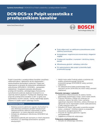 Systemy komunikacji | DCN-DCS-xx Pulpit uczestnika z przełącznikiem kanałów DCN-DCS-xx Pulpit uczestnika z przełącznikiem kanałów www.boschsecurity.pl Pulpit uczestnika z przełącznikiem kanałów umożliwia zabieranie głosu, zgłaszanie się do wypowiedzi i wysłuchiwanie pozostałych mówców. Pulpit jest wyposażony w gniazdo do dołączenia wkładanych mikrofonów (DCN‑MICS i DCN‑MICL, zamawiane oddzielnie). Urządzenie posiada wbudowany przełącznik kanałów, udostępniający tłumaczenia symultaniczne podczas dyskusji toczonych w co najmniej dwóch językach. Przełącznik obejmuje dwa przyciski przełączania kanałów w dół i w górę oraz wyświetlacz numeru kanału i skrótu wybranego języka. Ułatwia to szybki wybór żądanego kanału. Podstawowe funkcje • Redukcja poziomu głośności sygnału słuchawkach w celu eliminacji powstania sprzężeń akustycznych (aktywna podczas odsłuchu wypowiedzi w języku oryginalnym i w czasie włączenia mikrofonu) • Gniazdo do wkładanych mikrofonów (DCN‑MICS lub DCN‑MICL) • Wbudowany głośnik jest wyciszany w chwili włączenia mikrofonu, co zapobiega powstawaniu sprzężeń akustycznych. u Duża odporność na zakłócenia powodowane przez telefony komórkowe u Kompaktowa i ergonomiczna konstrukcja, elegancki wygląd u Przełącznik kanałów z numerem i skróconą nazwą kanału u Wbudowany głośnik i wkładany mikrofon u Do wykorzystania jako pulpit uczestnika bądź przewodniczącego • Moduł może pełnić funkcję pulpitu uczestnika lub pulpitu przewodniczącego (przyciski przewodniczącego DCN-DISBCM należy zamówić oddzielnie) • Do zabezpieczenia kabla przelotowego służą specjalne zaciski (DCN‑DISCLM, które należy zamówić oddzielnie) Elementy sterujące i wskaźniki • Wyświetlacz alfanumeryczny do wyboru kanału językowego prezentujący numer i skrót nazwy kanału • Przycisk mikrofonu z diodą LED świecącą na czerwono, zielono lub żółto. Kolor czerwony sygnalizuje włączenie mikrofonu, zielony informuje, że zgłoszenie się do wypowiedzi zostało zaakceptowane, a żółty wskazuje status VIP • Wskaźnik VIP świeci, gdy pulpit uczestnika posiada status „notebook” (możliwe jedynie w przypadku stosowania oprogramowania PC) • Przyciski do regulacji głośności sygnału słuchawkowego • Zagłębiony przełącznik wyłączający Połączenia międzymodułowe • Gniazdo do wkładanego mikrofonu 2 | DCN-DCS-xx Pulpit uczestnika z przełącznikiem kanałów • Dwa stereofoniczne gniazda słuchawkowe typu jack 3,5 mm • Kabel o długości 2 m zakończony okrągłym, zalewanym złączem 6-stykowym. • Okrągłe złącze 6-stykowe do połączeń przelotowych Certyfikaty i świadectwa Region Certyfikacja Europa CE DCN‑MICL Mikrofon, długi Długi podłączany mikrofon systemu DCN Next Generation, długość 480 mm, kolor srebrny. Numer zamówienia DCN-MICL DCN‑MICL‑D Mikrofon, długi, kolor ciemnoszary Długi podłączany mikrofon systemu DCN Next Generation, długość 480 mm, ciemny. Numer zamówienia DCN-MICL-D DCN-DBCM Przyciski przewodniczącego (10 zestawów) Przyciski przewodniczącego systemu DCN Next Generation (10 zestawów). Dane techniczne Parametry elektryczne Numer zamówienia DCN-DBCM Pasmo przenoszenia 30 Hz - 20 kHz DCN‑DISCLM Zaciski do kabli (25 szt.) Impedancja obciążenia słuchawek Od 32 Ω do 1 kΩ Zaciski do kabli systemu DCN Next Generation (25 szt.). Moc wyjściowa 2 x 15 mW/32 Ω Parametry mechaniczne Montaż Stołowy (przenośny lub stały) Wymiary (wys. x szer. x gł.) (bez mikrofonu) Stołowy 60 x 210 x 140 mm Ciężar 1,15 kg Kolor części przedniej Czarny (RAL 9017) Kolor części tylnej Srebrny (RAL 9006) Zamówienia - informacje DCN-DCS-CN Pulpit uczestnika z przełącznikiem kanałów (CN) Pulpit uczestnika systemu DCN Next Generation z selektorem kanałów i podłączanym mikrofonem, ciemny. Wersja chińska Mikrofon należy zamówić osobno. Numer zamówienia DCN-DCS-CN DCN-DCS Pulpit uczestnika z przełącznikiem kanałów Pulpit uczestnika systemu DCN Next Generation z selektorem kanałów i podłączanym mikrofonem, ciemny. Mikrofon należy zamówić osobno. Numer zamówienia DCN-DCS Sprzęt DCN‑MICS Mikrofon, krótki Krótki podłączany mikrofon systemu DCN Next Generation, długość 310 mm, kolor srebrny. Numer zamówienia DCN-MICS DCN‑MICS‑D Mikrofon, krótki, kolor ciemnoszary Krótki podłączany mikrofon systemu DCN Next Generation, długość 310 mm, ciemny. Numer zamówienia DCN-MICS-D Numer zamówienia DCN-DISCLM 3 | DCN-DCS-xx Pulpit uczestnika z przełącznikiem kanałów Reprezentowana przez: Poland Robert Bosch Sp. z o.o. Jutrzenki 105 str. 02-231 Warszawa Phone: +48 22 715 4101 Fax: +48 22 715 4105 [email protected] www.boschsecurity.pl © Robert Bosch Sp. z o.o./ Security Systems 2014 | Zastrzega się możliwość wprowadzania zmian 6405493387 | pl, V5, 26. Maj 2014