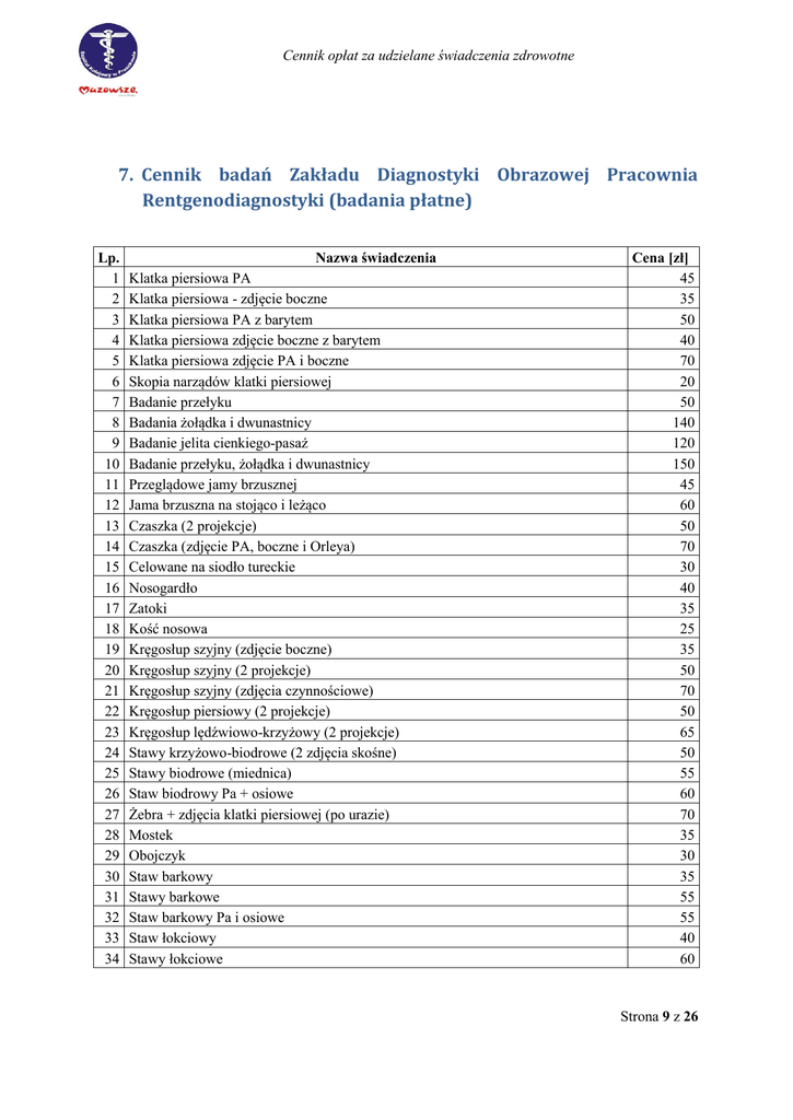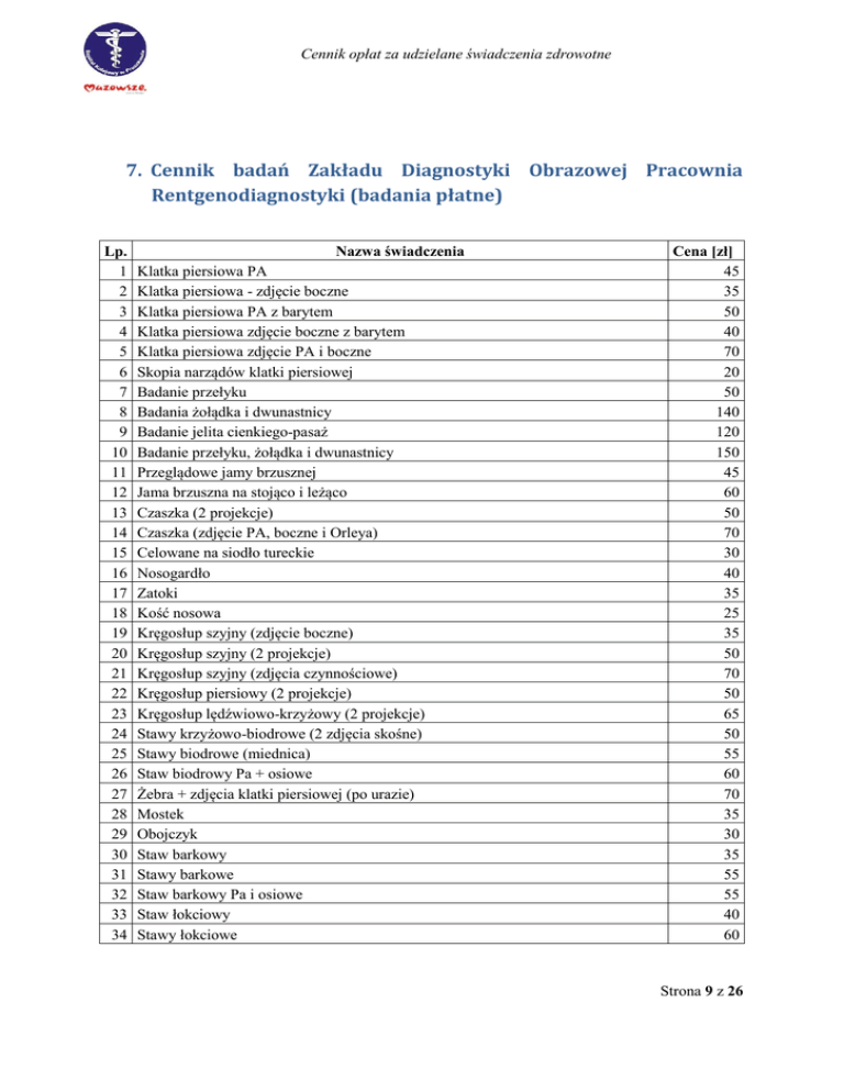 7. Cennik badań Zakładu Diagnostyki Obrazowej Pracownia