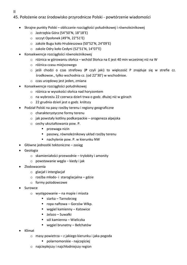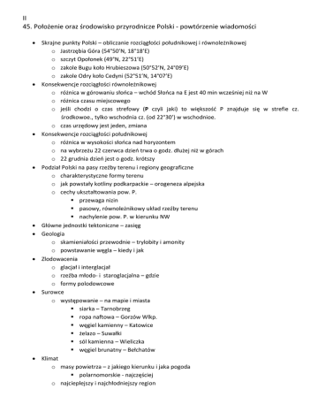 II 45. Położenie oraz środowisko przyrodnicze Polski ‐ powtórzenie wiadomości Skrajne punkty Polski – obliczanie rozciągłości południkowej i równoleżnikowej o Jastrzębia Góra (54°50’N, 18°18’E) o szczyt Opołonek (49°N, 22°51’E) o zakole Bugu koło Hrubieszowa (50°52’N, 24°09’E) o zakole Odry koło Cedyni (52°51’N, 14°07’E) Konsekwencje rozciągłości równoleżnikowej o różnica w górowaniu słońca – wchód Słońca na E jest 40 min wcześniej niż na W o różnica czasu miejscowego o jeśli chodzi o czas strefowy (P czyli jaki) to większość P znajduje się w strefie cz. środkowoe., tylko wschodnia cz. (od 22°30’) w wschodnioe. o czas urzędowy jest jeden, zmiana Konsekwencje rozciągłości południkowej o różnica w wysokości słońca nad horyzontem o na wybrzeżu 22 czerwca dzień trwa o godz. dłużej niż w górach o 22 grudnia dzień jest o godz. krótszy Podział Polski na pasy rzeźby terenu i regiony geograficzne o charakterystyczne formy terenu o jak powstały kotliny podkarpackie – orogeneza alpejska o cechy ukształtowania pow. P. przewaga nizin pasowy, równoleżnikowy układ rzeźby terenu nachylenie pow. P. w kierunku NW Główne jednostki tektoniczne – zasięg Geologia o skamieniałości przewodnie – trylobity i amonity o powstawanie węgla – kiedy i jak Zlodowacenia o glacjał i interglacjał o rzeźba młodo‐ i staroglacjalna – gdzie o formy polodowcowe Surowce o występowanie – na mapie i miasta siarka – Tarnobrzeg ropa naftowa – Gorzów Wlkp. węgiel kamienny – Katowice żelazo – Suwałki sól kamienna – Wieliczka węgiel brunatny – Bełchatów Klimat o masy powietrza – z jakiego kierunku i jaka pogoda polarnomorskie ‐ najczęściej o najcieplejszy i najchłodniejszy region o Obliczenia na podstawie danych, amplituda Wody i jeziora o kanały: Wieprz‐Krzna – najdłuższy, melioracja Gliwicki – transport Bydgoski – dorzecze Wisły i Odry Kanał Augustowski – dorzecze Wisły i Niemna, turystyka o jeziora – typy deltowe – Drużno morenowe – Śniardwy rynnowe – Jeziorak, Hańcza, Raduńskie, Gopło cyrkowe (po polu firnowym) – Czarny Staw Gąsiennicowy przybrzeżne – Gardno Bałtyk o ostateczna linia brzegowa – 2 tys. lat temu o średnia głębokość – ok. 52 m o najgłębsze miejsce – Głębia Landsort – 459 m o pływy ‐ niewielkie o zasolenie – ok. 7 promili – przyczyny (parowanie, rzeki, cieśniny) Gleby o charakterystyka rodzajów rędzina – żyzne, na skałach wapiennych, na wyżynach, Beskidy, Sudety mada – na osadach rzecznych, doliny rzeczne, Żuławy czarnoziem – na lessie, bogaty poziom próchniczy, b. żyzna, wsch. cz. W. Lub., S cz. W. Kieleckiej, Nizina Śląska o strefowe i astrefowe Roślinność o bór o grąd o łęg o monokultura