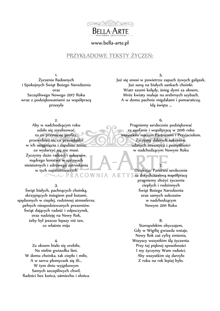 www.bella-arte.pl PRZYKŁADOWE TEKSTY ŻYCZEŃ: 1. Życzenia Radosnych i Spokojnych Świąt Bożego Narodzenia oraz Szczęśliwego Nowego 2017 Roku wraz z podziękowaniami za współpracę przesyła 5. Już się unosi w powietrzu zapach żywych gałązek, Już suną na białych sankach choinki. Wiatr szumi kolędy, śnieg dymi za oknem, Mróz kwiaty maluje na srebrnych szybach, A w domu pachnie migdałami i pomarańczą. Idą święta ... 2. Aby w nadchodzącym roku udało się zrealizować, to co przyniesie profity, przewidzieć to, co przeszkodzi w ich osiągnięciu i zapobiec temu, co wydarzyć się nie musi. Życzymy dużo radości i sukcesów, mądrego lenistwa w sprawach nieistotnych i zdrowego zatroskania w tych najistotniejszych 6. Pragniemy serdecznie podziękować za zaufanie i współpracę w 2016 roku wszystkim naszym Partnerom i Przyjaciołom. Życzymy dalszych sukcesów, udanych inwestycji i pomyślności w nadchodzącym Nowym Roku 3. Świąt białych, pachnących choinką, skrzypiących śniegiem pod butami, spędzonych w ciepłej, rodzinnej atmosferze, pełnych niespodziewanych prezentów. Świąt dających radość i odpoczynek, oraz nadzieję na Nowy Rok, żeby był jeszcze lepszy niż ten, co właśnie mija 4. Za oknem biało się zrobiło, Na niebie gwiazdka lśni, W domu choinka, tak ciepło i miło, A w sercu płomyczek się tli... W tym dniu wyjątkowym Samych szczęśliwych chwil, Radości bez końca, uśmiechu i słońca. 7. Dziękując Państwu serdecznie za dotychczasową współpracę pragniemy złożyć życzenia ciepłych i rodzinnych Świąt Bożego Narodzenia oraz samych sukcesów w nadchodzącym Nowym 2011 Roku 8. Staropolskim obyczajem, Gdy w Wigilię gwiazda wstaje, Nowy Rok zaś cyfrę zmienia, Wszyscy wszystkim ślą życzenia. Przy tej pięknej sposobności I my życzymy Wam radości, Aby wszystkim się darzyło Z roku na rok lepiej było. 9. Wszystkim Klientom, Współpracownikom i Przyjaciołom życzymy pełnych miłości i spokoju Świąt Bożego Narodzenia. Niech Nowy Rok 2011 przyniesie Państwu tę odrobinę szczęścia, która sprawi, że wszystkie podjęte działania zakończą się sukcesem 10. Jest taki Dzień, gdy jesteśmy wszyscy razem, Dzień piękny, szczęśliwy, spokojny, W którym Niebo Ziemi, Niebu Ziemia, Wszyscy wszystkim ślą życzenia... Wyjątkowych, Radosnych Świąt Bożego Narodzenia 11. Życzenia radosnych Świąt Bożego Narodzenia, odpoczynku w rodzinnym gronie oraz pasma sukcesów i spełnienia najskrytszych marzeń w nadchodzącym Nowym Roku 12. Gdy przyjdą Święta w srebrnej bieli, gdy Stary Rok w Nowy się zamieni, przyjmij gorące me życzenia, niech się Ci spełnią wszystkie marzenia. Najpiękniejszych Świąt Bożego Narodzenia 13. Na nadchodzące Święta Bożego Narodzenia, składamy najserdeczniejsze życzenia zdrowia i wszelkiej pomyślności, wiele miłości w życiu osobistym. Niech ten radosny dzień Narodzin Pana przyniesie nam Wszystkim pokój i nadzieję na Nowy Rok 2017 14. Radosnych i spokojnych, pełnych ciepła i nadziei Świąt Bożego Narodzenia, wszelkiej pomyślności, osiągnięcia sukcesów, cierpliwości i wytrwałości w realizacji planów oraz dalszej owocnej współpracy w nadchodzącym Nowym 2017 Roku. 15. Gdy nadejdą Święta, niech nadzieja i radość zastukają do Waszych drzwi, a Nowy Rok przyniesie pomyślność i szczęście każdego dnia. Radosnych Świąt Bożego Narodzenia oraz pomyślności w Nowym Roku wraz z podziękowaniami za dotychczasową współpracę przesyła