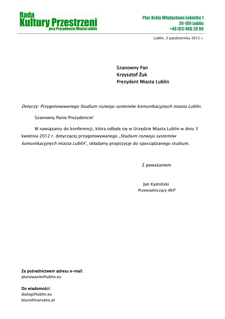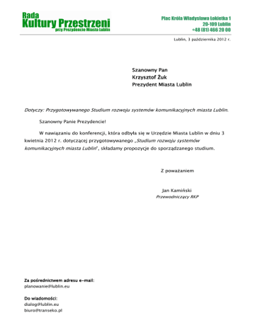 Plac Króla Władysława Łokietka 1 20-109 Lublin +48 (81) 466 20 00 Lublin, 3 października 2012 r. Szanowny Pan Krzysztof śuk Prezydent Miasta Lublin Dotyczy: Przygotowywanego Studium rozwoju systemów komunikacyjnych miasta Lublin. Szanowny Panie Prezydencie! W nawiązaniu do konferencji, która odbyła się w Urzędzie Miasta Lublin w dniu 3 kwietnia 2012 r. dotyczącej przygotowywanego „Studium rozwoju systemów komunikacyjnych miasta Lublin”, składamy propozycje do sporządzanego studium. Z powaŜaniem Jan Kamiński Przewodniczący RKP Za pośrednictwem adresu ee-mail: [email protected] Do wiadomości: [email protected] [email protected] Propozycje Rady Kultury Przestrzeni do opracowywanego Studium rozwoju systemów komunikacyjnych miasta Lublin Lublin, październik 2012 Propozycja 1 – zmiana kwalifikacji układu drogowego Rada Kultury Przestrzeni wnosi przede wszystkim o przeanalizowanie moŜliwości zmian w kwalifikacji układu głównych dróg Lublina, wynikających z budowy obwodnicy. ObniŜenie ich kategorii moŜe pozwolić na wprowadzenie rozwiązań atrakcyjniejszych przestrzennie (aleje, przyuliczne szpalery drzew) i lepszych z punktu widzenia społecznej dostępności przestrzeni ulic. W szczególności dotyczy to ciągu Alei Tysiąclecia (zwłaszcza w sąsiedztwie Podzamcza i Zamku Lubelskiego), Alei Solidarności i Alei Witosa oraz Alei Unii Lubelskiej i projektowanej Trasy Zielonej, ale takŜe Alei Kraśnickiej i Alei Warszawskiej. Obecna ranga tych tras tworzy z konieczności bariery przestrzenne rozbijające integralność tkanki miejskiej i powiązania pomiędzy dzielnicami miasta. ObniŜenie klasy tych dróg umoŜliwi ich włączenie w obszar przestrzeni społecznych i przywrócenie im formy wynikającej ze słowa “ALEJA”, jako reprezentacyjnej drogi, której charakter definiują towarzyszące jej szpalery drzew oraz moŜliwość połączenia róŜnych form ruchu (kołowego i pieszego). Propozycja 2 – ciąg ulicy 11-go maja od Mostu Lutosławskiego Lutosławskiego do Placu Dworcowego Zwracamy uwagę na potrzebę objęcia analizami transportowymi południowej części centrum Lublina w rejonie Dworca PKP i dzielnicy Piaski. Piaski Wobec planowanych inwestycji: centrum komunikacyjnego, otwarcia lotniska, nowych inwestycji drogowych, ta część miasta nabierze szczególnego znaczenia. Zapewnienia będzie wymagać dogodny dojazd do tego rejonu, w szczególności komunikacją publiczną. Ponadto rejon ten obecnie przemianom, m.in. powolnej degradacji podlega ulica 1-go Maja z powodu zamknięcia dla ruchu. Przestaje ona pełnić rolę głównej ulicy tej dzielnicy. Brak komunikacji publicznej oraz niekorzystna lokalizacja przystanków zniechęca do korzystania z tej ulicy jako ulicy handlowej. Degradacji uległ takŜe Plac Bychawski, Bychawski poprzez zajęcie większości placu przez wielki węzeł drogowy. Przebudowa miała na celu jedynie zwiększenie przepustowości w ruchu samochodów. Po przebudowie w niektórych miejscach dla pieszych pozostawiono ok. 1,5m chodnika, gdy w porównaniu auta mają do dyspozycji 3 pasy ruchu w kaŜdą stronę! Ponadto placem wciąŜ prowadzi się ruch tranzytowy, pomimo otworzenia dla ruchu ulicy Dywizjonu 303, która moŜe być obwodnicą śródmiejską. Dodatkowo sytuację komplikuje fakt istnienia przed samym placem wiaduktu (wąskiego gardła), co jest nieproporcjonalne do skali połoŜonego obok skrzyŜowania. W związku z powyŜszym postulujemy przeanalizowanie następujących propozycji: - Zmniejszenie powierzchni układu drogowego w rejonie Placu Bychawskiego, likwidacja części pasów ruchu, powiększenie przestrzeni publicznej dostępnej dla pieszych. Rozwiązanie to poprawi atrakcyjność przestrzeni i będzie zachęcać do nowych inwestycji w tym rejonie, które powinny uzupełnić ubytki w tkance miejskiej. - Kompleksowa rewitalizacja obu ślepych części ulicy 1-go Maja, w celu stworzenia reprezentacyjnej ulicy miejskiej będącej częścią ciągu prowadzącego od Dworca PKP/PKS do Centrum miasta. W szczególności poprzez: otworzenie ulicy dla komunikacji zbiorowej i rowerów, (wraz z odpowiednimi śluzami w rejonie Ronda Lubelskiego Lipca, Placu Bychawskiego i Placu Dworcowego i innymi rozwiązaniami promującymi ruch rowerowy i komunikację publiczną), odtworzenie szerokich chodników ze szpalerami drzew, wyznaczenie równoległych miejsc parkingowych wyłącznie na ulicy, nadanie priorytetu dla komunikacji zbiorowej na Placu Bychawskim. Celem jest stworzenie nowego atrakcyjnego miejsca witającego podróŜnych (dworce PKP i PKS). NaleŜy tutaj zaznaczyć, Ŝe otworzenie północnej części 1 maja dla ruchu komunikacji miejskiej i rowerzystów w kierunku Centrum jest juŜ teraz moŜliwe przy niewielkim nakładzie finansowym. Rozwiązanie to dodatkowo rozwiąŜe problem dojazdu do Dworca PKP po wybudowaniu estakady na Trasie Zielonej. (ewentualnie moŜna przewidzieć skierowanie części ruchu komunikacji zbiorowej przez ulicę Pocztową). - Kompleksowa rewitalizacja Placu Dworcowego obejmująca stworzenie reprezentacyjnej przestrzeni witającej podróŜnych, znaczne zmniejszenie powierzchni przeznaczonej dla pojazdów i przeznaczenie jej dla pieszych i rowerzystów, zaplanowanie terenu z zielenią niską i wysoką przeznaczonego dla odpoczynku podróŜnych, dworca/węzła komunikacji miejskiej przeznaczonego dla autobusów i trolejbusów, bezpiecznego parkingu/przechowalni dla rowerów wraz z wypoŜyczalną, usunięcie parkingów z przestrzeni placu, zaplanowanie miejsc dla postoju taksówek oraz miejsca do krótkiego zatrzymania. Ponadto postulujemy zwiększenie dostępności tunelu pod dworcem, tak aby był on lepiej przystosowany dla osób niepełnosprawnych. - Przeprojektowanie Ronda Lubelskiego Lipca wraz z otoczeniem, tak by stało się ono reprezentacyjnym placem, powiązanym z odrestaurowanym Mostem Lutosławskiego. Proponujemy przeanalizowanie moŜliwości lokalizacji przystanków autobuso