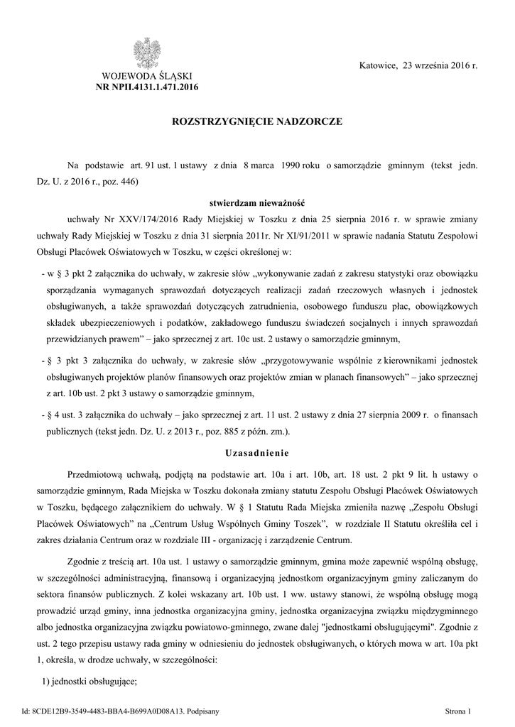 Katowice, 23 września 2016 r. WOJEWODA ŚLĄSKI NR NPII.4131.1.471.2016 ROZSTRZYGNIĘCIE NADZORCZE Na podstawie art. 91 ust. 1 ustawy z dnia 8 marca 1990 roku o samorządzie gminnym (tekst jedn. Dz. U. z 2016 r., poz. 446) stwierdzam nieważność uchwały Nr XXV/174/2016 Rady Miejskiej w Toszku z dnia 25 sierpnia 2016 r. w sprawie zmiany uchwały Rady Miejskiej w Toszku z dnia 31 sierpnia 2011r. Nr XI/91/2011 w sprawie nadania Statutu Zespołowi Obsługi Placówek Oświatowych w Toszku, w części określonej w: - w § 3 pkt 2 załącznika do uchwały, w zakresie słów „wykonywanie zadań z zakresu statystyki oraz obowiązku sporządzania wymaganych sprawozdań dotyczących realizacji zadań rzeczowych własnych i jednostek obsługiwanych, a także sprawozdań dotyczących zatrudnienia, osobowego funduszu płac, obowiązkowych składek ubezpieczeniowych i podatków, zakładowego funduszu świadczeń socjalnych i innych sprawozdań przewidzianych prawem” – jako sprzecznej z art. 10c ust. 2 ustawy o samorządzie gminnym, - § 3 pkt 3 załącznika do uchwały, w zakresie słów „przygotowywanie wspólnie z kierownikami jednostek obsługiwanych projektów planów finansowych oraz projektów zmian w planach finansowych” – jako sprzecznej z art. 10b ust. 2 pkt 3 ustawy o samorządzie gminnym, - § 4 ust. 3 załącznika do uchwały – jako sprzecznej z art. 11 ust. 2 ustawy z dnia 27 sierpnia 2009 r. o finansach publicznych (tekst jedn. Dz. U. z 2013 r., poz. 885 z późn. zm.). Uzasadnienie Przedmiotową uchwałą, podjętą na podstawie art. 10a i art. 10b, art. 18 ust. 2 pkt 9 lit. h ustawy o samorządzie gminnym, Rada Miejska w Toszku dokonała zmiany statutu Zespołu Obsługi Placówek Oświatowych w Toszku, będącego załącznikiem do uchwały. W § 1 Statutu Rada Miejska zmieniła nazwę „Zespołu Obsługi Placówek Oświatowych” na „Centrum Usług Wspólnych Gminy Toszek”, w rozdziale II Statutu określiła cel i zakres działania Centrum oraz w rozdziale III - organizację i zarządzenie Centrum. Zgodnie z treścią art. 10a ust. 1 ustawy o samorządzie gminnym, gmina może zapewnić wspólną obsługę, w szczególności administracyjną, finansową i organizacyjną jednostkom organizacyjnym gminy zaliczanym do sektora finansów publicznych. Z kolei wskazany art. 10b ust. 1 ww. ustawy stanowi, że wspólną obsługę mogą prowadzić urząd gminy, inna jednostka organizacyjna gminy, jednostka organizacyjna związku międzygminnego albo jednostka organizacyjna związku powiatowo-gminnego, zwane dalej "jednostkami obsługującymi". Zgodnie z ust. 2 tego przepisu ustawy rada gminy w odniesieniu do jednostek obsługiwanych, o których mowa w art. 10a pkt 1, określa, w drodze uchwały, w szczególności: 1) jednostki obsługujące; Id: 8CDE12B9-3549-4483-BBA4-B699A0D08A13. Podpisany Strona 1 2) jednostki obsługiwane; 3) zakres obowiązków powierzonych jednostkom obsługującym w ramach wspólnej obsługi. W art. 10c ust. 1 ustawy określono, że zakres wspólnej obsługi nie może obejmować kompetencji kierowników jednostek zaliczanych do sektora finansów publicznych do dysponowania środkami publicznymi oraz zaciągania zobowiązań, a także sporządzania i zatwierdzania planu finansowego oraz przeniesień wydatków w tym planie. Zaś zgodnie z ust. 2 tego przepisu w przypadku powierzenia obowiązków z zakresu rachunkowości i sprawozdawczości jednostek obsługiwanych, o których mowa w art. 10a pkt 1 i 2, są one przekazywane w całości. Należy zauważyć, że w przypadku tzw. przekształcenia zespołów obsługi w centra usług wspólnych zmiana dotyczy tylko zmiany zakresu ich działalności na zasadach wynikających z ustawy ustrojowej. Gmina może wskazać już istniejący zespół obsługi ekonomiczno-administracyjnej jako jednostkę obsługującą dla jednostek oświatowych oraz dopuszczalne jest dostosowanie prawno-organizacyjne zespołu do nowych przepisów. Aktem określającym ustrój jednostki, w tym także gminnej jednostki budżetowej jest statut, który w nauce określa się jako „zbiór samoistnych przepisów powstających z delegacji ustawowej, a regulujący zadania, strukturę wreszcie sposób działania instytucji lub organizacji”. Statut winien zawierać zatem regulacje szczegółowo związane z przedmiotem działania tej jednostki budżetowej, jej struktury organizacyjnej i uregulowań dotyczących gospodarki finansowej. Stosownie do art. 11 ust. 2 ustawy z dnia 27 sierpnia 2009 r. o finansach publicznych (tekst jedn. Dz.U. z 2013, poz. 885 z późn. zm.), jednostka budżetowa działa na podstawie statutu określającego w szczególności jej nazwę, siedzibę i przedmiot działania. Katalog regulacji, które winny znaleźć odzwierciedlenie w statucie jest katalogiem otwartym. To poprzez zmianę statutu dokonuje się zmiany nazwy jednostki oraz zakresu jej działania. Zatem Rada Miejska w Toszku przedmiotową uchwałą dokonała dostosowania prawno-organizacyjnego Zespołu Obsługi Placówek Oświatowych do nowych przepisów. Jednakże organ nadzoru, po dokonaniu badania legalności przedmiotowej uchwały stwierdził, że narusza ona obowiązujące przepisy prawa. W opinii organu nadzoru zadania Centrum Usług Wspólnych, określone w § 3 pkt 2 Statutu, w zakresie słów „wykonywanie zadań z zakresu statystyki oraz obowiązku sporządzania wymaganych sprawozdań dotyczących realizacji zadań rzeczowych własnych i jednostek obsługiwanych, a także sprawozdań dotyczących zatrudnienia, osobowego funduszu płac, obowiązkowych składek ubezpieczeniowych i podatków, zakładowego funduszu świadczeń socjalnych i innych sprawozdań przewidzianych prawem” są niezgodne z art. 10c ust. 2 ustawy o samorządzie gminnym. Zgodnie bowiem z przywołanym przepisem w przypadku powierzenia obowiązków z zakresu rachunkowości i sprawozdawczości jednostek obsługiwanych są one przekazywane w całości. Zatem nie istnieje możliwo