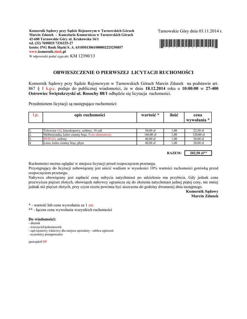 Tarnowskie Góry dnia 03.11.2014 r. Komornik Sądowy przy Sądzie Rejonowym w Tarnowskich Górach Marcin Zdunek - Kancelaria Komornicza w Tarnowskich Górach 42-600 Tarnowskie Góry ul. Krakowska 16/1 tel. (32) 7690825 7336225-27 konto: ING Bank Śląski S. A. 63105013861000002225250857 www.komornik.slask.pl W odpowiedzi podać sygn.akt: KM *1014110301155* 12390/13 OBWIESZCZENIE O PIERWSZEJ LICYTACJI RUCHOMOŚCI Komornik Sądowy przy Sądzie Rejonowym w Tarnowskich Górach Marcin Zdunek na podstawie art. 867 § 1 k.p.c. podaje do publicznej wiadomości, że w dniu 18.12.2014 roku o 10:00:00 w 27-400 Ostrowiec Świętokrzyski ul. Rosochy 88/1 odbędzie się licytacja ruchomości. Przedmiotem licytacji są następujące ruchomości: opis ruchomości l.p. 1. 2. 3. 4. Telewizor LG, kineskopowy, srebrny, 19 cali Meblościanka, kolor ciemny brąz, 5-cio elementowy DVD LG, srebrny Ława, kolor ciemny brąz, płyta wartość * ilość cena wywołania * 30,00 zł 160,00 zł 40,00 zł 40,00 zł 1,00 1,00 1,00 1,00 22,50 zł 120,00 zł 30,00 zł 30,00 zł RAZEM: 202,50 zł** Ruchomości można oglądać w miejscu licytacji przed rozpoczęciem przetargu. Przystępujący do licytacji zobowiązany jest uiścić wadium w wysokości 10% wartości ruchomości gotówką przed rozpoczęciem przetargu. Nabywca obowiązany jest zapłacić cenę nabycia natychmiast po udzieleniu mu przybicia. Gdy jednak cena przewyższa pięćset złotych, obowiązek nabywcy ogranicza się do złożenia natychmiast jednej piątej ceny, nie mniej jednak niż pięćset złotych, przy czym reszta powinna być uiszczona do godziny dwunastej dnia następnego. Komornik Sądowy Marcin Zdunek * - wartość lub cena wywołania za 1 szt. ** - łączna cena wywołania wszystkich ruchomości Do wiadomości: - dłużnik - wierzyciel/pełnomocnik - sąd rejonowy właściwy dla miejsca sprzedaży - tablica ogłoszeń - uczestnicy postępowania sporządził DP