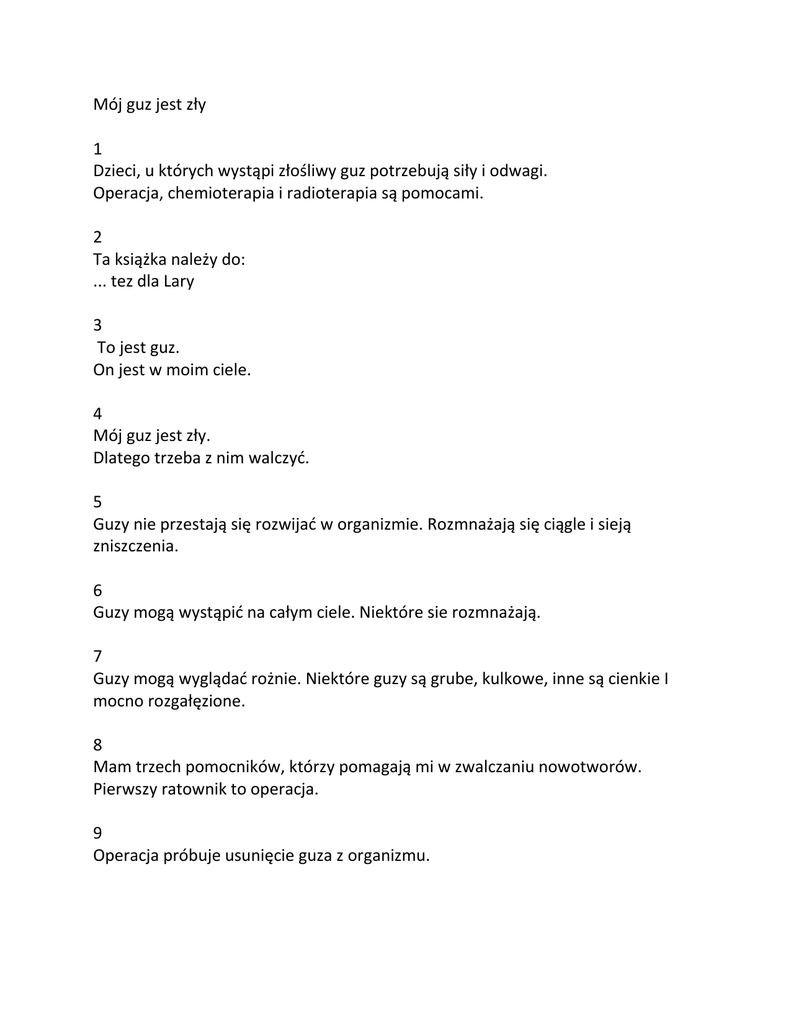 Mój guz jest zły 1 Dzieci, u których wystąpi złośliwy guz potrzebują siły i odwagi. Operacja, chemioterapia i radioterapia są pomocami. 2 Ta książka należy do: ... tez dla Lary 3 To jest guz. On jest w moim ciele. 4 Mój guz jest zły. Dlatego trzeba z nim walczyd. 5 Guzy nie przestają się rozwijad w organizmie. Rozmnażają się ciągle i sieją zniszczenia. 6 Guzy mogą wystąpid na całym ciele. Niektóre sie rozmnażają. 7 Guzy mogą wyglądad rożnie. Niektóre guzy są grube, kulkowe, inne są cienkie I mocno rozgałęzione. 8 Mam trzech pomocników, którzy pomagają mi w zwalczaniu nowotworów. Pierwszy ratownik to operacja. 9 Operacja próbuje usunięcie guza z organizmu. 10 Drugi pomocnik to chemioterapia. 11 Chemioterapia rozkłada i niszczy guz lekami. 12 Trzeci pomocnik to napromieniowanie. 13 Promieniowanie niszczy guz promieniami radioaktywnymi. 14 Jeśli wszyscy pomagają, to guz może zostad pokonany. Tekst: Claus Maywald