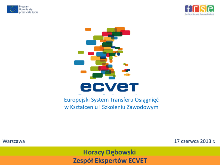 Europejski System Transferu Osiągnięć w Kształceniu i Szkoleniu Zawodowym Warszawa 17 czerwca 2013 r. Horacy Dębowski Zespół Ekspertów ECVET Plan prezentacji 1. Zmiany na rynku pracy – kontekst prac nad systemem ECVET oraz Europejską Ramą Kwalifikacji 2. Krótka historia prac nad ECVET 3. ECVET – założenia (specyfikacje techniczne) 4. W kierunku ECVET - zmiany w polskim systemie kształcenia i szkolenia zawodowego 2 Zmiany na rynku pracy – wzrost znaczenia kapitału ludzkiego • Rozwój technologii i zmiany na rynku produktu • Globalizacja • Zmiany demograficzne 3 Niedopasowanie umiejętności pracowników do wymagań pracodawców • Pomimo korzyści z wysokiej jakości kapitału ludzkiego (poziom jednostki, przedsiębiorstwa, gospodarki) – skala inwestycji w kapitał ludzki poniżej społecznego optimum. • Pomimo wysokiego poziomu bezrobocia (nie tylko) w Europie, wielu przedsiębiorców stwierdza, że ma problemy ze znalezieniem pracowników o odpowiednich umiejętnościach • Raport Manpower: 34 proc. pracodawców ma taki problem • Polska (wg. różnych badań ok. 40 proc.) 4 Bariery w uczeniu się (inwestowaniu w kapitał ludzki) • Finansowe • Niefinansowe (o charakterze informacyjnym lub wynikających z niedostosowania oferty edukacyjnej do potrzeb osób uczących się) – kompetencje pracowników są trudne do zweryfikowania przez pracodawców – nawet jeśli dane umiejętności są rozpoznawane na rynku pracy a ich zdobycie przynosi wymierne korzyści, to nie zawsze jest to widoczne dla potencjalnych uczestników szkoleń – uczestnikom szkoleń może być trudno znaleźć instytucję edukacyjną gwarantującą wysoki poziom usług lub wybrać właściwy dla siebie program szkoleniowy – niedostateczną „łączność” pomiędzy sektorami edukacji zawodowej, wyższej oraz pozaformalnej, a także niewielką elastyczność wewnątrz tych sektorów - Wydłuża i utrudnia to dochodzenie przez uczących się do kwalifikacji - osoby chcące uzyskać daną kwalifikację muszą powtarzać ten sam (lub podobny) program nauczania oraz często potwierdzać już osiągnięte efekty uczenia się, natomiast rzadko kiedy mają możliwość na potwierdzenie kompetencji uzyskanych w toku edukacji pozaformalnej lub w miejscu pracy, choć niejednokrotnie efekty uzyskane w ten sposób są bardziej wartościowe od uzyskanych w toku nauki szkolnej. 5 Znaczenie systemu kwalifikacji jako narzędzia polityki na rzecz uczenia się przez całe życie • System kwalifikacji jako instrument polityki na rzecz uczenia się przez całe życie • Rama kwalifikacji jako narzędzie integrujące system kwalifikacji – rekomendacje OCED, ILO. 130 krajów na świecie wdrożyło lub pracuje nad wdrożeniem ram kwalifikacji (m.in. Francja, UK, Australia) • OECD – systemy przenoszenia i akumulowania osiągnięć jeden z najsilniejszych mechanizmów systemy kwalifikacji wspierających inwestowanie w kapitał ludzki • Wdrożenie ram kwalifikacji rekomenduje UE – Zalecenie PE i Rady w sprawie ERK • Wdrożenie systemu ECVET rekomenduje UE Zalecenie PE i Rady w sprawie ECVET 6 Prace nad systemem ECVET i Europejską Ramą Kwalifikacji • Deklaracja kopenhaska (2002 r.) Pierwszy dokument UE, w którym podkreśla się potrzebę rozwijania na poziomie europejskim ram kwalifikacji (ram odniesienia) oraz systemu akumulowania i przenoszenia osiągnięć w kształceniu i szkoleniu zawodowym The Ministers recommend: (…) investigating how transparency, comparability, transferability and recognition of competences and/or qualifications, between different countries and at different levels, could be promoted by developing reference levels, common principles for certification, and common measures, including a credit transfer system for vocational education and training. uwaga dot. tłumaczenia 7 Prace nad ECVET, cd. • Utworzenie grupy roboczej ds. ECVET (technical working group on ECVET) 2002 rok • Utworzenie grupy roboczej ds. ERK - 2004 rok • Pierwsza wersja technicznych specyfikacji ECVET – czerwiec 2005 roku • Publikacja ERK (pierwszej wersji do konsultacji) – lipiec 2005 roku dwa miesiące wcześniej przyjęcie Framework of Qualifications for the European Higher Education Area – komunikat z Bergen. • Zalecenie Parlamentu Europejskiego i Rady w sprawie ERK dla uczenia się przez całe życie – 2008 rok • Zalecenie PE i Rady w sprawie ECVET – 2009 rok • Zalecenie PE i Rady w sprawie walidacji – 2012 rok 8 Zalecenie PE i Rady z dnia 18 czerwca 2009 r. w sprawie ustanowienia europejskiego systemu transferu osiągnięć w kształceniu i szkoleniu zawodowym (ECVET) przedstawia ECVET w perspektywie polityk UE, w tym europejskich ram kwalifikacji określa cele ECVET definiuje najważniejsze pojęcia przedstawia zasady stosowania ECVET i specyfikacje techniczne Cele ECVET Wspieranie mobilności edukacyjnej i zawodowej Wspieranie inwestowania w kapitał ludzki (uczenie się przez całe życie) Cele ECVET, cd. przenoszenie i akumulowanie osiągnięć (ocenionych efektów uczenia się) w celu łatwiejszego uzyskania określonej kwalifikacji, walidację (uznawanie) efektów uczenia się osiąganych w ramach pozaformalnego i nieformalnego uczenia się, tworzenie elastycznych i zindywidualizowanych ścieżek kształcenia, zrozumienie efektów uczenia się, które są potwierdzane przez poszczególne kwalifikacje, zrozumienie systemów kwalifikacji w obszarze edukacji zawodowej w krajach członkowskich UE. Kluczowe pojęcia: osiągnięcia Osiągnięcia (ang. credits) - zbiór efektów uczenia się uzyskanych przez osobę uczącą się, które zostały ocenione i mogą być akumulowane do celów uzyskania kwalifikacji lub transferowane do innych programów kształcenia/uczenia się lub do innych kwalifikacji. Osiągnięcia mogą odpowiadać efektom uczenia się zawartym w jednej lub w kilku jednostkach efektów uczenia się. Mogą także odpowiadać mniejszym częścio