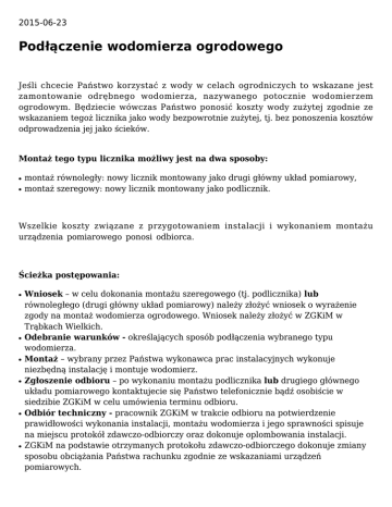 2015-06-23 Podłączenie wodomierza ogrodowego Jeśli chcecie Państwo korzystać z wody w celach ogrodniczych to wskazane jest zamontowanie odrębnego wodomierza, nazywanego potocznie wodomierzem ogrodowym. Będziecie wówczas Państwo ponosić koszty wody zużytej zgodnie ze wskazaniem tegoż licznika jako wody bezpowrotnie zużytej, tj. bez ponoszenia kosztów odprowadzenia jej jako ścieków. Montaż tego typu licznika możliwy jest na dwa sposoby: ● ● montaż równoległy: nowy licznik montowany jako drugi główny układ pomiarowy, montaż szeregowy: nowy licznik montowany jako podlicznik. Wszelkie koszty związane z przygotowaniem instalacji i wykonaniem montażu urządzenia pomiarowego ponosi odbiorca. Ścieżka postępowania: ● ● ● ● ● ● Wniosek – w celu dokonania montażu szeregowego (tj. podlicznika) lub równoległego (drugi główny układ pomiarowy) należy złożyć wniosek o wyrażenie zgody na montaż wodomierza ogrodowego. Wniosek należy złożyć w ZGKiM w Trąbkach Wielkich. Odebranie warunków - określających sposób podłączenia wybranego typu wodomierza. Montaż – wybrany przez Państwa wykonawca prac instalacyjnych wykonuje niezbędną instalację i montuje wodomierz. Zgłoszenie odbioru – po wykonaniu montażu podlicznika lub drugiego głównego układu pomiarowego kontaktujecie się Państwo telefonicznie bądź osobiście w siedzibie ZGKiM w celu umówienia terminu odbioru. Odbiór techniczny - pracownik ZGKiM w trakcie odbioru na potwierdzenie prawidłowości wykonania instalacji, montażu wodomierza i jego sprawności spisuje na miejscu protokół zdawczo-odbiorczy oraz dokonuje oplombowania instalacji. ZGKiM na podstawie otrzymanych protokołu zdawczo-odbiorczego dokonuje zmiany sposobu obciążania Państwa rachunku zgodnie ze wskazaniami urządzeń pomiarowych. Podstawowe warunki techniczne montażu wodomierza „ogrodowego”: Wariant I – montaż równoległy (nowy licznik montowany jako drugi główny układ pomiarowy): ● ● podejście należy włączyć przed głównym zaworem odcinającym za pomocą systemy rur z jakiego wykonane jest przyłącze wodociągowe (rury i złączki stalowe ocynkowane, rury PE złącza elektrooporowe itp.). Wodomierz „ogrodowy” należy zlokalizować w tym samym pomieszczeniu gdzie jest zlokalizowany wodomierz główny, wodomierz należy zamontować w kompletnym zestawie wodomierzowym składającym się z dwóch zaworów kulowych i zaworu zwrotnego antyskażeniowego (długość zabudowy wodomierza między śrubunkami 130 mm). Za nowym odgałęzieniem mogą być podłączone tylko i wyłączenie zawory czerpalne zlokalizowane na zewnątrz budynku, z których woda nie trafia do systemu kanalizacyjnego. Wariant II – montaż szeregowy (tzw. podlicznik): ● ● podlicznik montuje się na wewnętrznej instalacji wodociągowej za zaworem antyskażeniowym, a za podlicznikiem nie może znajdować się żaden punkt poboru z możliwością odprowadzanie wody do systemu kanalizacji sanitarnej. Za podlicznikiem mogą być podłączone tylko i wyłączenie zawory czerpalne zlokalizowane na zewnątrz budynku, z których woda nie trafia do systemu kanalizacyjnego, przed i za podlicznikiem należy zamontować zawory kulowe odcinające, w przypadku braku zaworu anntyskażeniowego na przyłączu wymaga się wstawienia takiego zaworu za podlicznikiem.