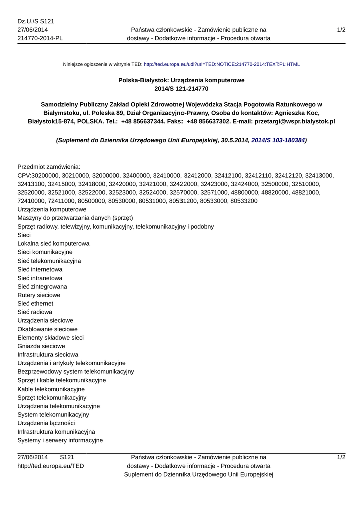 Dz.U./S S121 27/06/2014 214770-2014-PL Państwa członkowskie - Zamówienie publiczne na dostawy - Dodatkowe informacje - Procedura otwarta 1/2 Niniejsze ogłoszenie w witrynie TED: http://ted.europa.eu/udl?uri=TED:NOTICE:214770-2014:TEXT:PL:HTML Polska-Białystok: Urządzenia komputerowe 2014/S 121-214770 Samodzielny Publiczny Zakład Opieki Zdrowotnej Wojewódzka Stacja Pogotowia Ratunkowego w Białymstoku, ul. Poleska 89, Dział Organizacyjno-Prawny, Osoba do kontaktów: Agnieszka Koc, Białystok15-874, POLSKA. Tel.: +48 856637344. Faks: +48 856637302. E-mail: [email protected] (Suplement do Dziennika Urzędowego Unii Europejskiej, 30.5.2014, 2014/S 103-180384) Przedmiot zamówienia: CPV:30200000, 30210000, 32000000, 32400000, 32410000, 32412000, 32412100, 32412110, 32412120, 32413000, 32413100, 32415000, 32418000, 32420000, 32421000, 32422000, 32423000, 32424000, 32500000, 32510000, 32520000, 32521000, 32522000, 32523000, 32524000, 32570000, 32571000, 48800000, 48820000, 48821000, 72410000, 72411000, 80500000, 80530000, 80531000, 80531200, 80533000, 80533200 Urządzenia komputerowe Maszyny do przetwarzania danych (sprzęt) Sprzęt radiowy, telewizyjny, komunikacyjny, telekomunikacyjny i podobny Sieci Lokalna sieć komputerowa Sieci komunikacyjne Sieć telekomunikacyjna Sieć internetowa Sieć intranetowa Sieć zintegrowana Rutery sieciowe Sieć ethernet Sieć radiowa Urządzenia sieciowe Okablowanie sieciowe Elementy składowe sieci Gniazda sieciowe Infrastruktura sieciowa Urządzenia i artykuły telekomunikacyjne Bezprzewodowy system telekomunikacyjny Sprzęt i kable telekomunikacyjne Kable telekomunikacyjne Sprzęt telekomunikacyjny Urządzenia telekomunikacyjne System telekomunikacyjny Urządzenia łączności Infrastruktura komunikacyjna Systemy i serwery informacyjne 27/06/2014 S121 http://ted.europa.eu/TED Państwa członkowskie - Zamówienie publiczne na dostawy - Dodatkowe informacje - Procedura otwarta Suplement do Dziennika Urzędowego Unii Europejskiej 1/2 Dz.U./S S121 27/06/2014 214770-2014-PL Państwa członkowskie - Zamówienie publiczne na dostawy - Dodatkowe informacje - Procedura otwarta 2/2 Serwery Serwery sieciowe Usługi dostawców Dostawcy usług internetowych (ISP) Usługi szkoleniowe Usługi szkolenia zawodowego Usługi szkolenia przemysłowego i technicznego Usługi szkolenia technicznego Usługi zapoznawania użytkownika z obsługa komputera i usługi szkoleniowe Kursy komputerowe Zamiast: IV.3.4) Termin składania ofert lub wniosków o dopuszczenie do udziału w postępowaniu 11.7.2014 (10:00) IV.3.8) Warunki otwarcia ofert Data 11.7.2014 (10:10) Miejscowość Siedziba Zamawiającego SP ZOZ WSPR w Białymstoku. ul. Poleska 89. Powinno być: IV.3.4) Termin składania ofert lub wniosków o dopuszczenie do udziału w postępowaniu 18.7.2014 (10:00) IV.3.8) Warunki otwarcia ofert Data 18.7.2014 (10:10) Miejscowość Siedziba Zamawiającego SP ZOZ WSPR w Białymstoku. ul. Poleska 89. Inne dodatkowe informacje Informacje do poprawienia lub dodania w odpowiedniej dokumentacji przetargowej. Więcej informacji w odpowiedniej dokumentacji przetargowej. 27/06/2014 S121 http://ted.europa.eu/TED Państwa członkowskie - Zamówienie publiczne na dostawy - Dodatkowe informacje - Procedura otwarta Suplement do Dziennika Urzędowego Unii Europejskiej 2/2