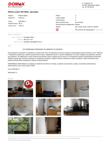 ul. Targowa 12 44-300, Wodzisław Śląski tel. 32 750-84-67 Oferta numer MS-5681, Sprzedaż Miasto: Bielsko-Biała Piętro: 3 Dzielnica: Centrum Liczba pięter: 3 Cena: 180 000 zł Liczba pokoi: 2 Stan wykończenia: do remontu Powierzchnia: 48 m2 Cena za m2: 3719 zł Pomieszczenia dodatkowe: balkon Media: gaz, prąd, woda, internet, telefon 0% prowizji od kupującego (regulamin) Agent prowadzący: Imię i nazwisko: Grzegorz Pluta Telefon: 692 427 714 Adres e-mail: [email protected] Opis: DO SPRZEDANIA MIESZKANIE DO REMONTU W CENTRUM Do sprzedania mieszkanie 2-pokojowe o powierzchni 48,4 m2 położone na trzecim piętrze trzykondygnacyjnej kamienicy na os. Mieszka I. Mieszkanie składa się z dwóch przestronnych pokoi, oddzielnej kuchni z oknem (dodatkowo w kuchni znajduje się spiżarka), łazienki, oraz balkonu. W najbliższym czasie zostaną wymienione okna w pokoju oraz w kuchni. W mieszkaniu zostały zainstalowane kaloryfery. Właśnie rozpoczęły się prace związane z ociepleniem budynku, będzie również odnowiona klatka schodowa. Układ mieszkania jest bardzo funkcjonalnie rozwiązany, pokoje nie przechodnie. DOSKONAŁA LOKALIZACJA ze względu na bliskość do Centrum miasta, w pobliżu przychodnie, szkoły, przystanki autobusowe a jednocześnie cisza i dużo zieleni wokół Cena 180.000 zł POLECAM !!!! Zdjęcia: Zamieszczone na naszej stronie oferty nieruchomości mają charakter informacyjny i nie stanowią oferty w rozumieniu prawa handlowego.